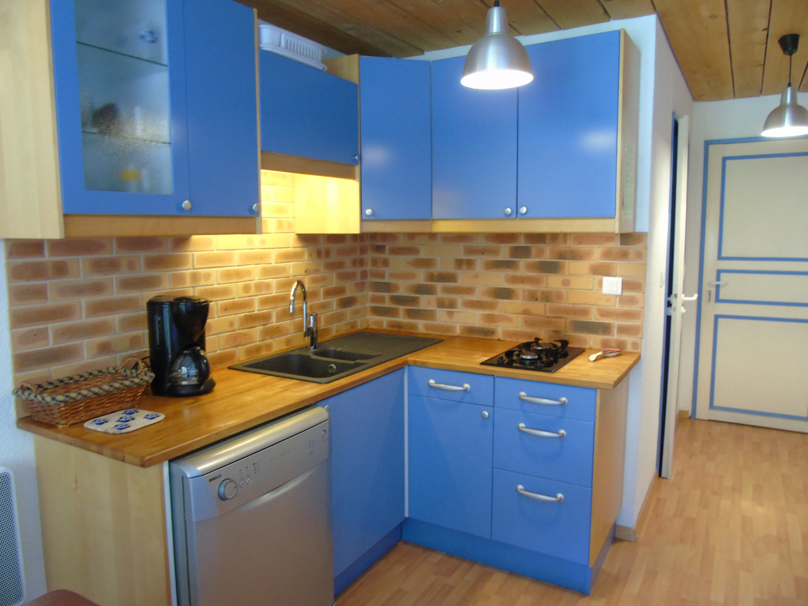 - Coin cuisine équipé : plaques gaz 2 feux, micro-ondes, réfrigérateur, congélateur, lave-vaisselle, cafetière à filtre, service à raclette, service à fondue