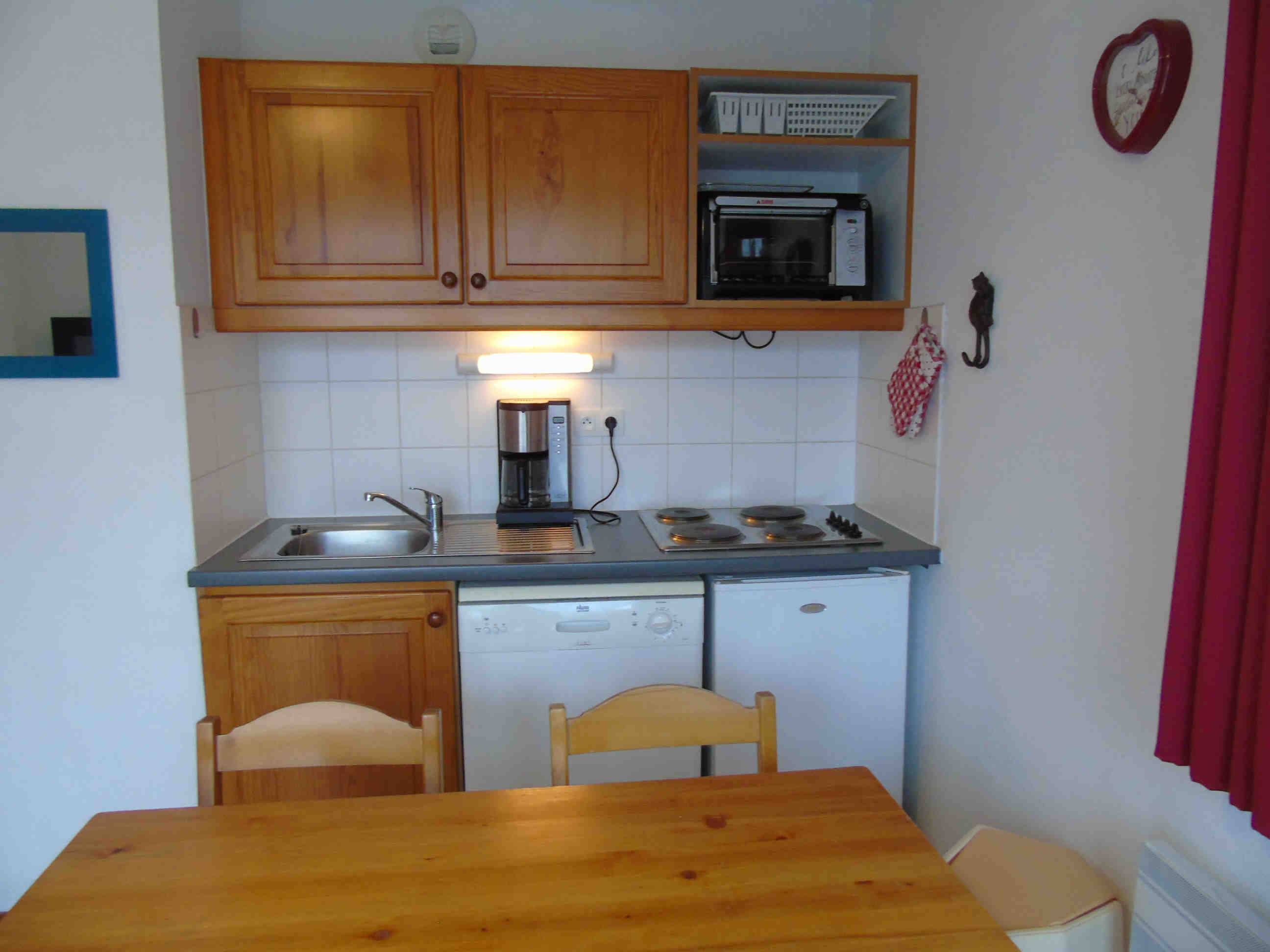 - Coin cuisine équipé : plaques électrique 4 feux, mini four, réfrigérateur, lave vaisselle, cafetière à filtre, grille pain