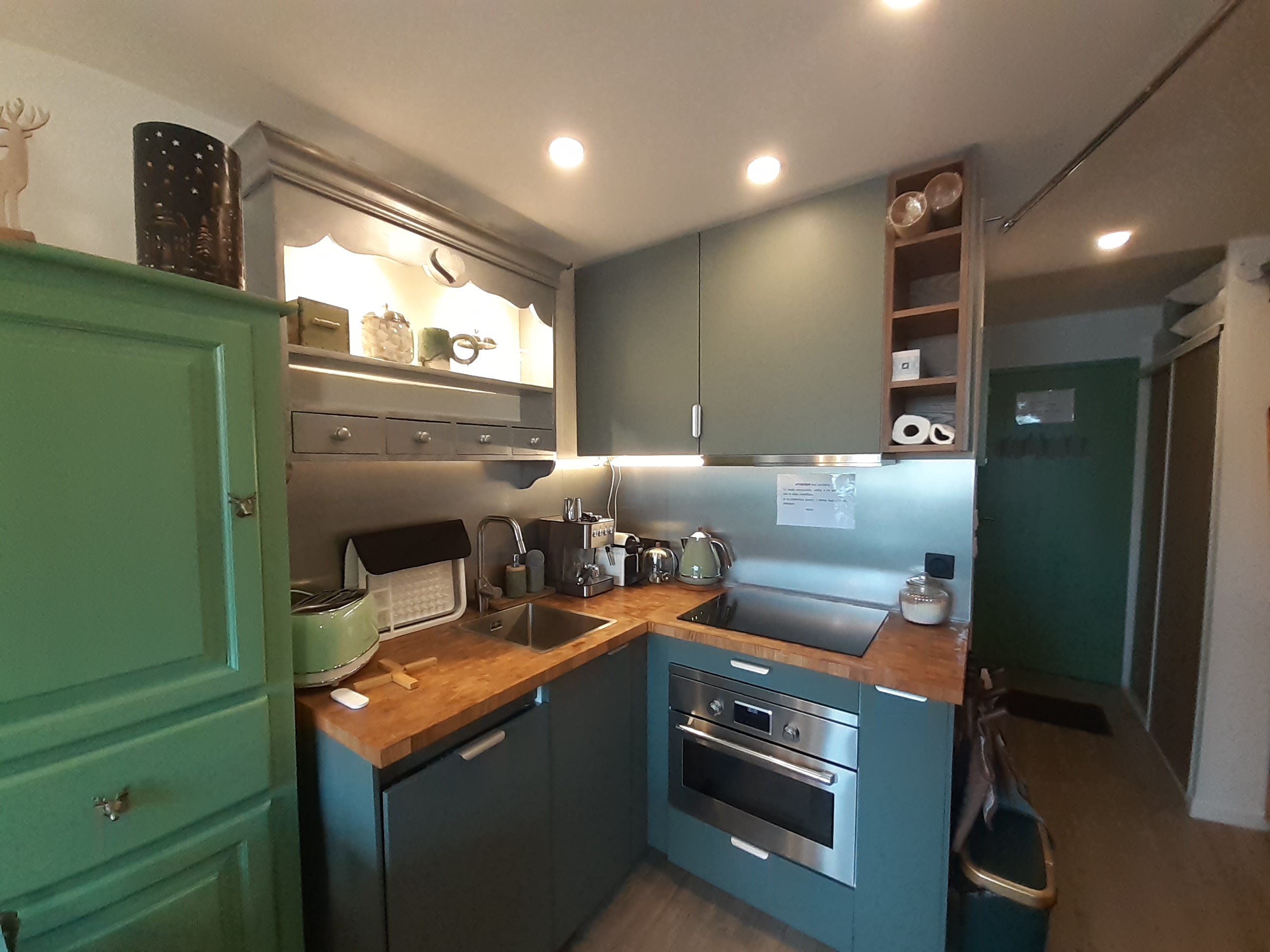 - Coin cuisine équipé : plaque induction 3 feux, hotte, four combi micro-ondes, réfrigérateur, lave-vaisselle, cafetière à filtre, cafetière Nespresso, grille-pain, bouilloire, service à raclette, blender
