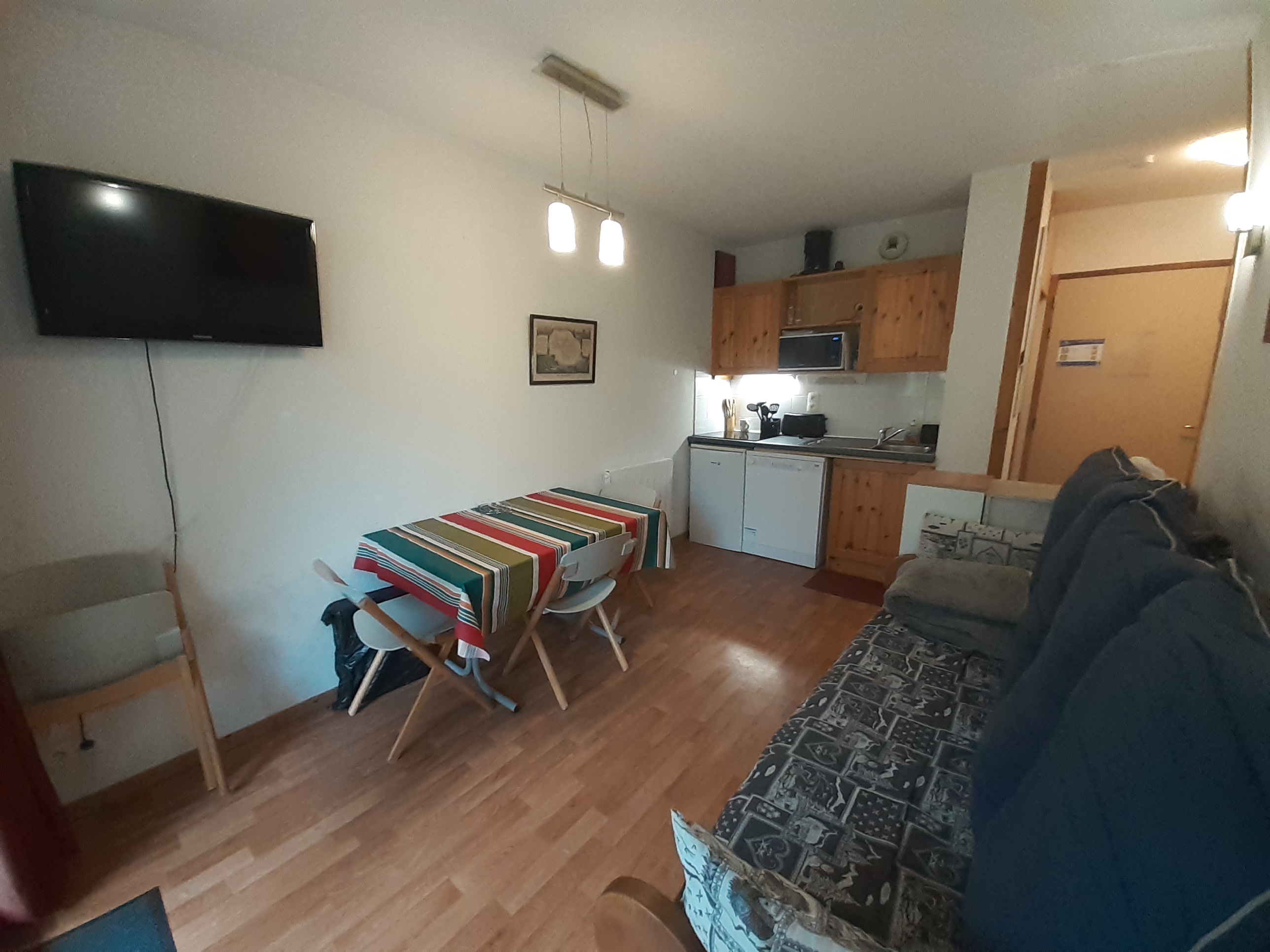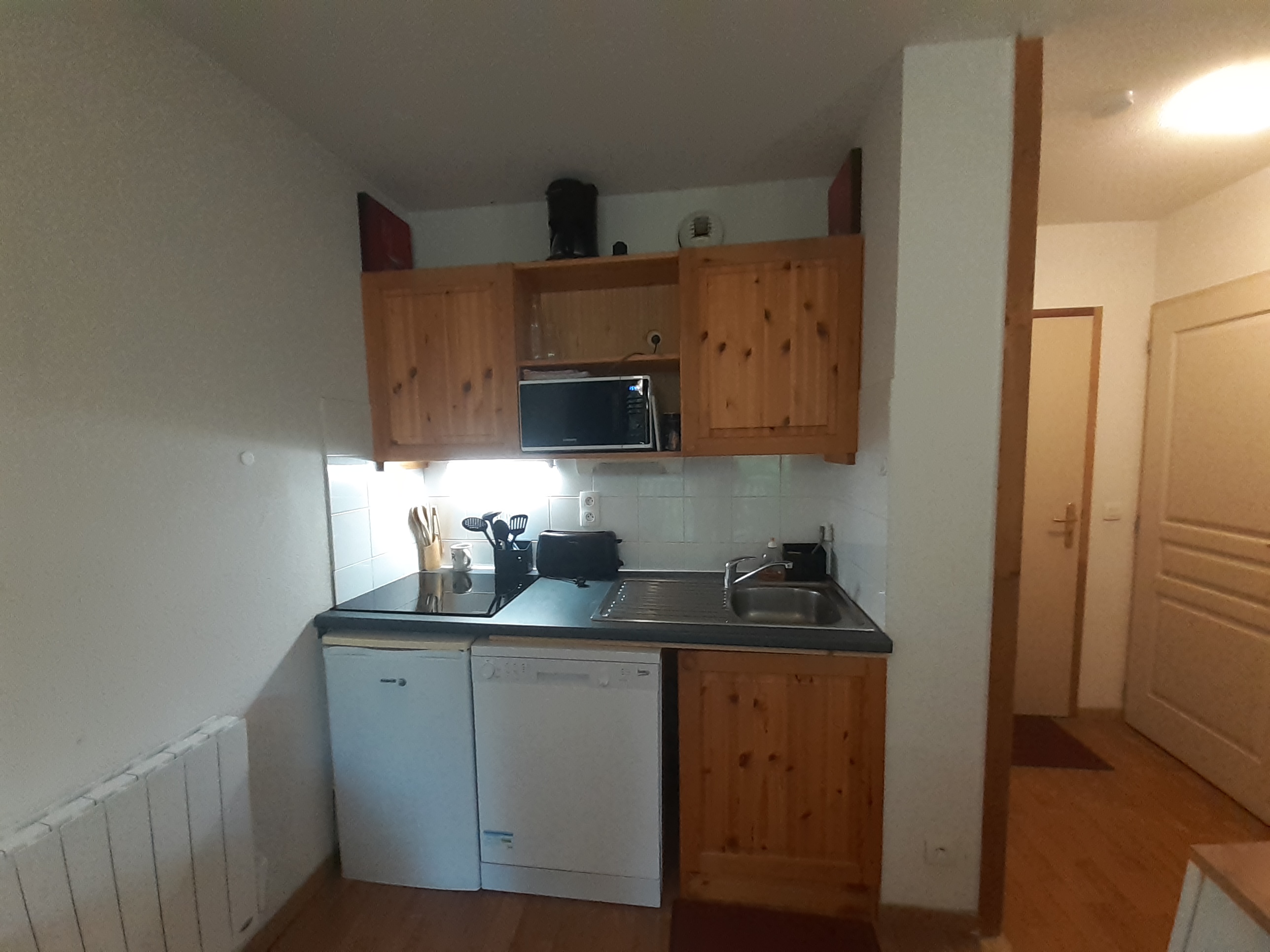 - Coin cuisine équipé : plaque vitrocéramique 3 feux, micro-ondes, réfrigérateur, lave-vaisselle, cafetière à filtre, grille pain