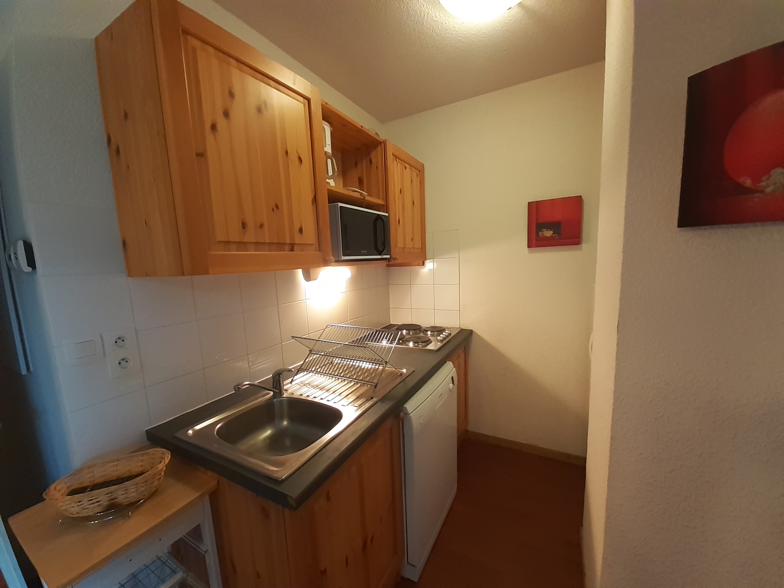 - Coin cuisine équipé : plaque électrique 4 feux, micro-ondes, réfrigérateur, lave-vaisselle, cafetière à filtre