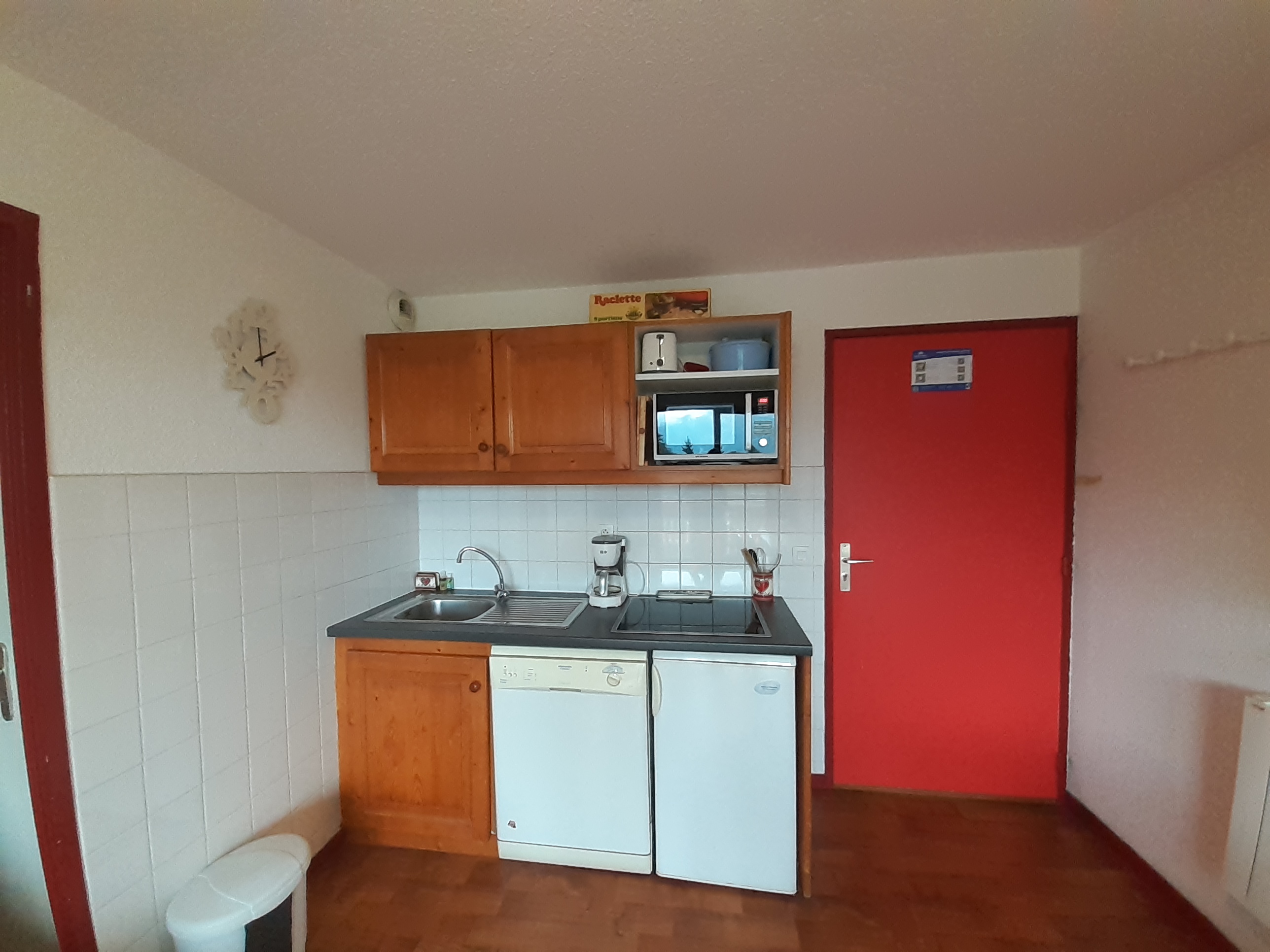 - Coin cuisine équipé : plaque vitrocéramique 3 feux, micro-ondes, réfrigérateur, lave-vaisselle, cafetière à filtre, grille-pain, service à raclette