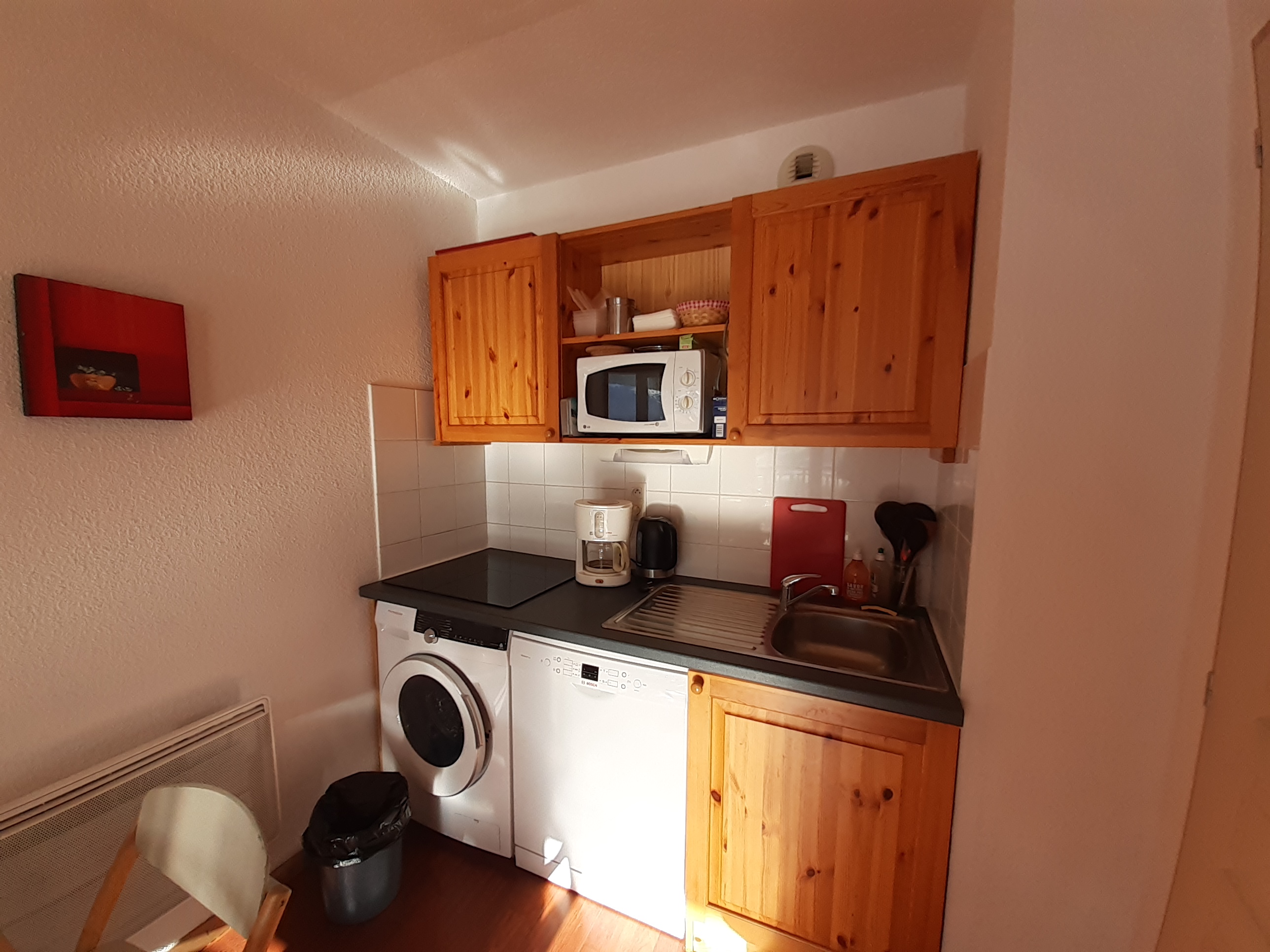 - Coin cuisine équipé : plaque vitrocéramique 3 feux, réfrigérateur, machine à laver, lave-vaisselle, cafetière à filtre, grille pain, bouilloire