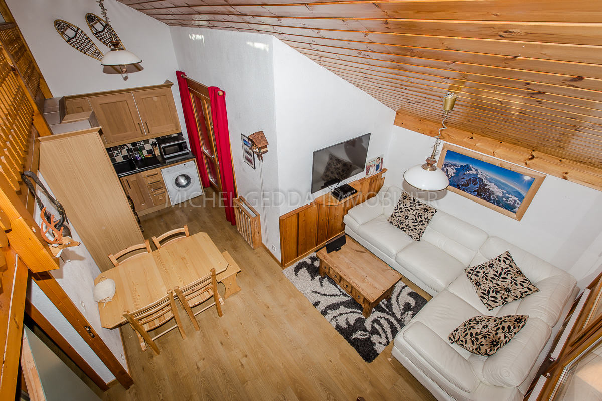 Ce très bel appartement 2 pièces duplex avec mezzanine de 34 m2 (hors mezzanine infèrieure à 1m80) meublé et équipé pour 4/5 personnes (linge non inclus), situé au centre de Montchavin comprend :