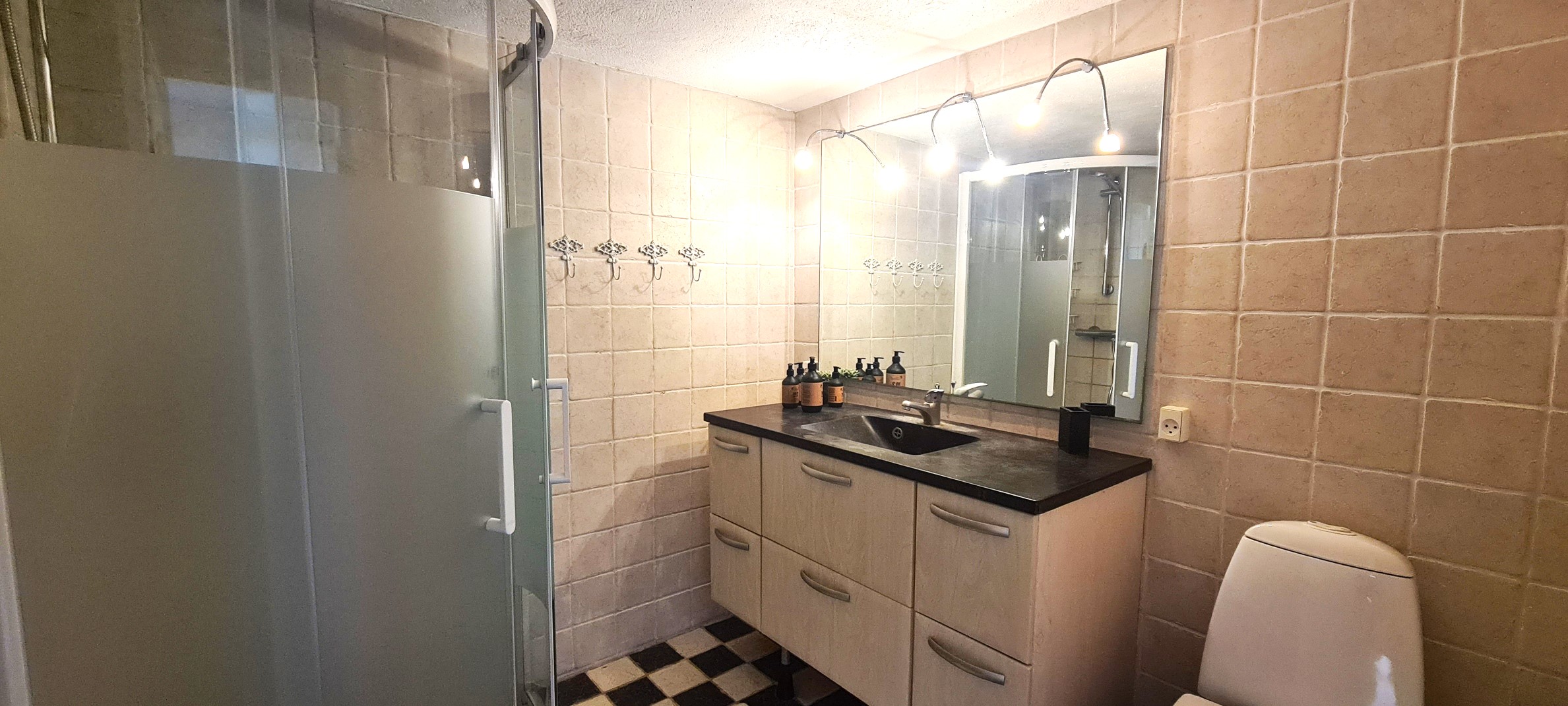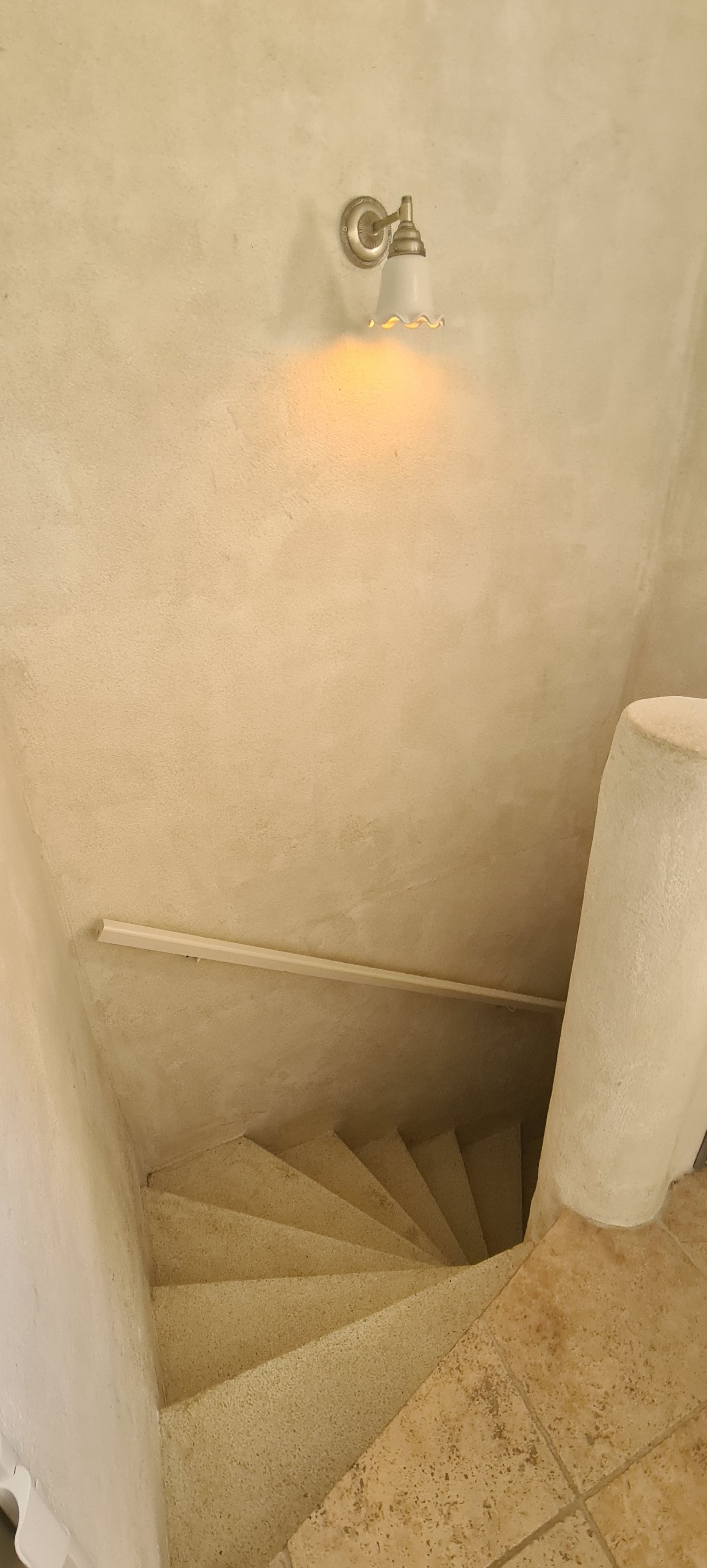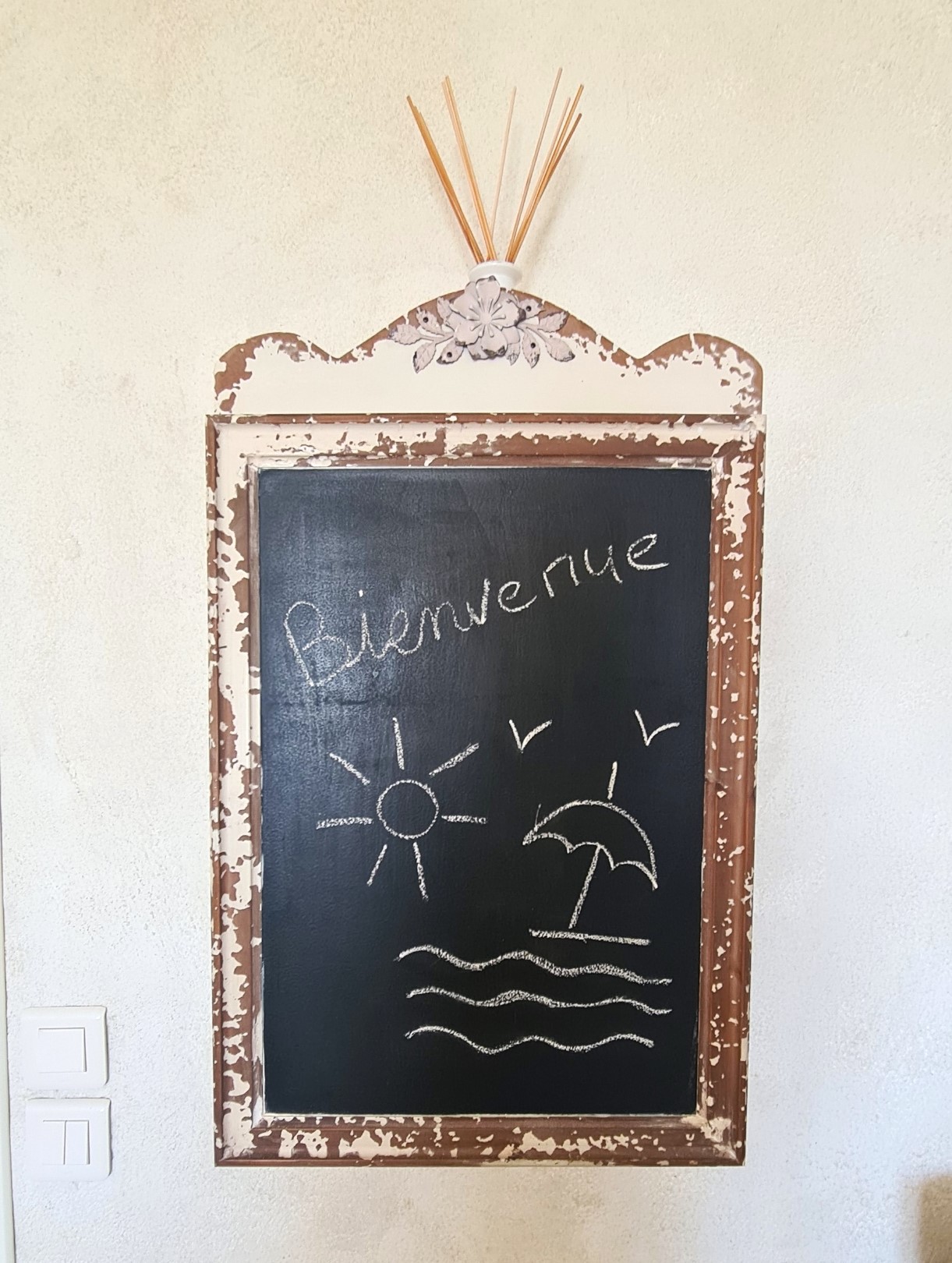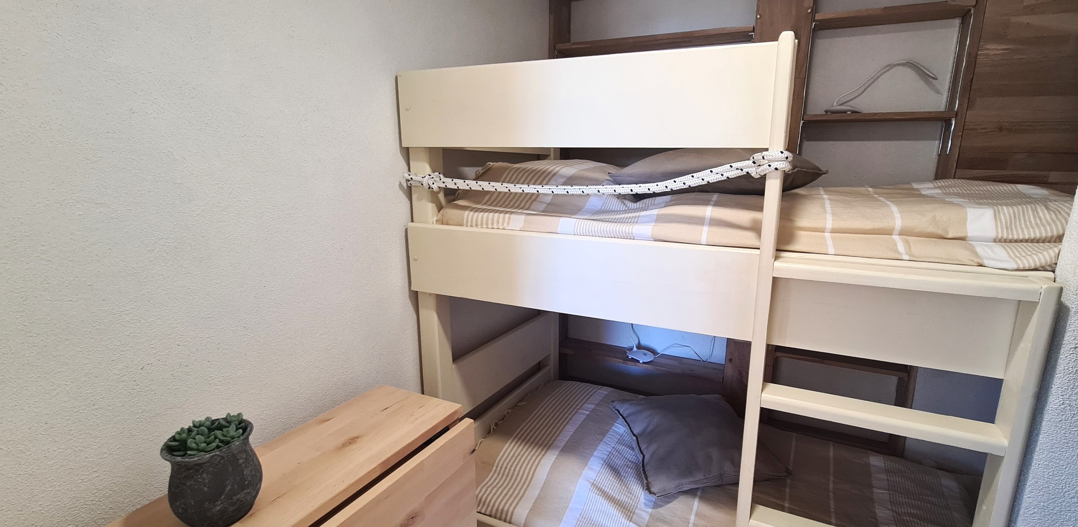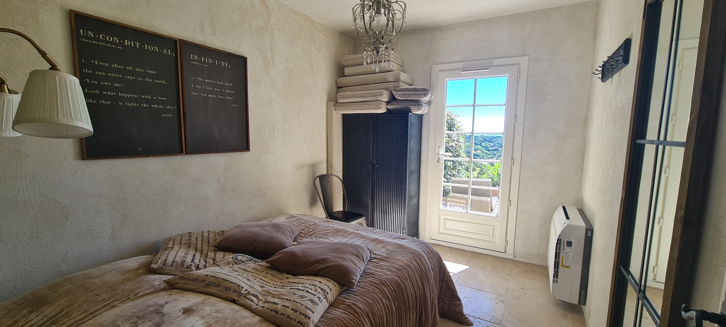 En rez-de-jardin, 2 chambres avec rangement, un coin nuit avec 2 lits superposés, salle d'eau avec toilettes, toilettes séparés et accès à la terrasse avec vue mer.