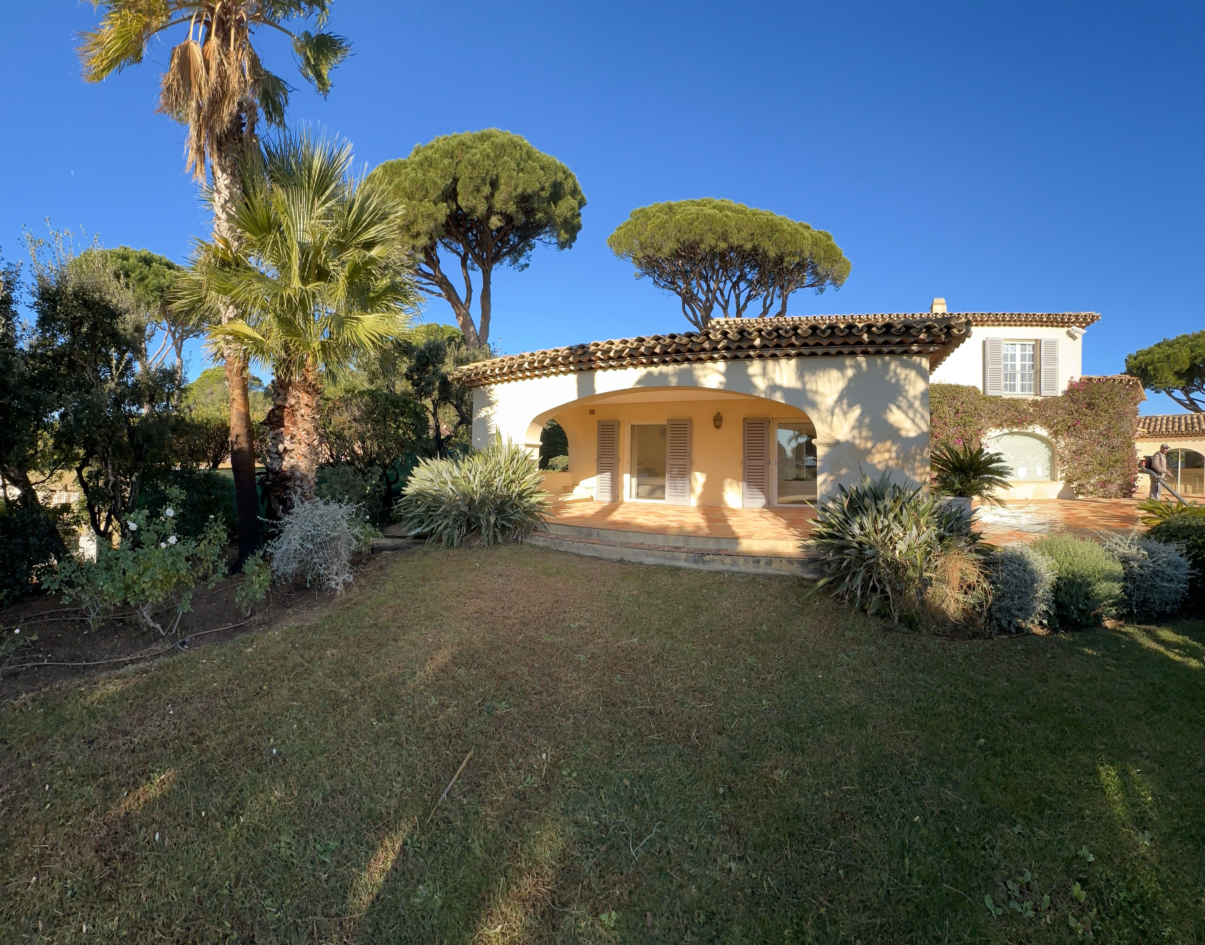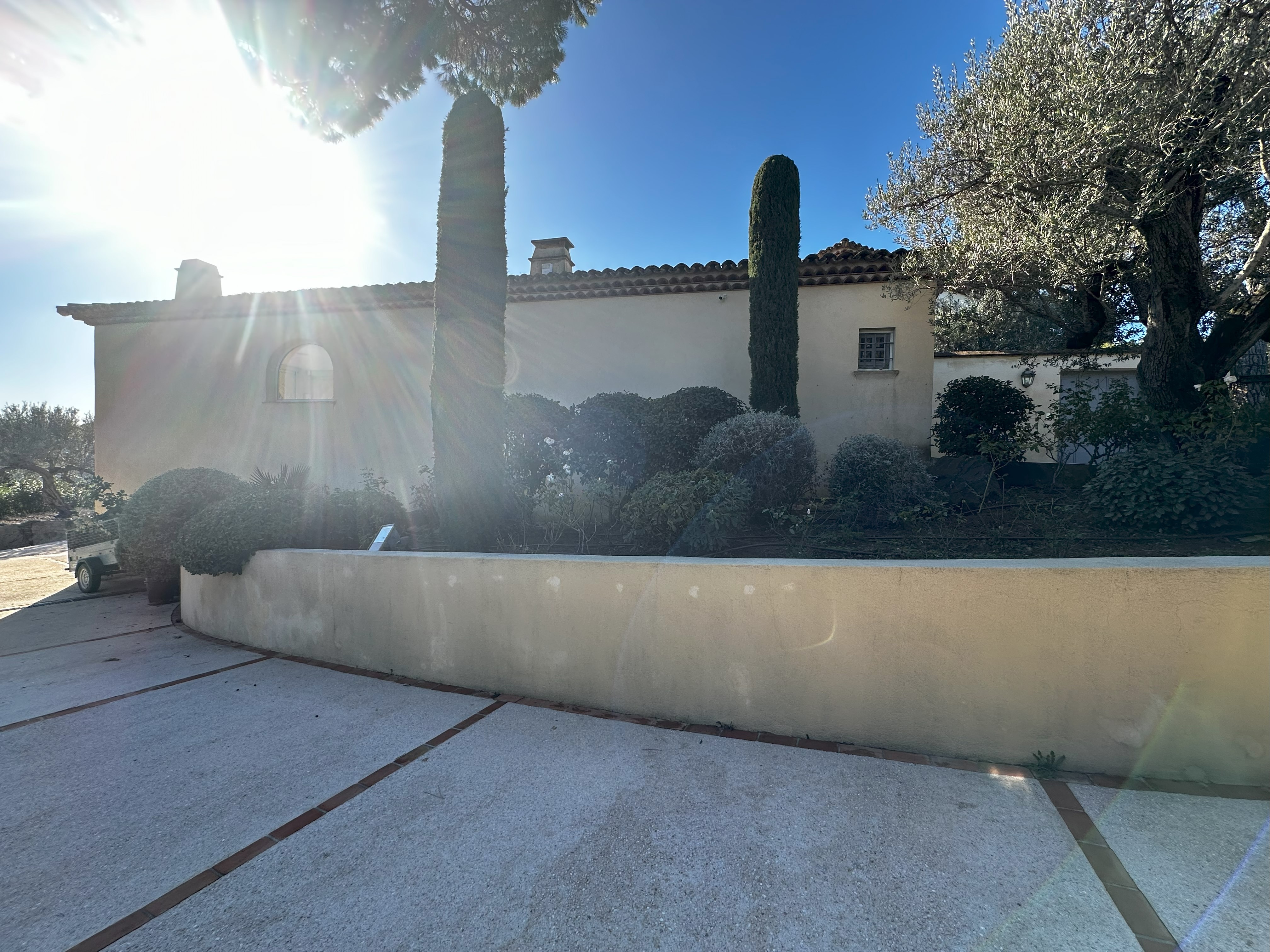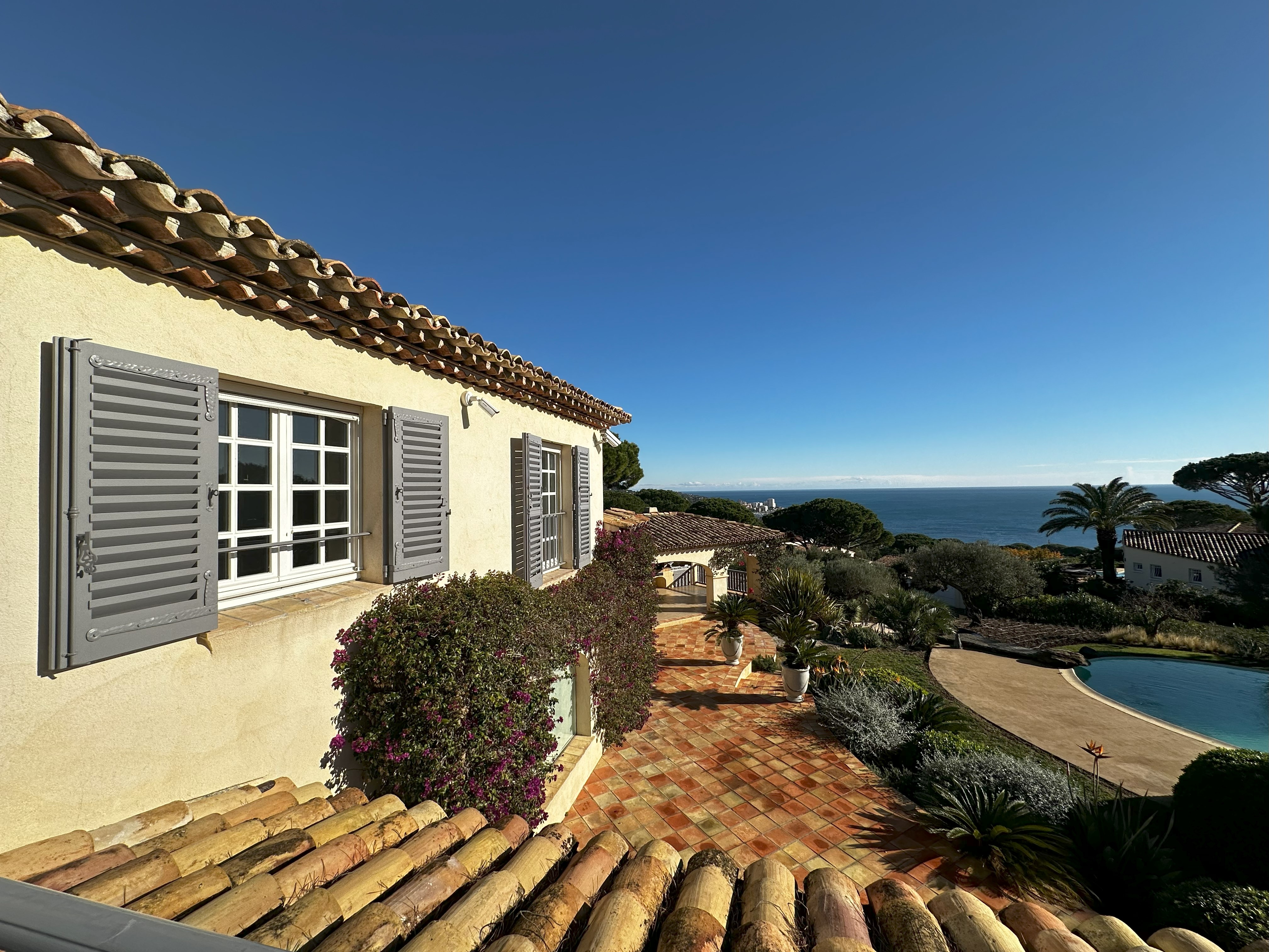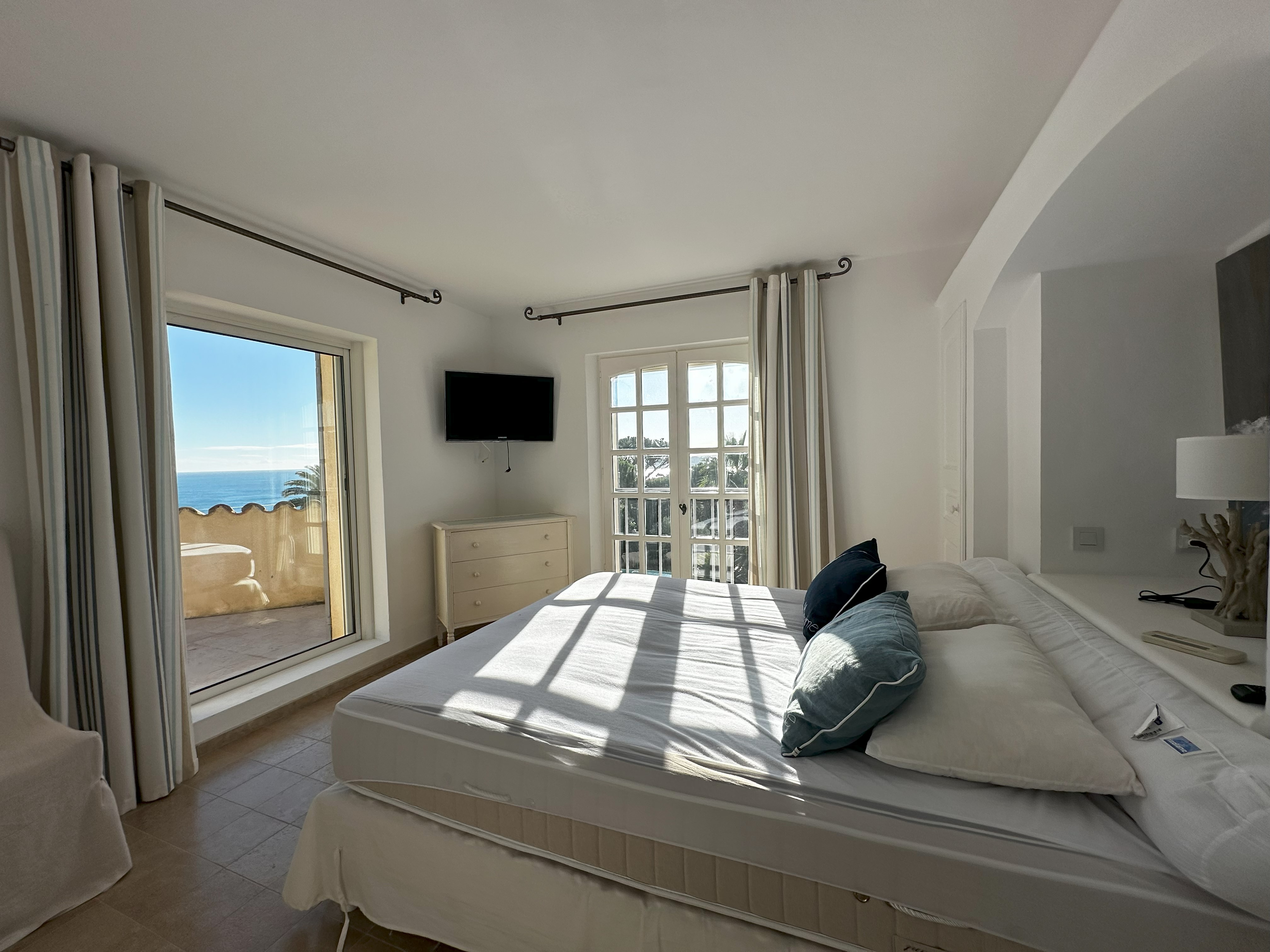 Villa de style provençal pouvant accueillir 10 personnes, d’une surface habitable de 220 m² et construite sur un grand terrain aménagé avec goût d’environ 2500 m². Située dans un domaine au calme, à 10 minutes en voiture du centre-ville et 5 minutes de la plage, sa situation, son exposition sud et sa belle vue mer en font une destination privilégiée. La villa est entièrement climatisée, disposant d’une grande terrasse abritée et d’une belle piscine de forme libre 5x11m. Au-rez-de-chaussée se trouvent 3 chambres, 2 salles de bains/douche, une grande salle de séjour avec coin repas et coin salon. A l’étage 2 chambres avec TV et terrasse solarium ainsi que 2 salles de bains/douche. Animaux non admis.