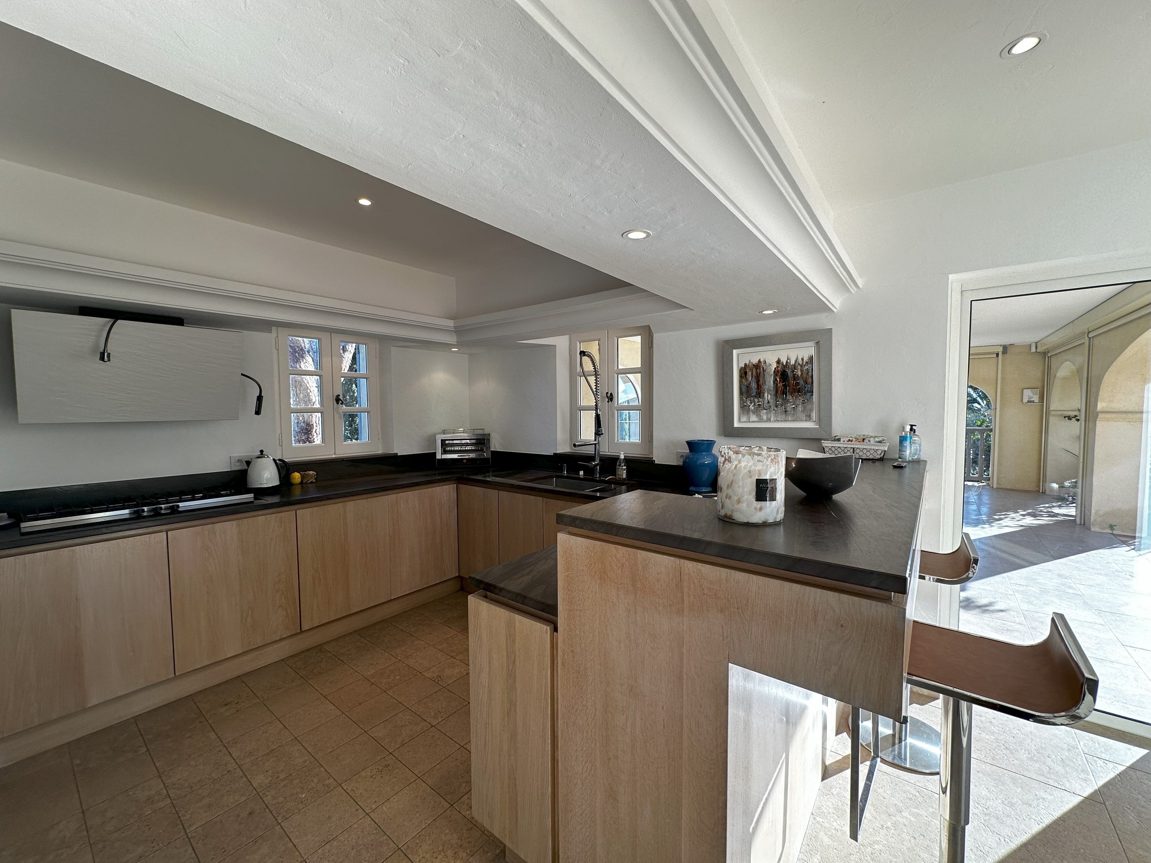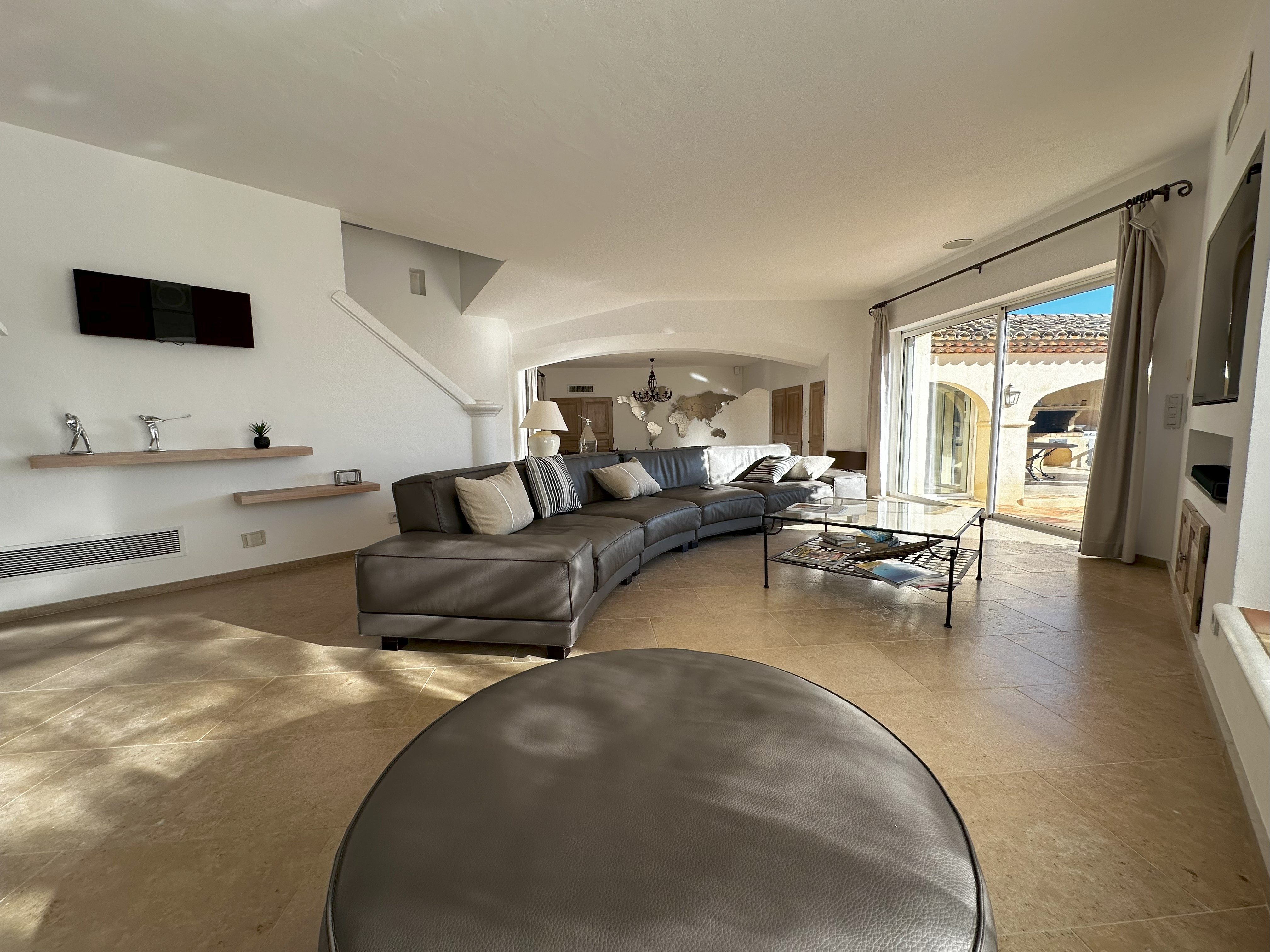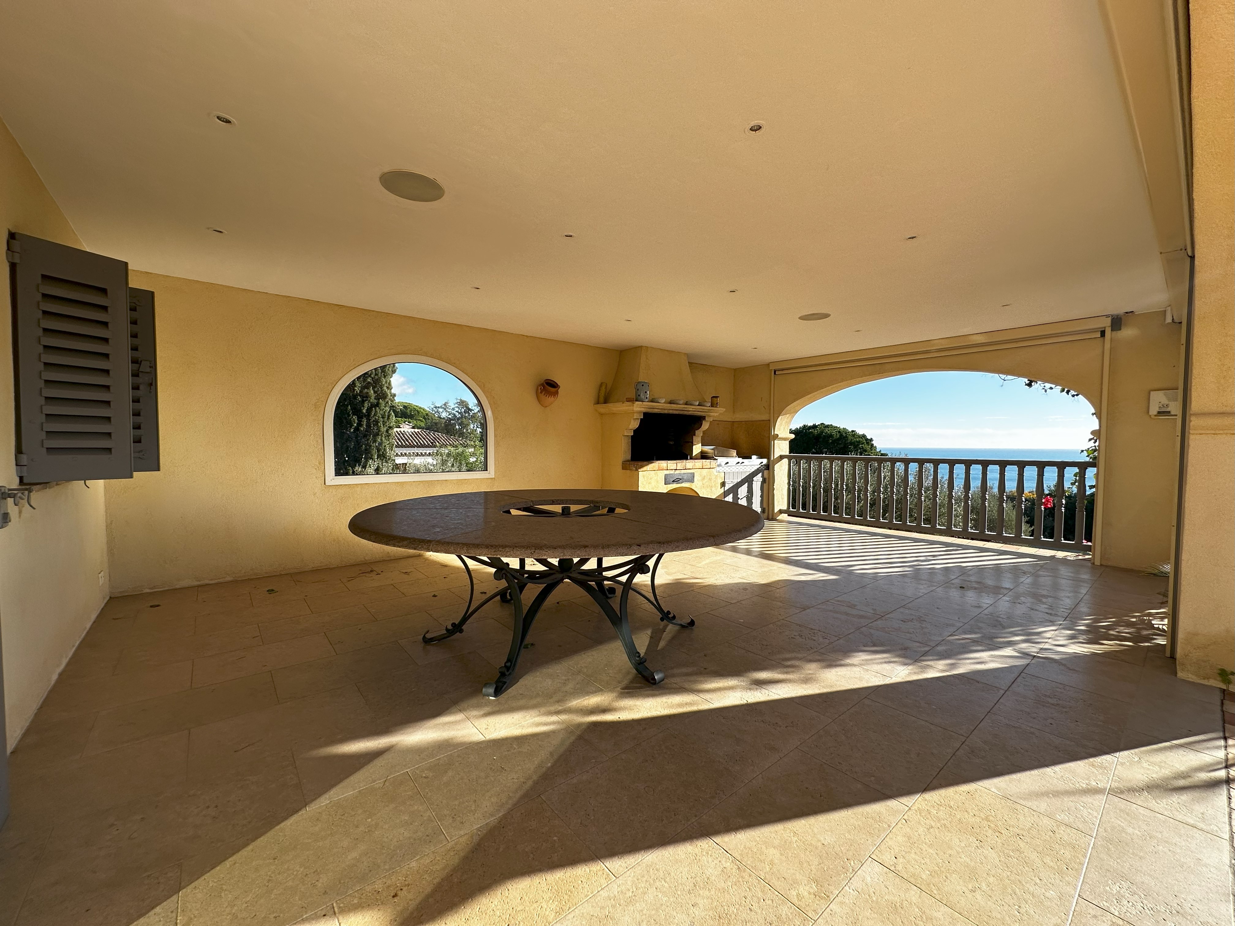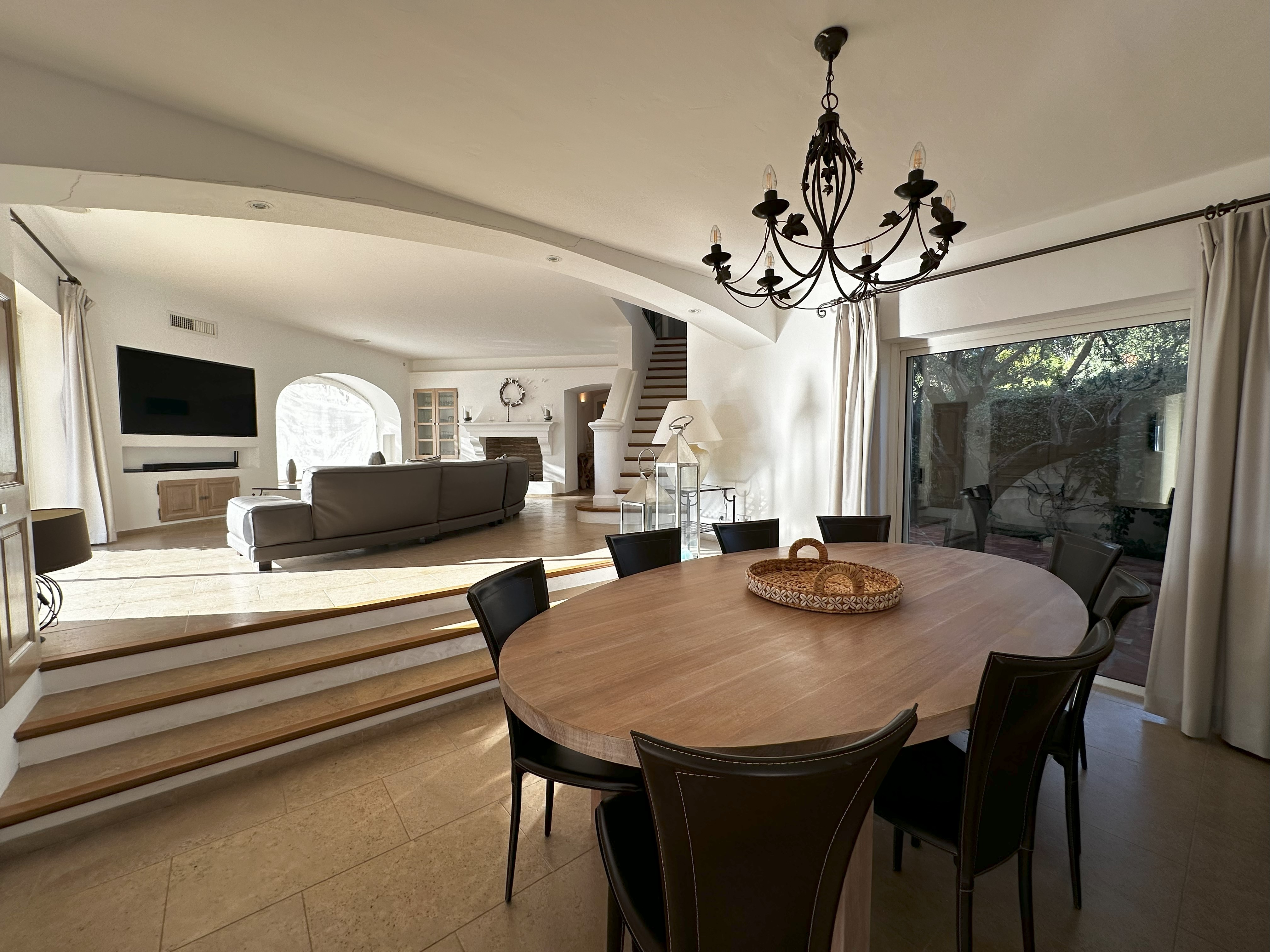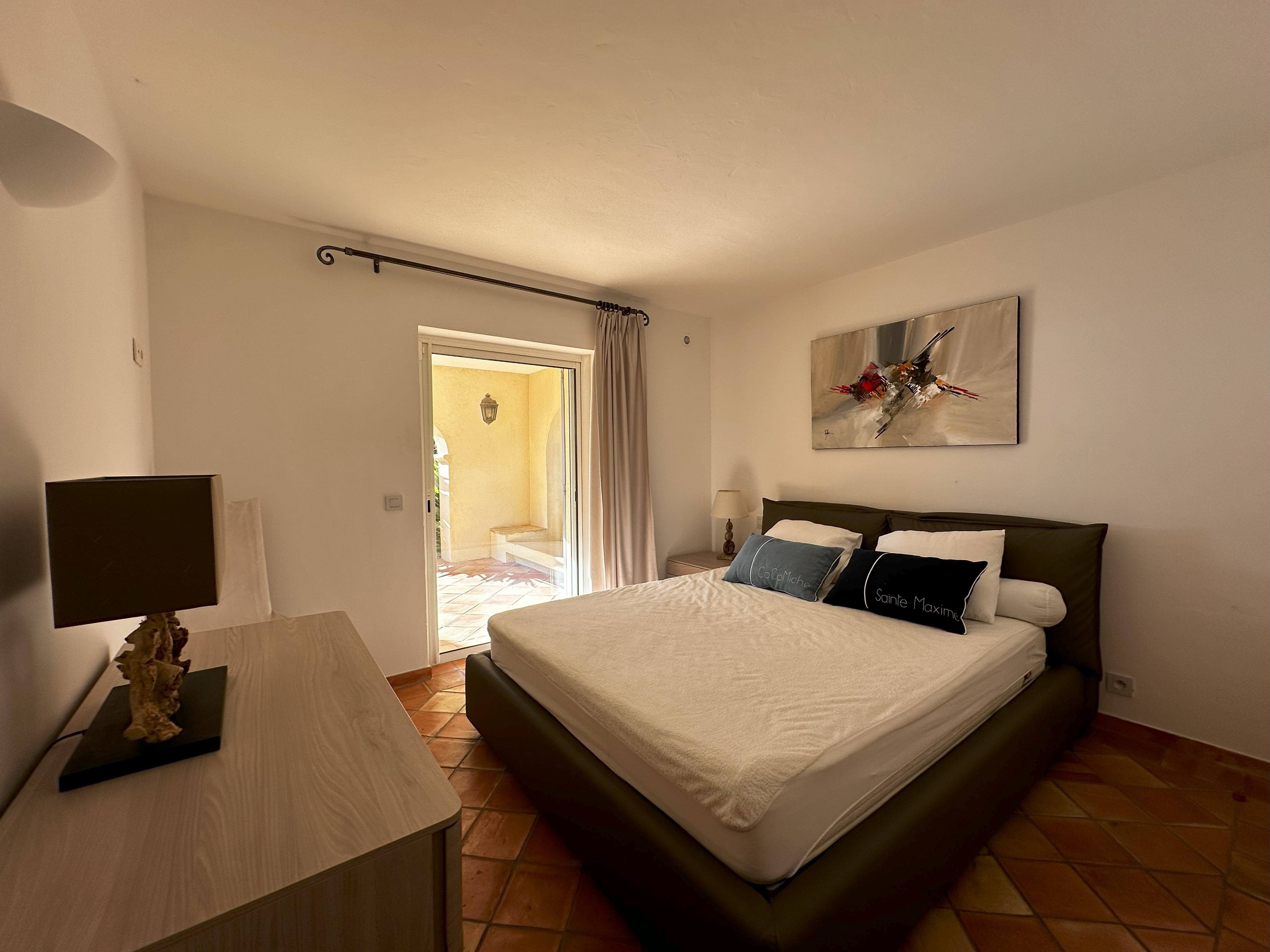 Villa de style provençal pouvant accueillir 10 personnes, d’une surface habitable de 220 m² et construite sur un grand terrain aménagé avec goût d’environ 2500 m². Située dans un domaine au calme, à 10 minutes en voiture du centre-ville et 5 minutes de la plage, sa situation, son exposition sud et sa belle vue mer en font une destination privilégiée. La villa est entièrement climatisée, disposant d’une grande terrasse abritée et d’une belle piscine de forme libre 5x11m. Au-rez-de-chaussée se trouvent 3 chambres, 2 salles de bains/douche, une grande salle de séjour avec coin repas et coin salon. A l’étage 2 chambres avec TV et terrasse solarium ainsi que 2 salles de bains/douche. Animaux non admis.