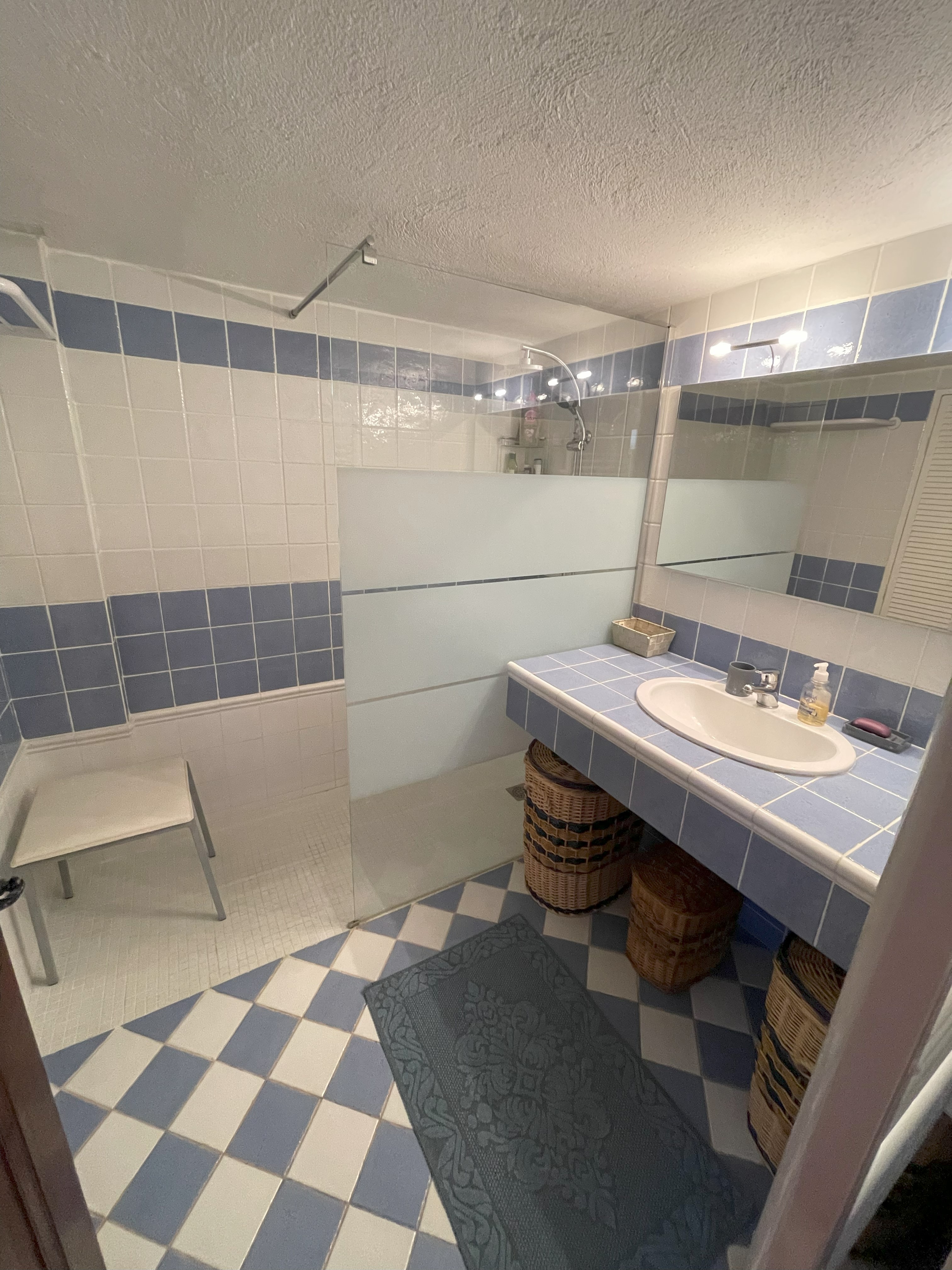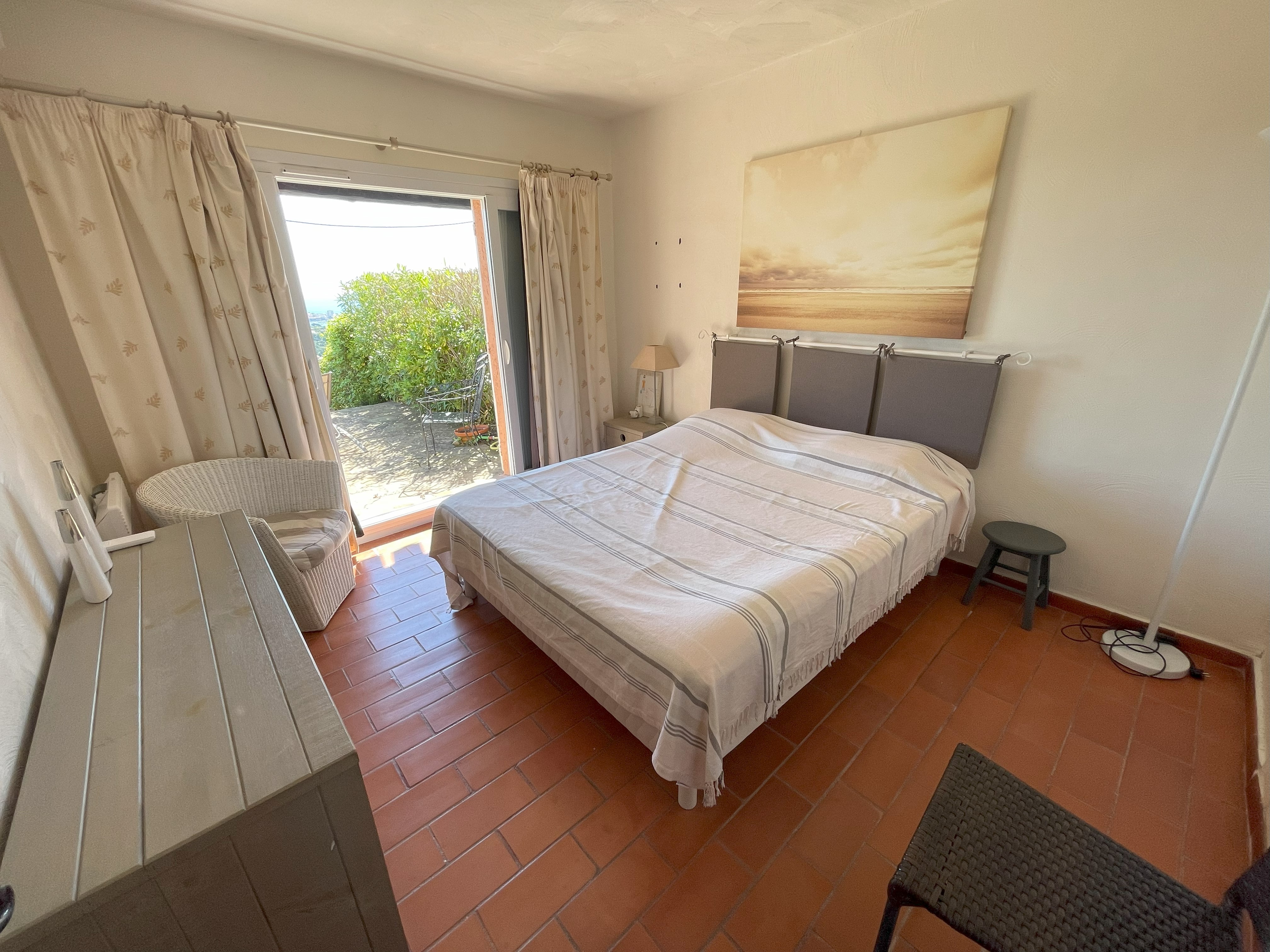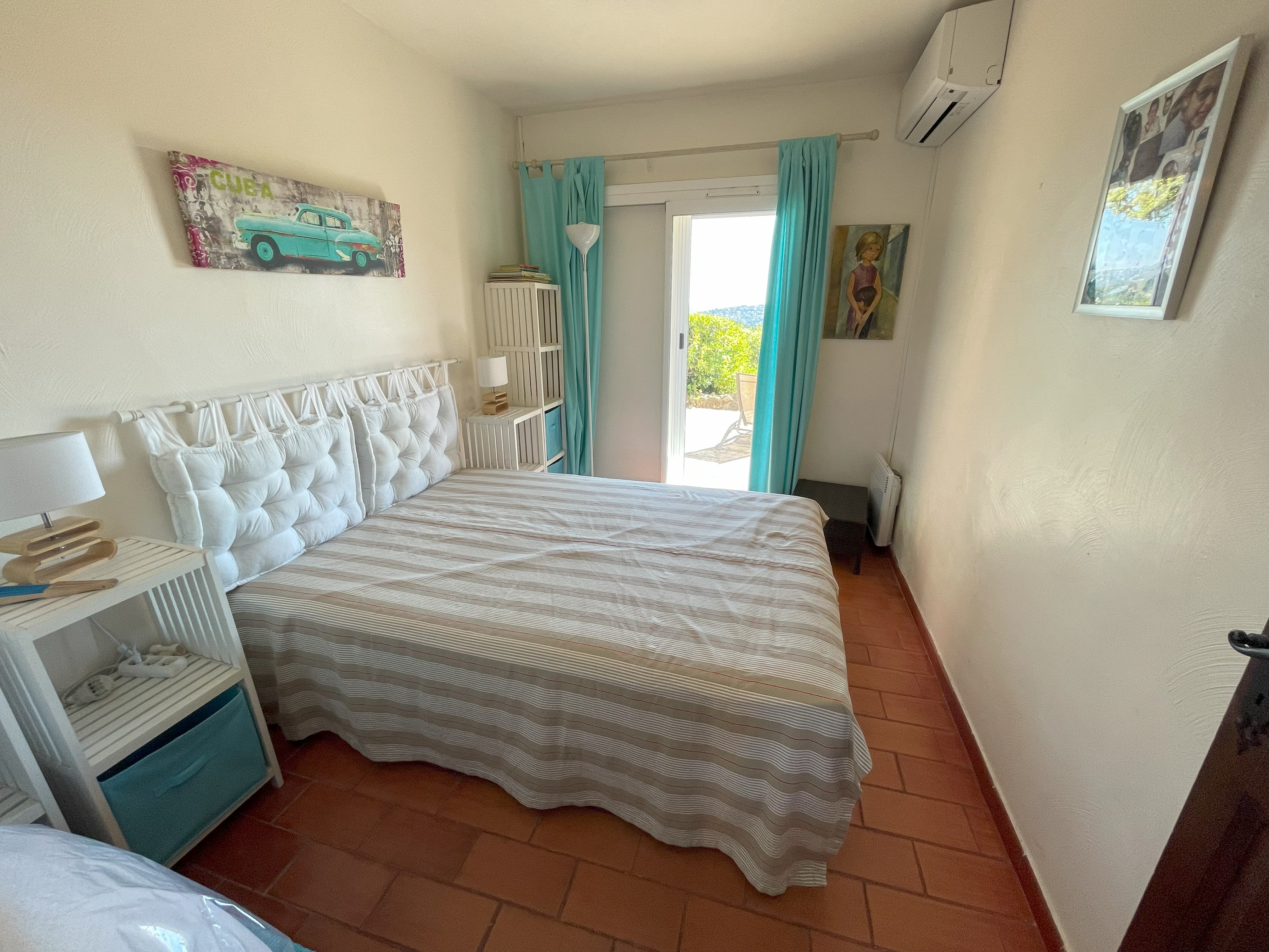 En rez-de-jardin, 2 chambres avec rangement, salle d'eau, toilettes séparés et accès à la terrasse avec vue mer.