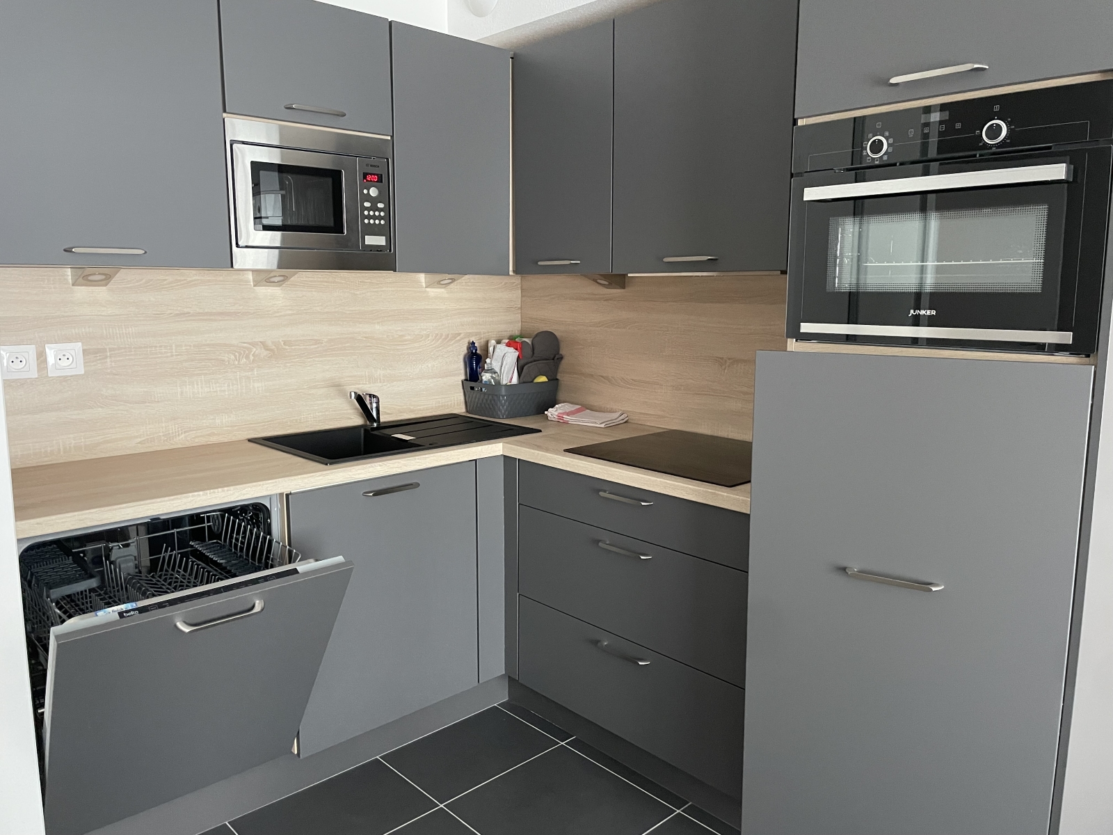 Cabine (chambre sans fenêtre et sans porte, rideau séparateur de pièce) : 2 lits en 80.Séjour : canapé-lit 2 places en 160, télévision - Cuisine américaine : frigo avec bac conservateur, plaque vitro 4 feux, four, micro-ondes, lave-vaisselle, cafetière à filtre, grille-pain, bouilloire, robot.