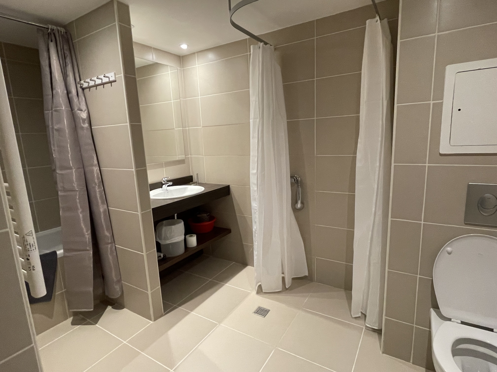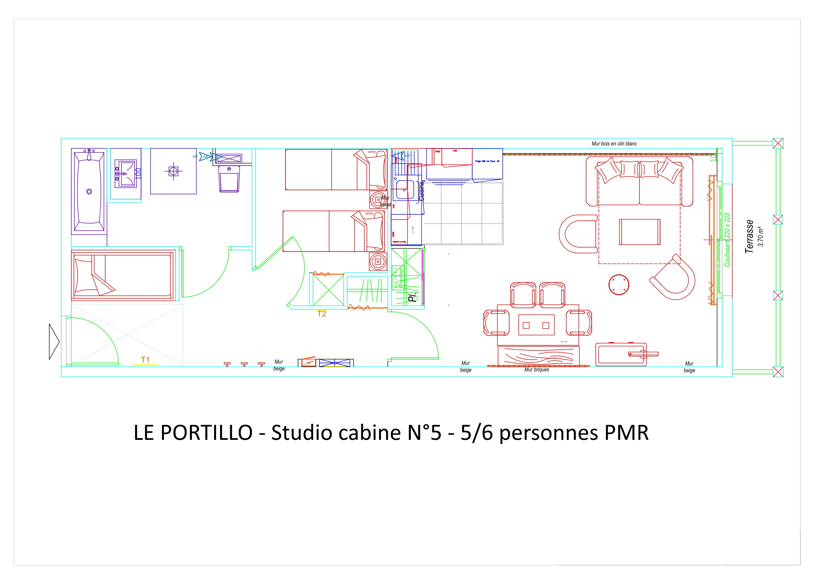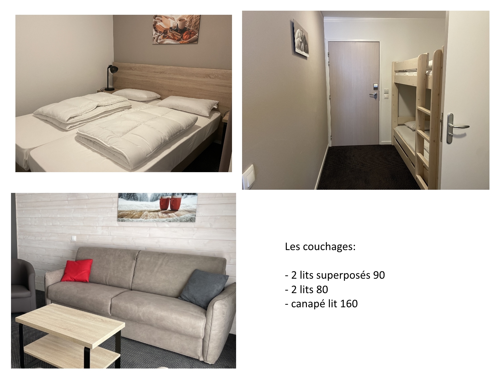Studio PMR (personne à mobilité réduite) équipé et meublé pour 6 personnes, de 52m², exposé Sud-ouest vue sur les pistes et la station, au 1°niveau avec balcon.Entrée : coin montagne 2 lits superposés en 90.Salle de bain : baignoire, lavabo, WC et sèche-cheveux.