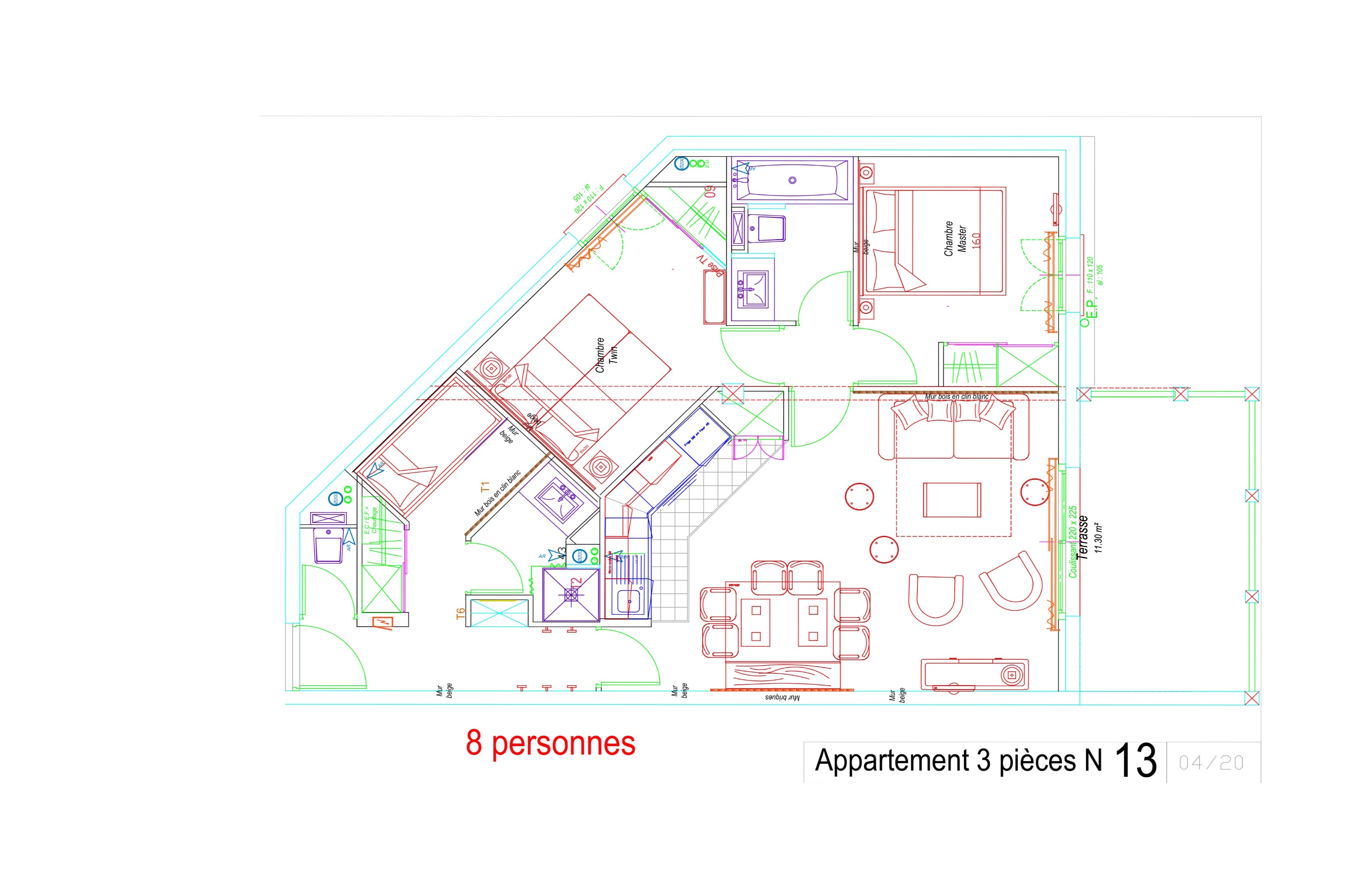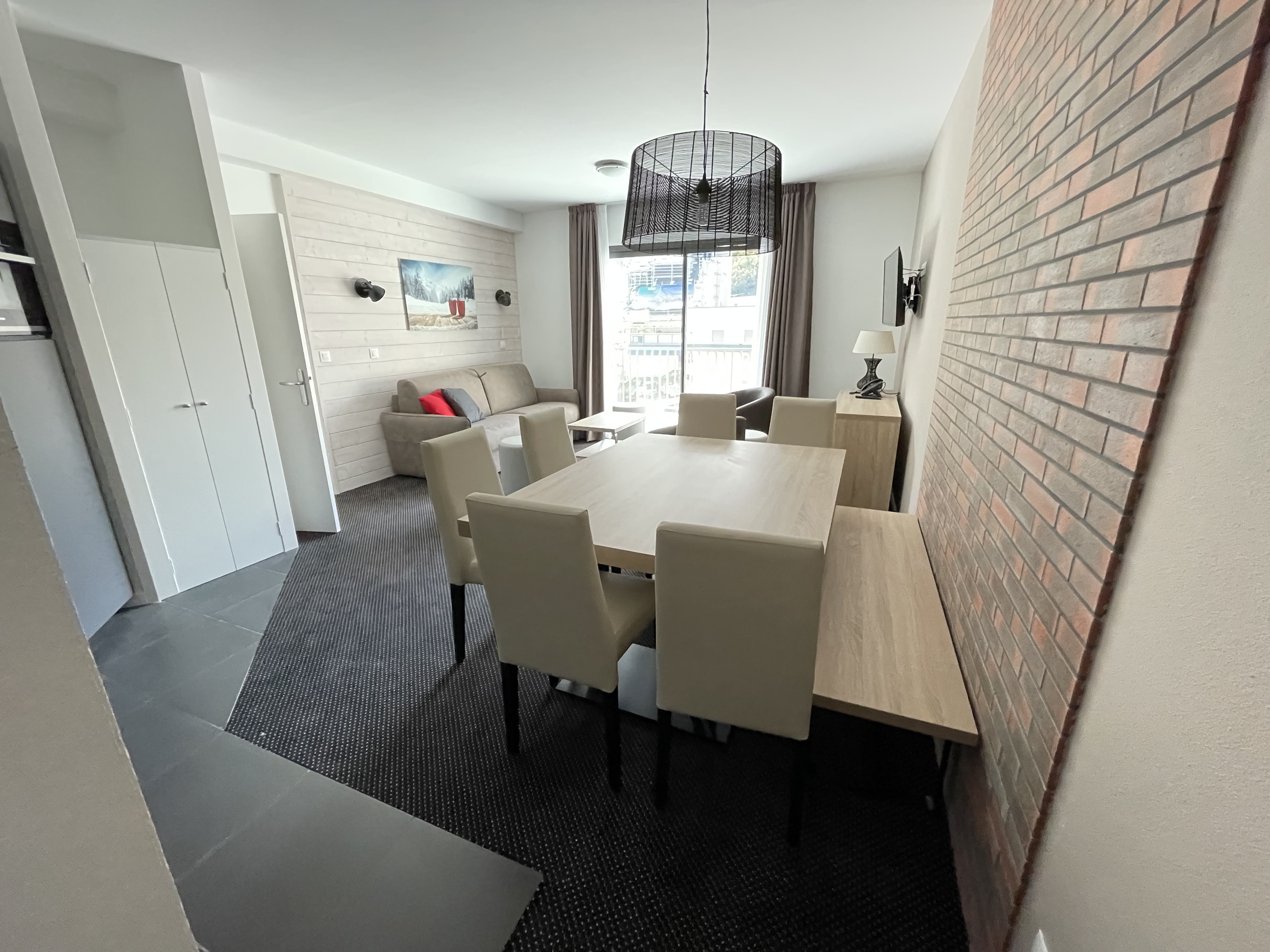 Appartement 3 pièces équipé et meublé pour 6/8 personnes, de 67m², exposé Sud-Ouest, vue Pistes et station, situé 1°étage avec terrasse.Entrée : coin montagne avec 2 lits superposés en 90.Salle d'eau : lavabo, douche et sèche-cheveux.WC indépendant.Salle de bains : lavabo, baignoire et WC. Séjour : canapé lit 2 places en 160, télévision -Cuisine américaine : frigo avec bac conservateur, plaque vitro 4 feux, four, micro-ondes, lave-vaisselle, cafetière à filtre, grille pain, bouilloire robot.