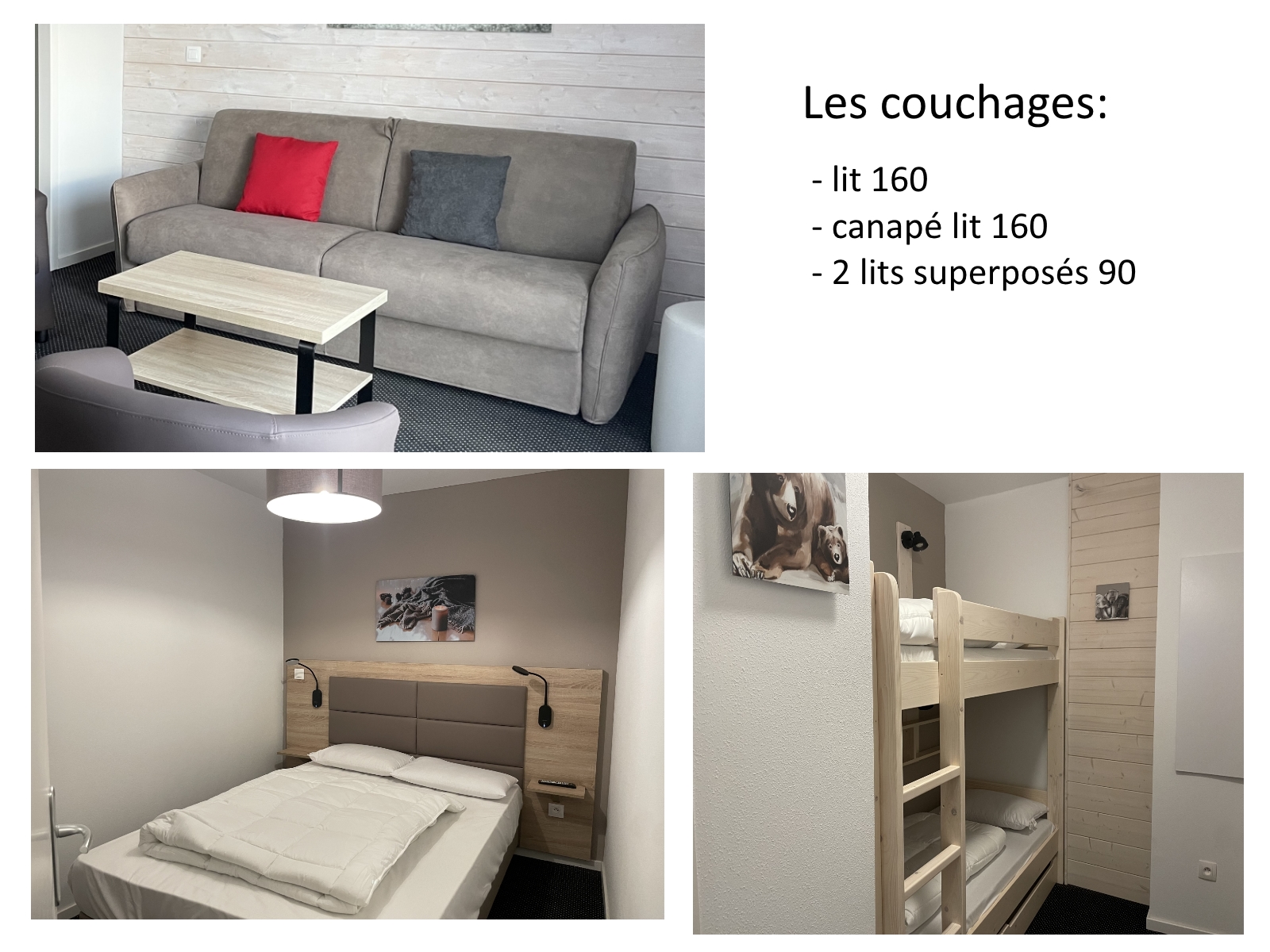Studio cabine équipé et meublé pour 6 personnes, de 56m², exposé Sud-Ouest, vue pistes et station, situé au 2°étage avec terrasse. Entrée : coin montagne avec 2 lits superposés en 90.Salle de bain : lavabo, baignoire et sèche-cheveux.WC indépendant. Cabine (chambre sans fenêtre) : lit 140, télévision.Séjour : canapé-lit 2 places en 160. télévision-Cuisine américaine : frigo avec bac conservateur, plaque vitro 4 feux, four, micro-ondes, lave-vaisselle, cafetière à filtre, grille-pain, bouilloire, robot.