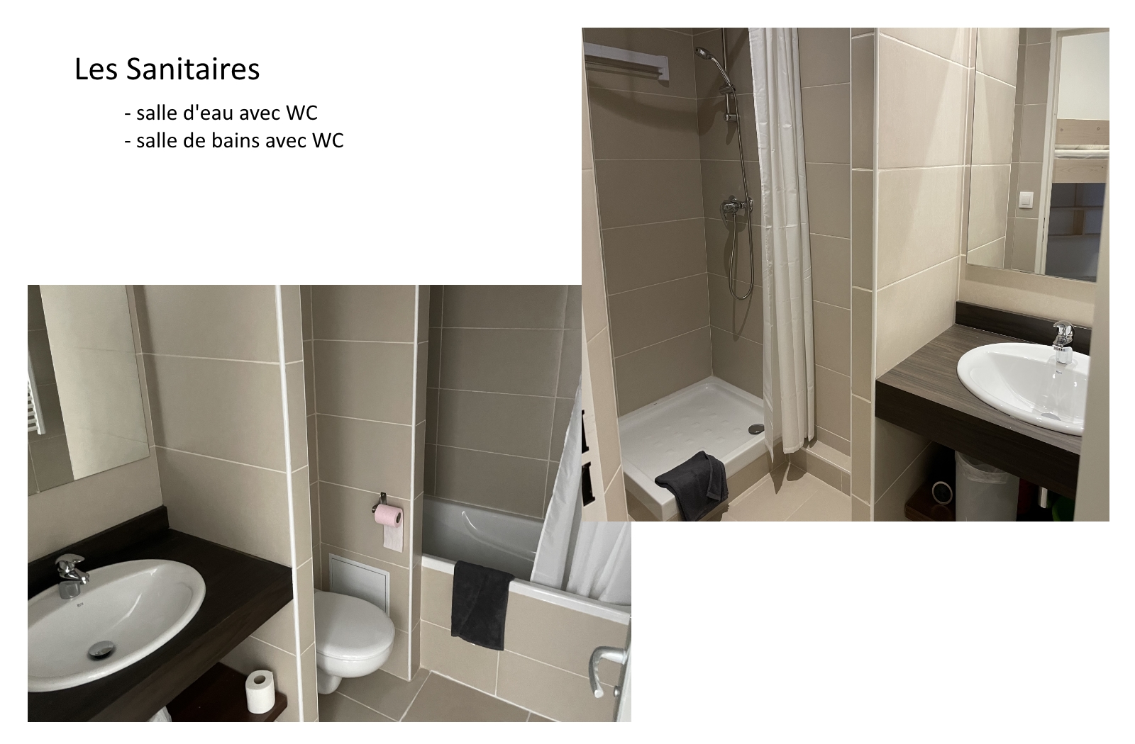 Salle de bain : baignoire, lavabo et WC.Chambre1 : lit en 160, télévision, vue Vallée.Chambre2 : 2 lits en 80 vue résidence.