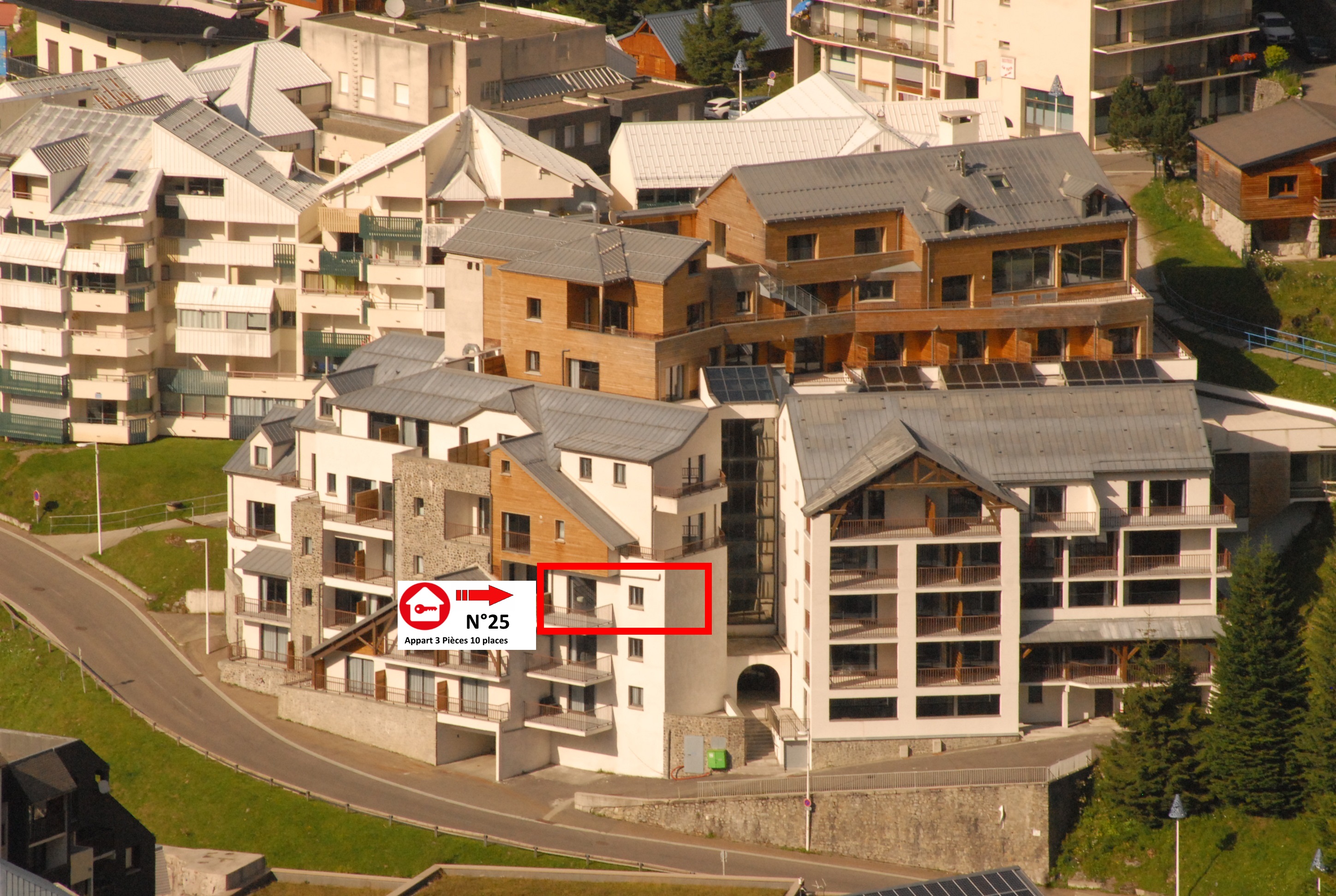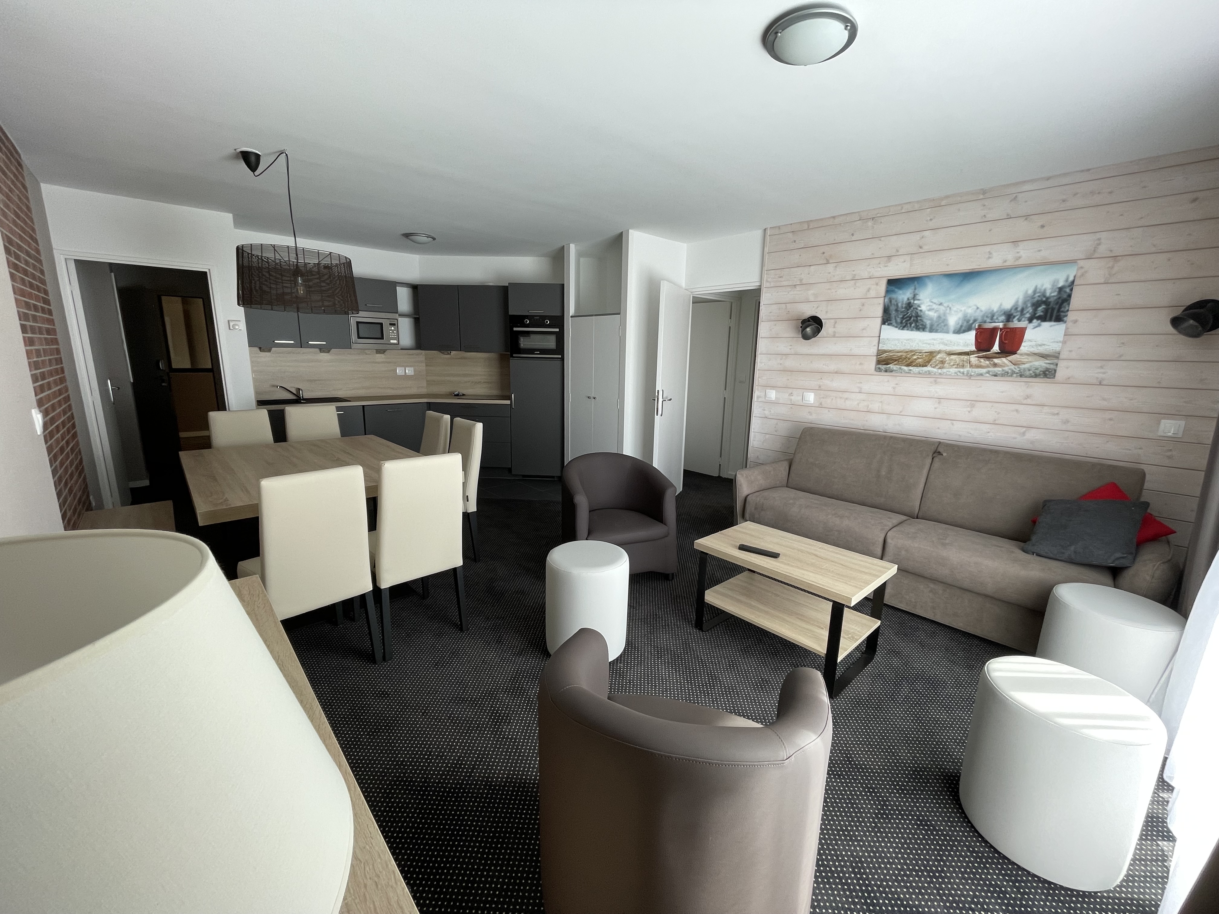 Appartement 3 pièces équipé et meublé pour 6/8 personnes, de 61m², exposé Sud-Ouest, vue pistes et station, au 2°étage avec terrasse.