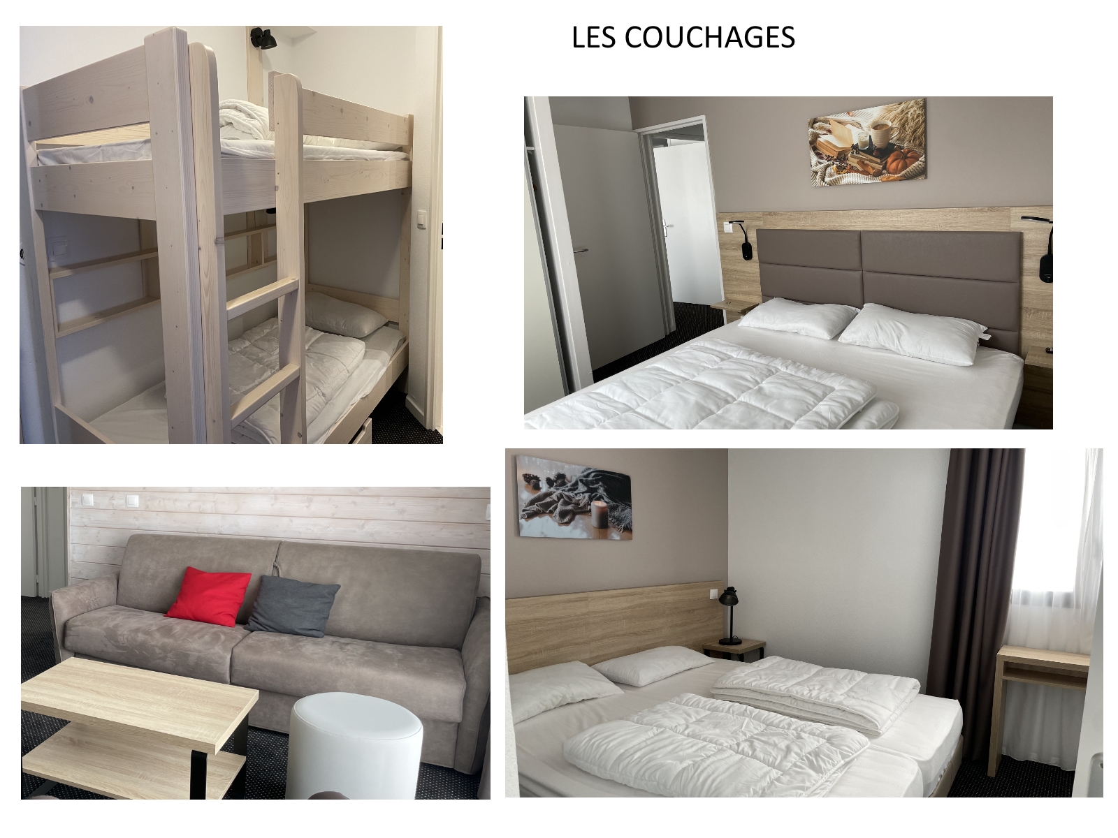 Entrée : coin montagne avec 2 lits superposés en 90.Salle d'eau : douche, lavabo, WC et sèche cheveux.Séjour : canapé lit 2 places en 160, télévision Cuisine américaine : frigo avec bac conservateur, plaque vitro 4 feux, four, micro-ondes, lave-vaisselle, cafetière à filtre, grille pain, bouilloire, robot.