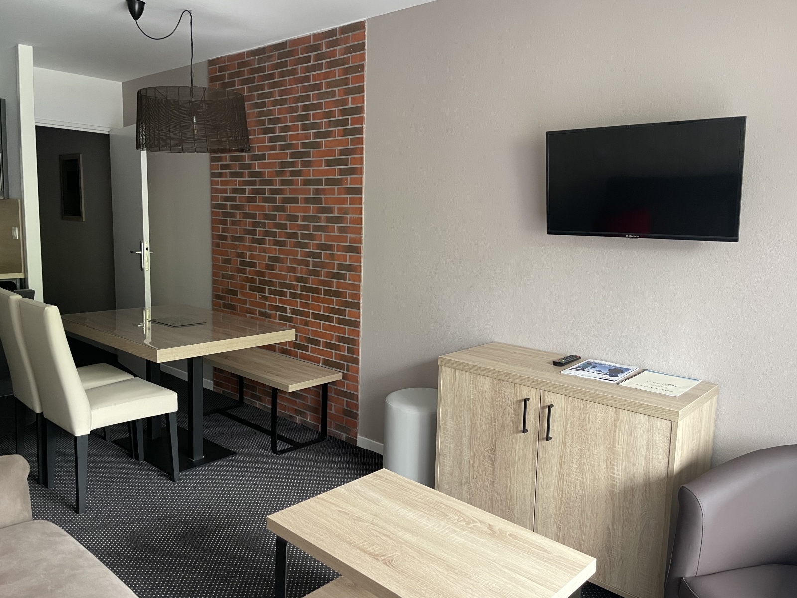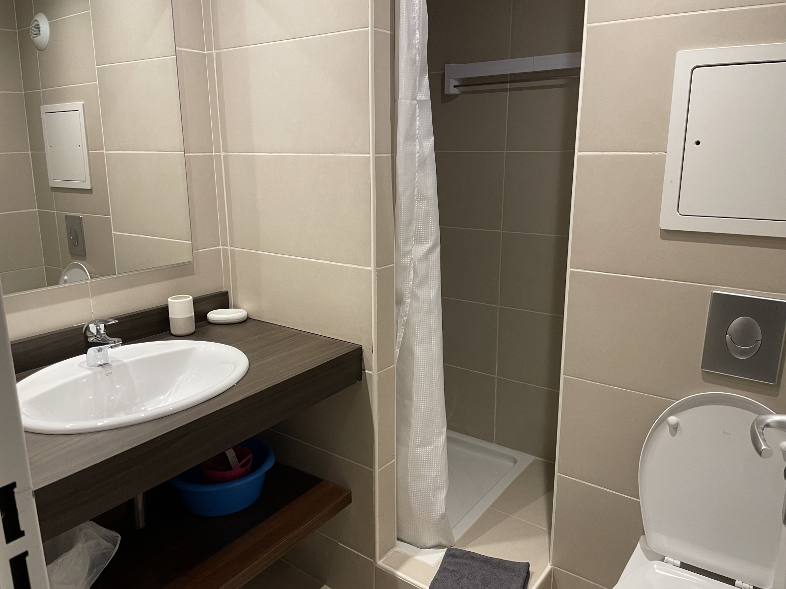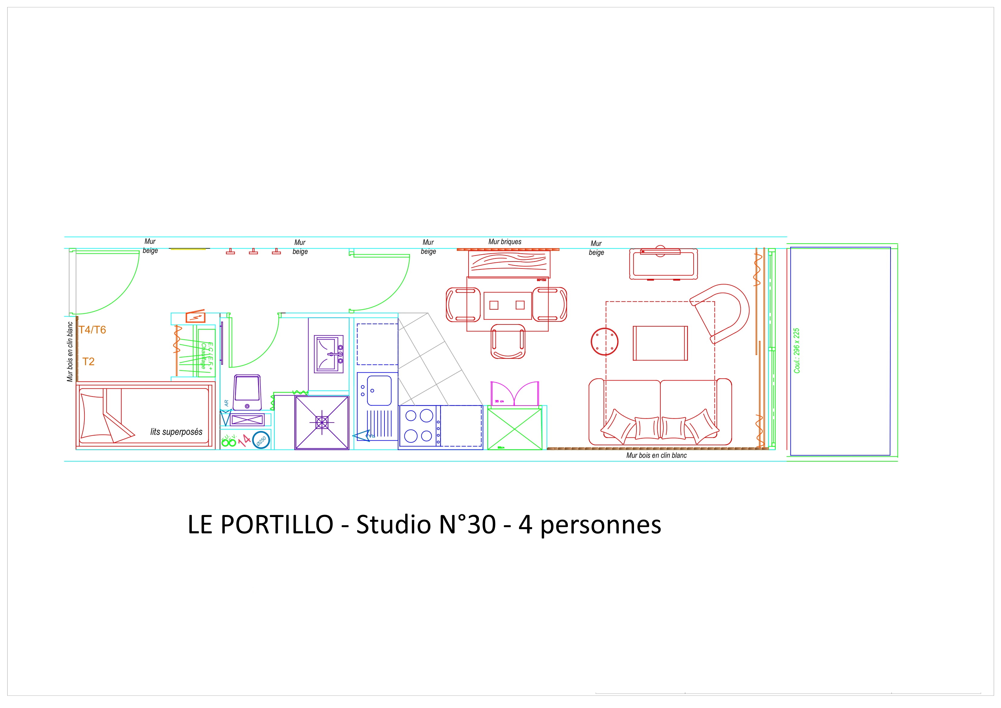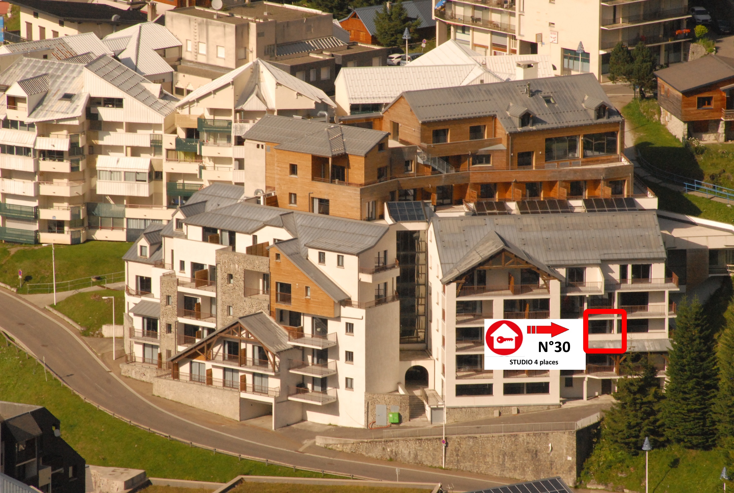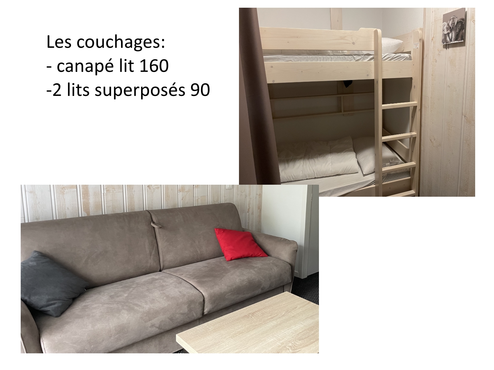 Studio équipé et meublé pour 4 personnes, de 29m², exposé Sud-Ouest, vue piste-montagne, situé au 2°étage avec terrasse. Entrée : coin montagne avec 2 lits superposés en 90.Salle d'eau : lavabo, douche, WC et sèche cheveux.Séjour : canapé lit 2 places en 160, télévision - Cuisine américaine : frigo avec bac conservateur, plaque vitro 4 feux, four,micro-onde,lave-vaisselle, cafetière à filtre, grille-pain, bouilloire et robot.
