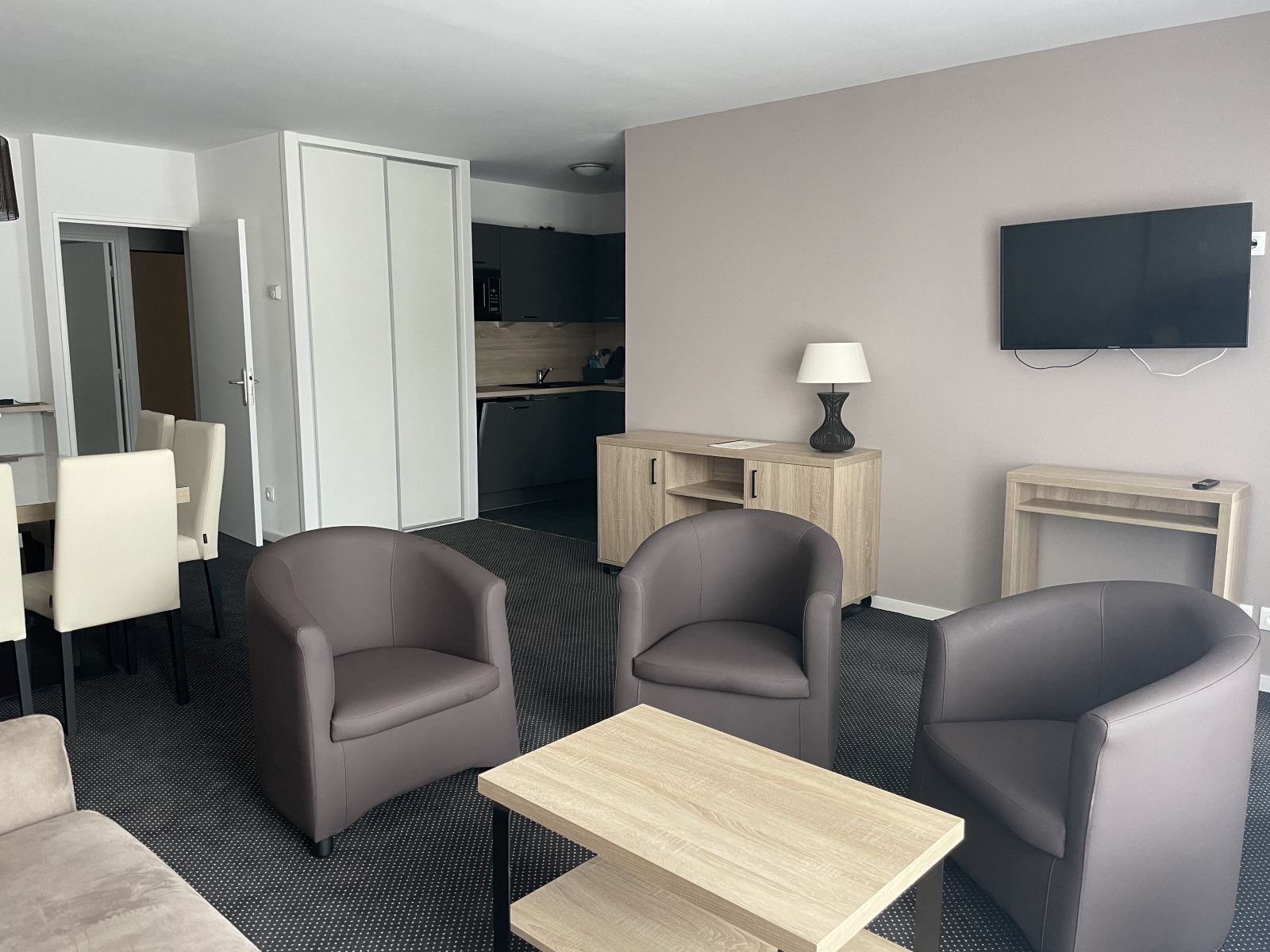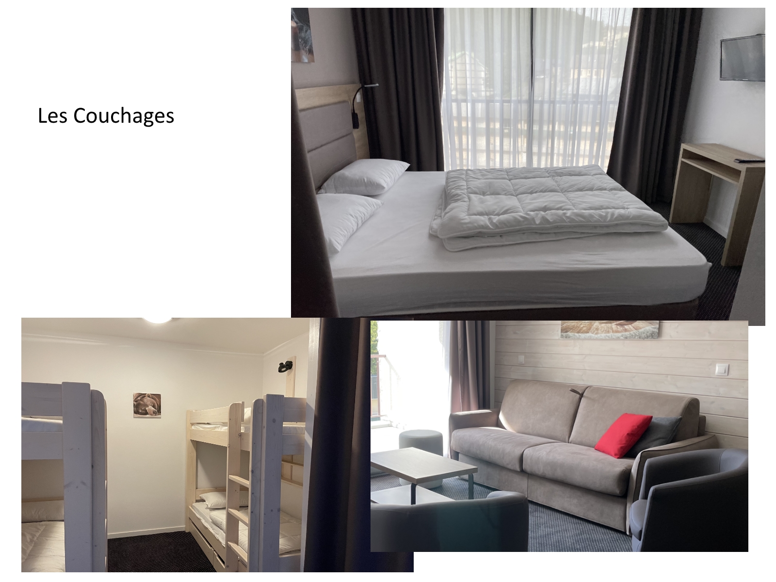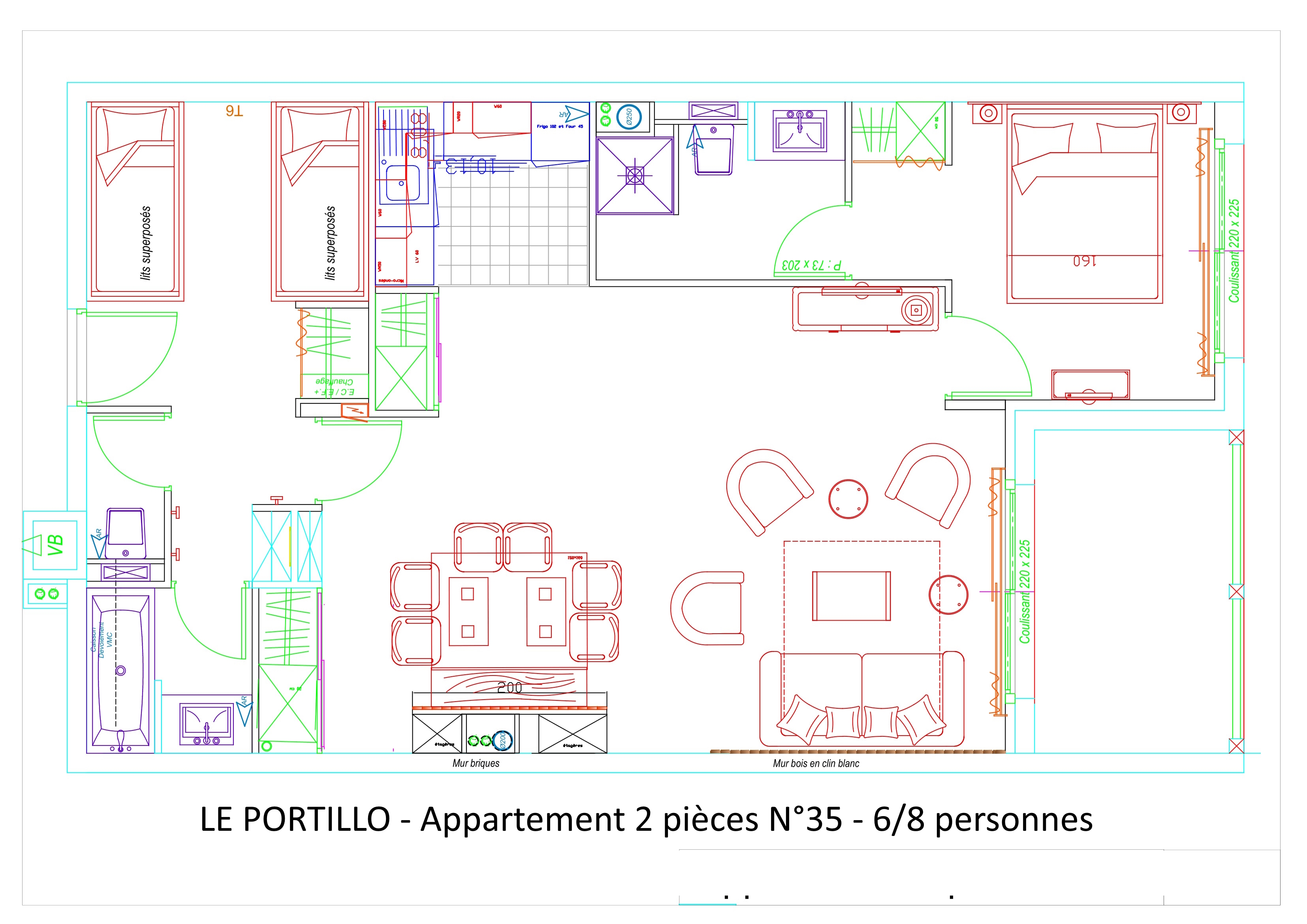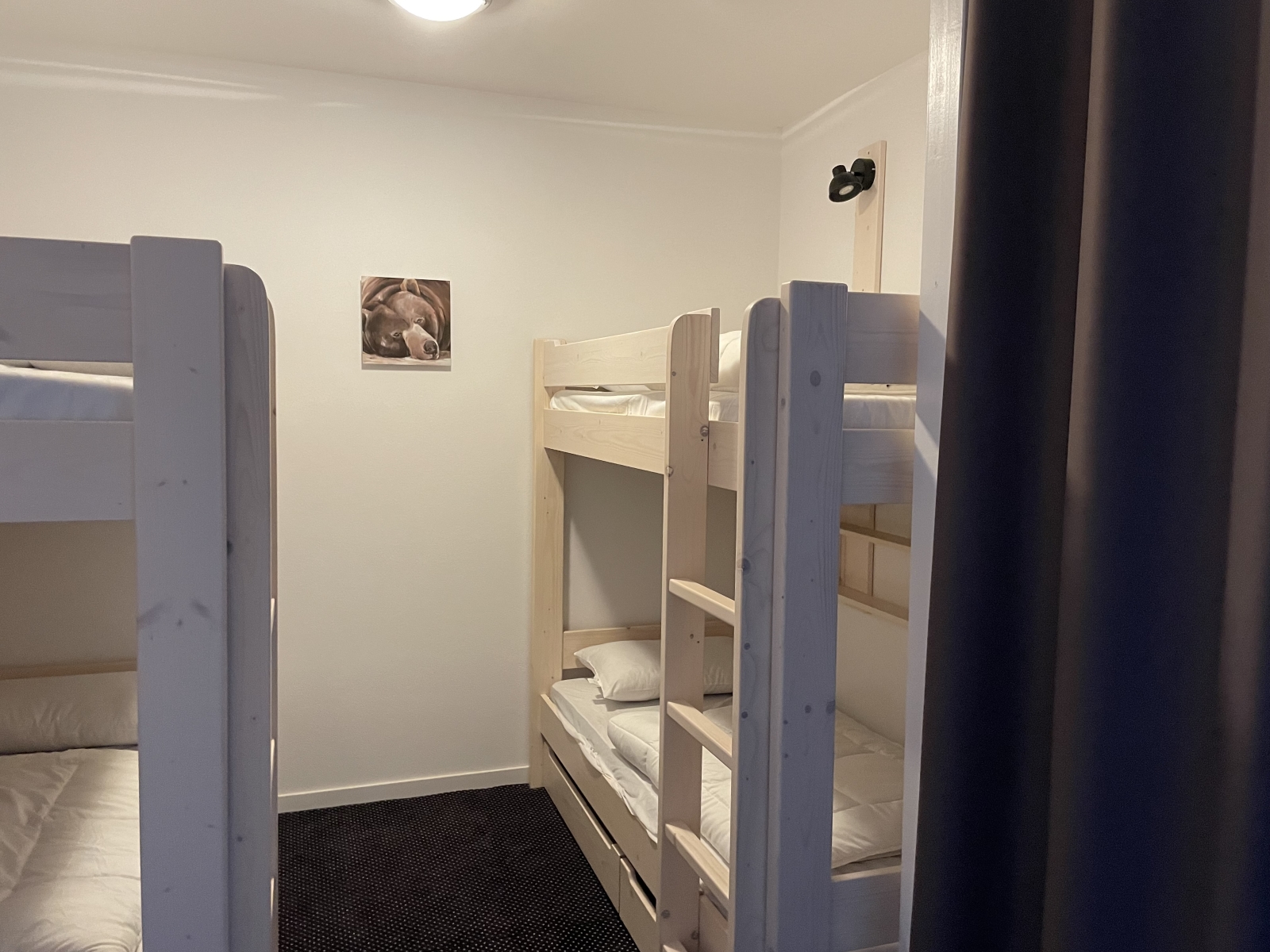 Entrée : coin montagne avec 2x2 lits superposés en 90.Salle de bain : lavabo, baignoire et sèche-cheveux.WC indépendant.Séjour : canapé lit 2 places en 160, télévision - Cuisine américaine : frigo avec bac conservateur, plaque vitro 4 feux, four, micro-ondes, lave-vaisselle, cafetière à filtre, grille-pain, robot.Chambre: lit 160, télévision avec salle d'eau: douche, lavabo et WC.