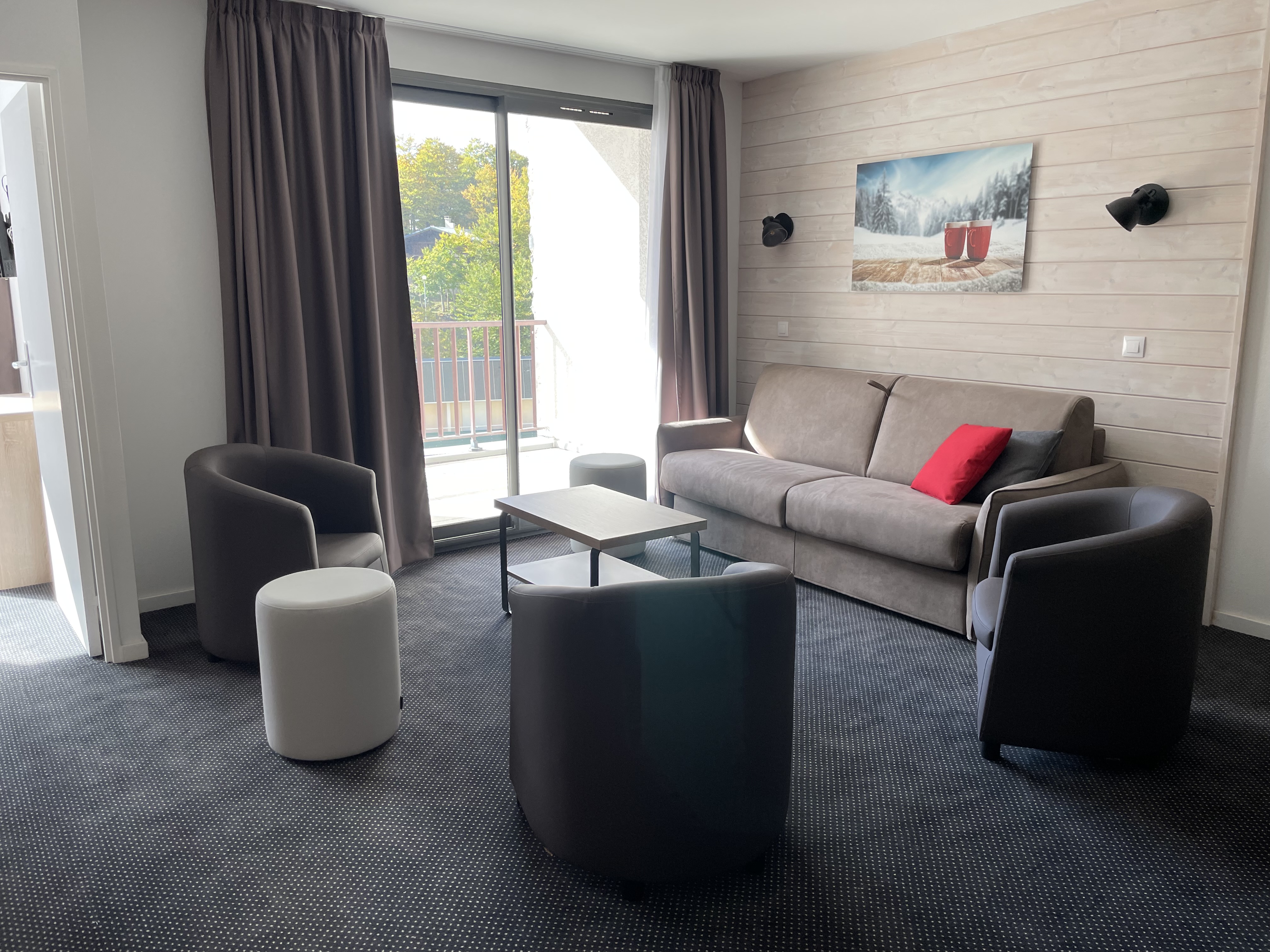 Appartement 2 pièces équipé et meublé pour 8 personnes, de 66m², exposé Sud-Ouest, vue montagne et station, au 3°étage avec terrasse.