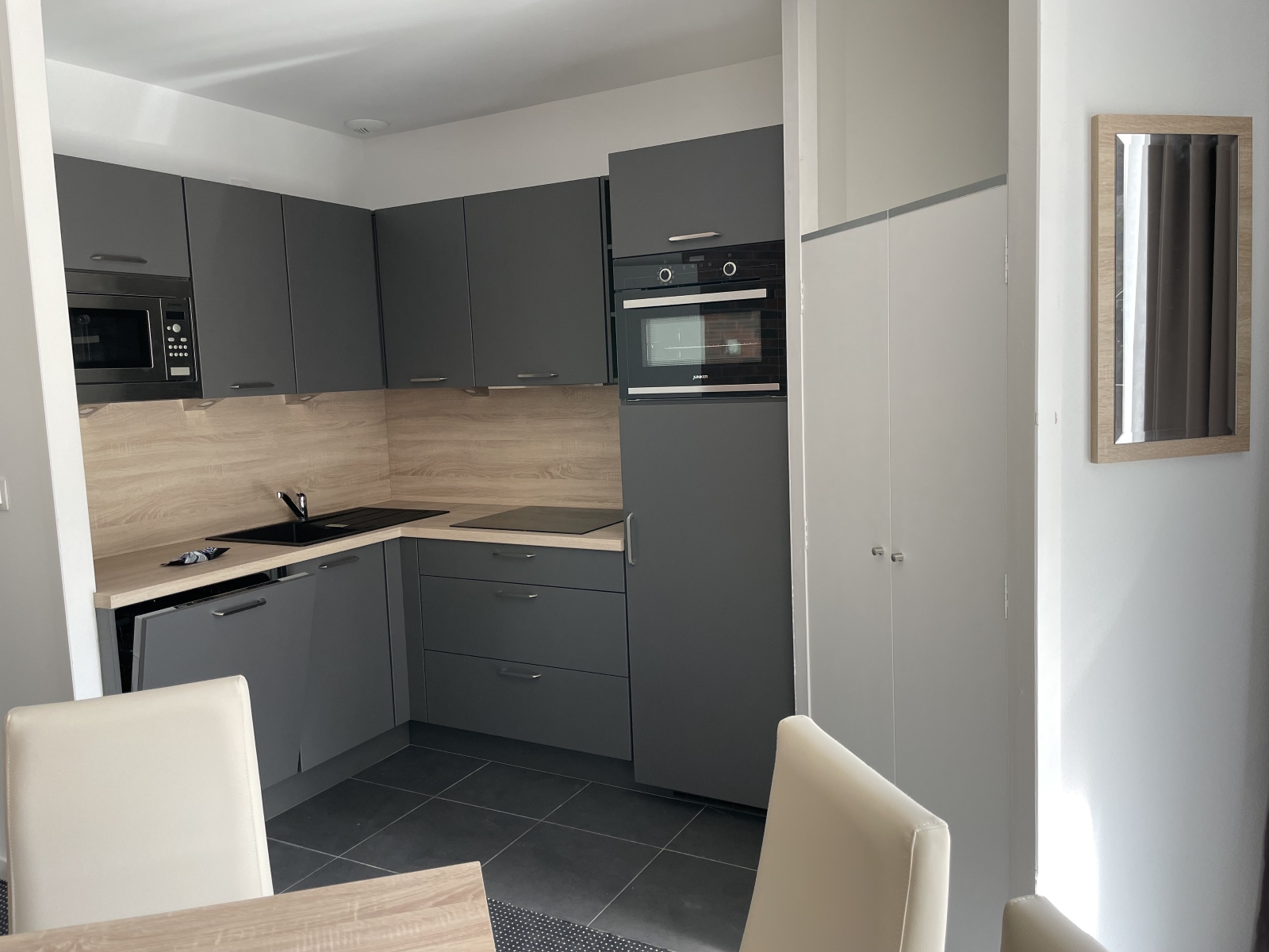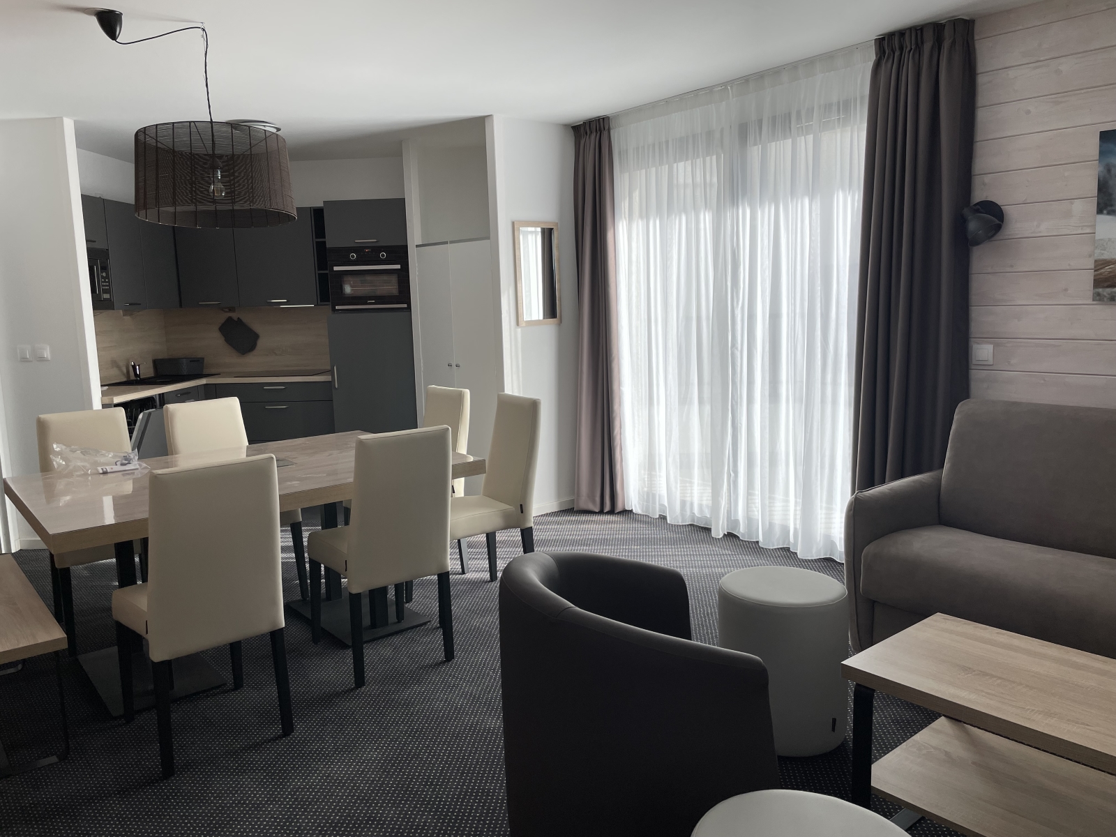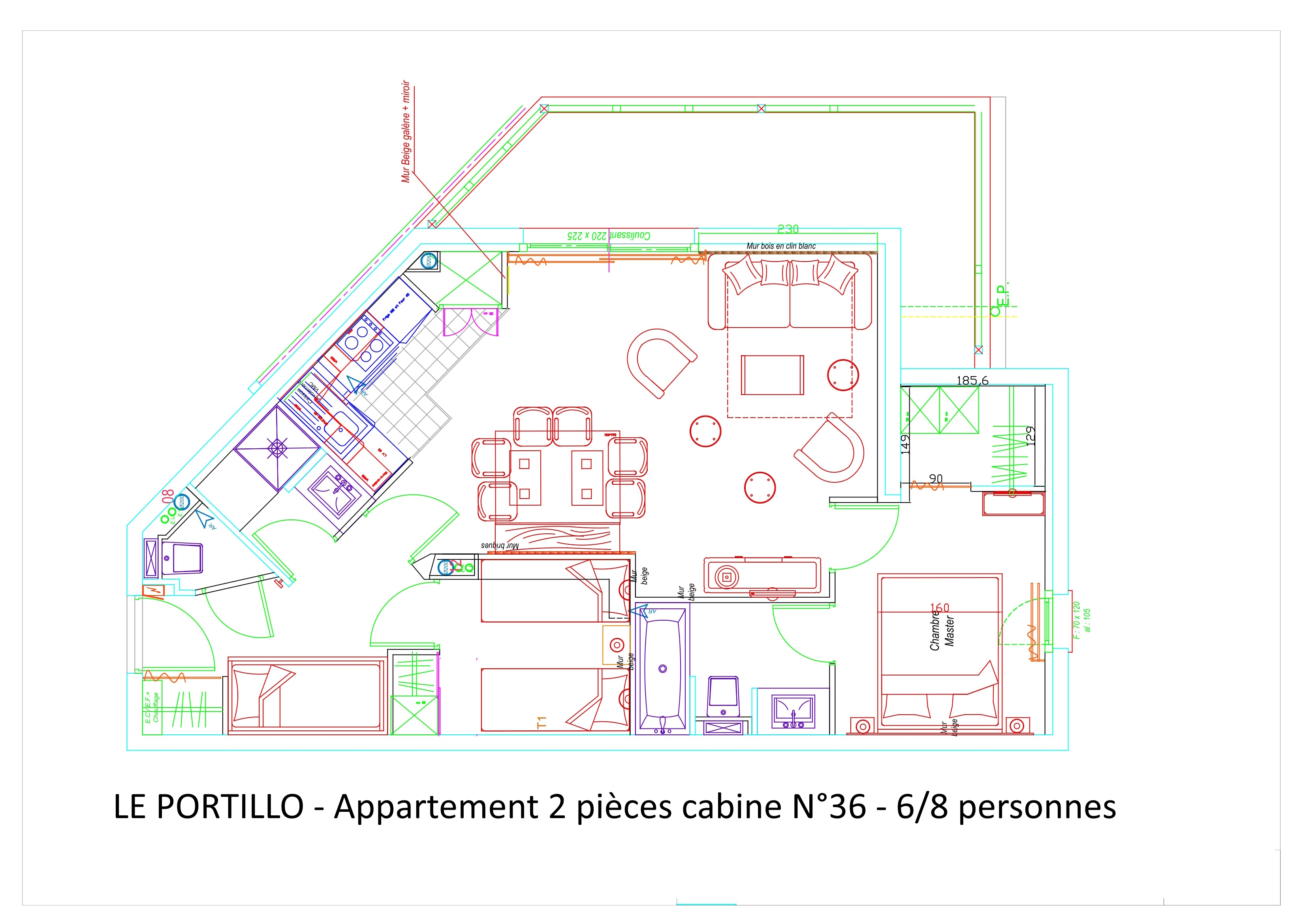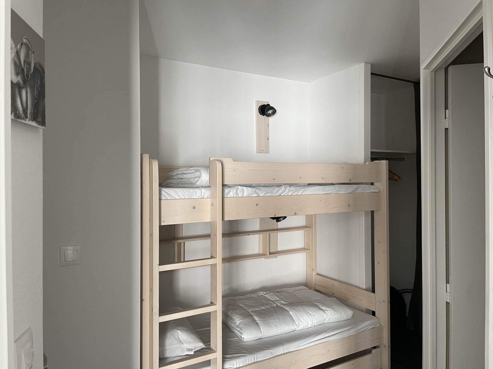Appartement 2 pièces cabine équipé et meublé pour 8 personnes, de 57 m², exposé Sud-Ouest, vue montagne et station, au 3°étage avec terrasse.Entrée : coin montagne avec 2 lits superposés en 90.Salle d'eau : douche, lavabo. WC indépendant. Cabine (chambre sans fenêtre) : 2 lits 80. Séjour : canapé lit 2 places en 160, télévision - Cuisine américaine : frigo avec bac conservateur, plaque vitro 4 feux, four, micro-ondes, lave-vaisselle, cafetière à filtre, grille pain, bouilloire, robot.Chambre : lit 160 avec salle de bain : baignoire, lavabo, WC, et sèche- cheveux .