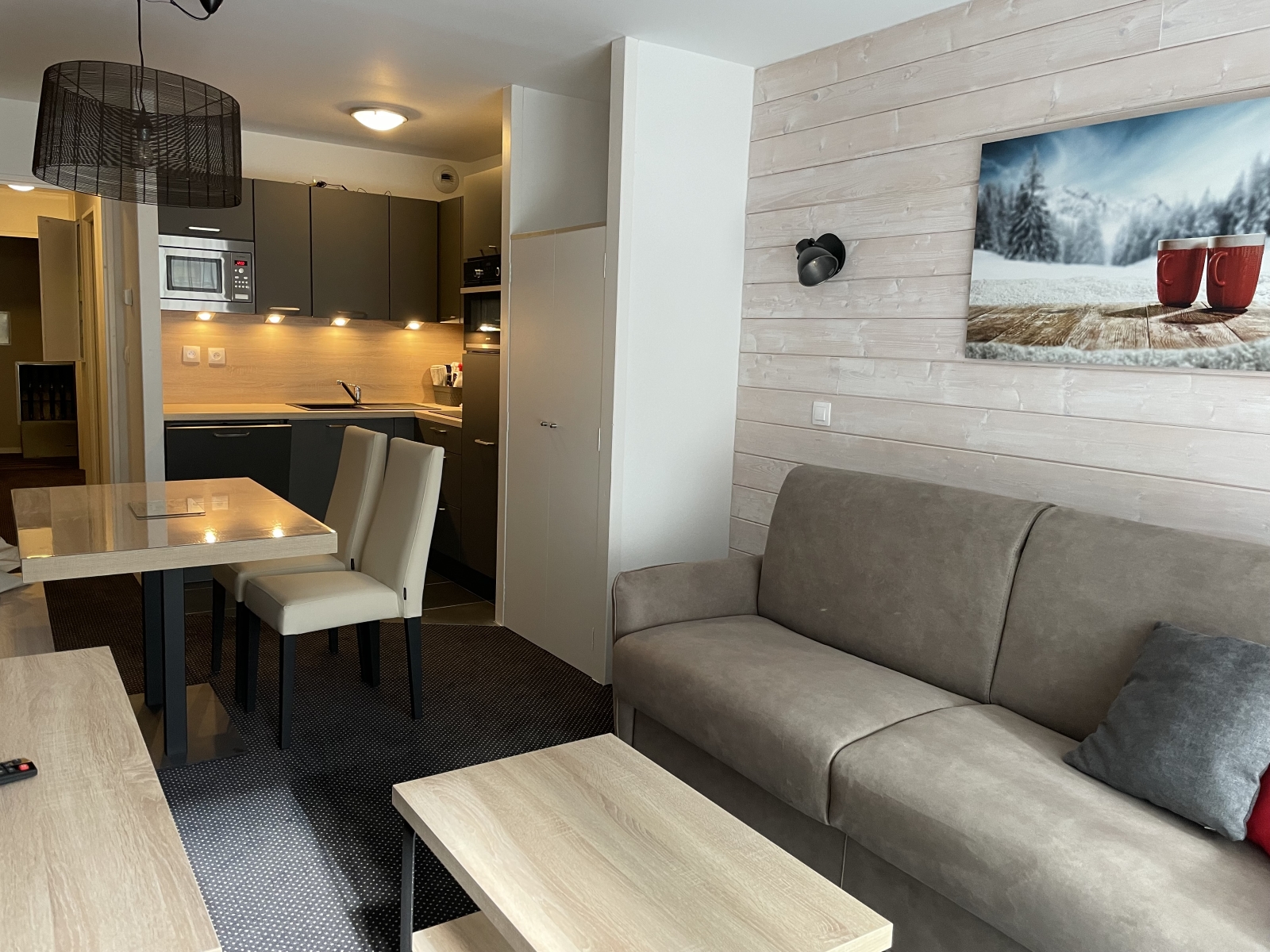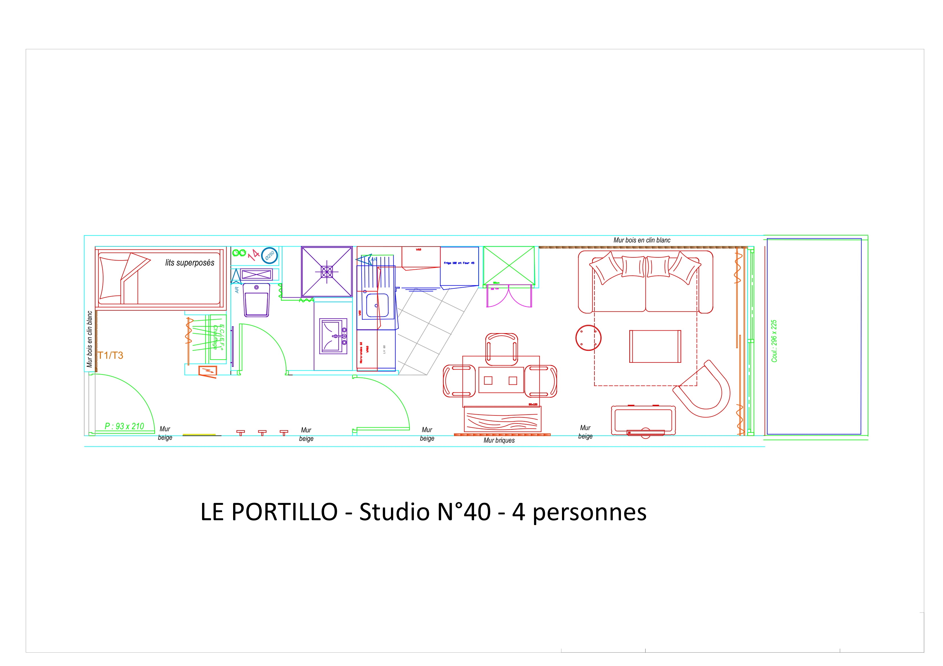 Studio équipé et meublé pour 4 personnes, de 29 m², exposé Sud-Ouest, vue pistes montagne, situé au 3°étage avec balcon. Entrée : coin montagne avec 2 lits superposés en 90.Salle d'eau : lavabo, douche, WC et sèche cheveux.Séjour : canapé lit 2 places en 160, télévision - Cuisine américaine : frigo avec bac conservateur, plaque vitro 4 feux, four, four micro-ondes, lave-vaisselle, cafetière à filtre, grille-pain, bouilloire, robot.