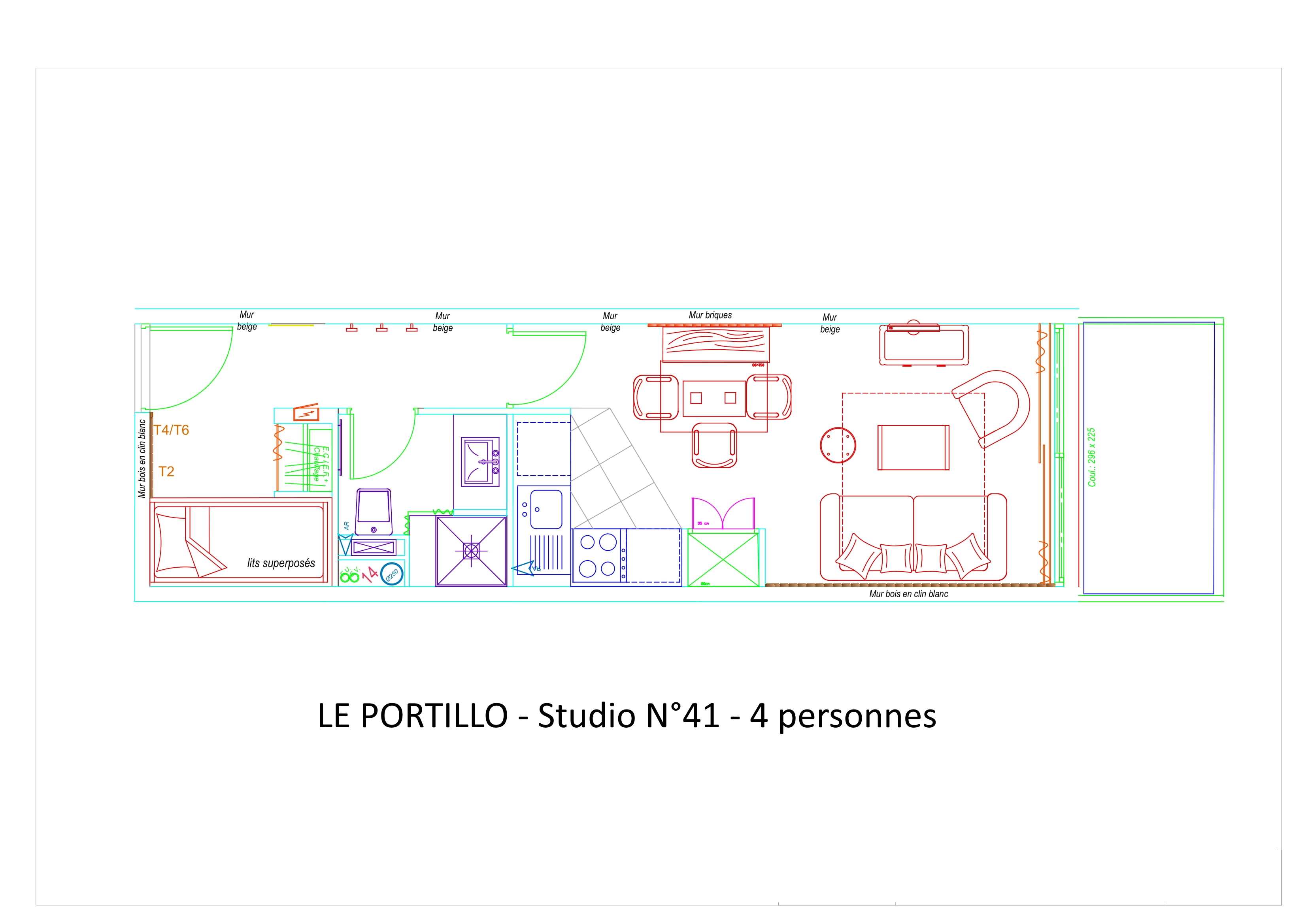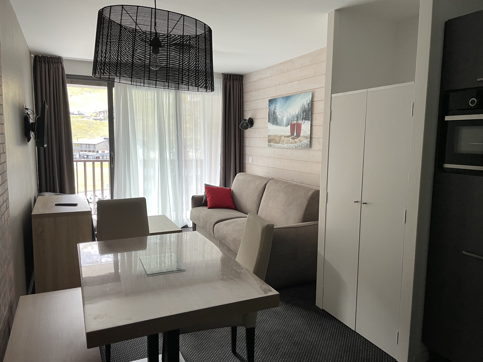 Studio équipé et meublé pour 4 personnes, 28 m², exposé Sud-Ouest, vue pistes et montagne, situé au 3°étage avec balcon. Entrée : coin montagne avec 2 lits superposés en 90.Salle d'eau : lavabo, douche, WC et sèche cheveux.Séjour : canapé lit 2 places en 160, télévision - Cuisine américaine : frigo avec bac conservateur, plaque vitro 4 feux, four, four micro-ondes, lave-vaisselle, cafetière à filtre, grille-pain, bouilloire, robot.