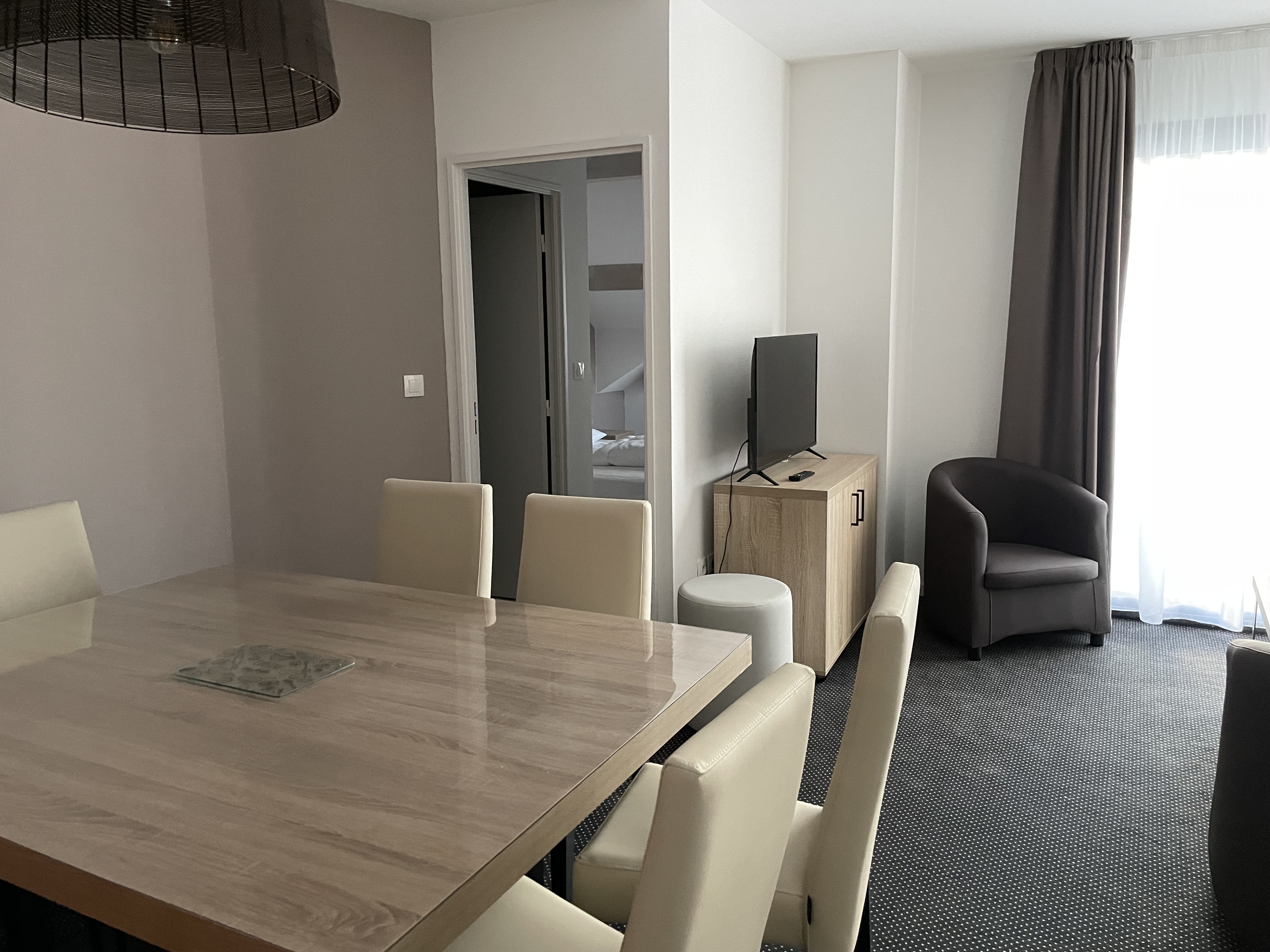 Appartement 2 pièces équipé et meublé pour 8 personnes, 56m², exposé Sud-Ouest, vue montagne et station, au 4°étage, terrasse.Entrée : coin montagne avec 2 lits superposés en 90.Salle de bain : lavabo, baignoire et sèche-cheveux.WC indépendant.Séjour : canapé-lit 2 places en 160, télévision - Cuisine américaine : frigo avec bac conservateur, plaque vitro 4 feux, four, micro-onde, lave-vaisselle, cafetière à filtre, grille pain, bouilloire, robot.Chambre: lit 160, télévision et salle d'eau : douche, lavabo et WC.