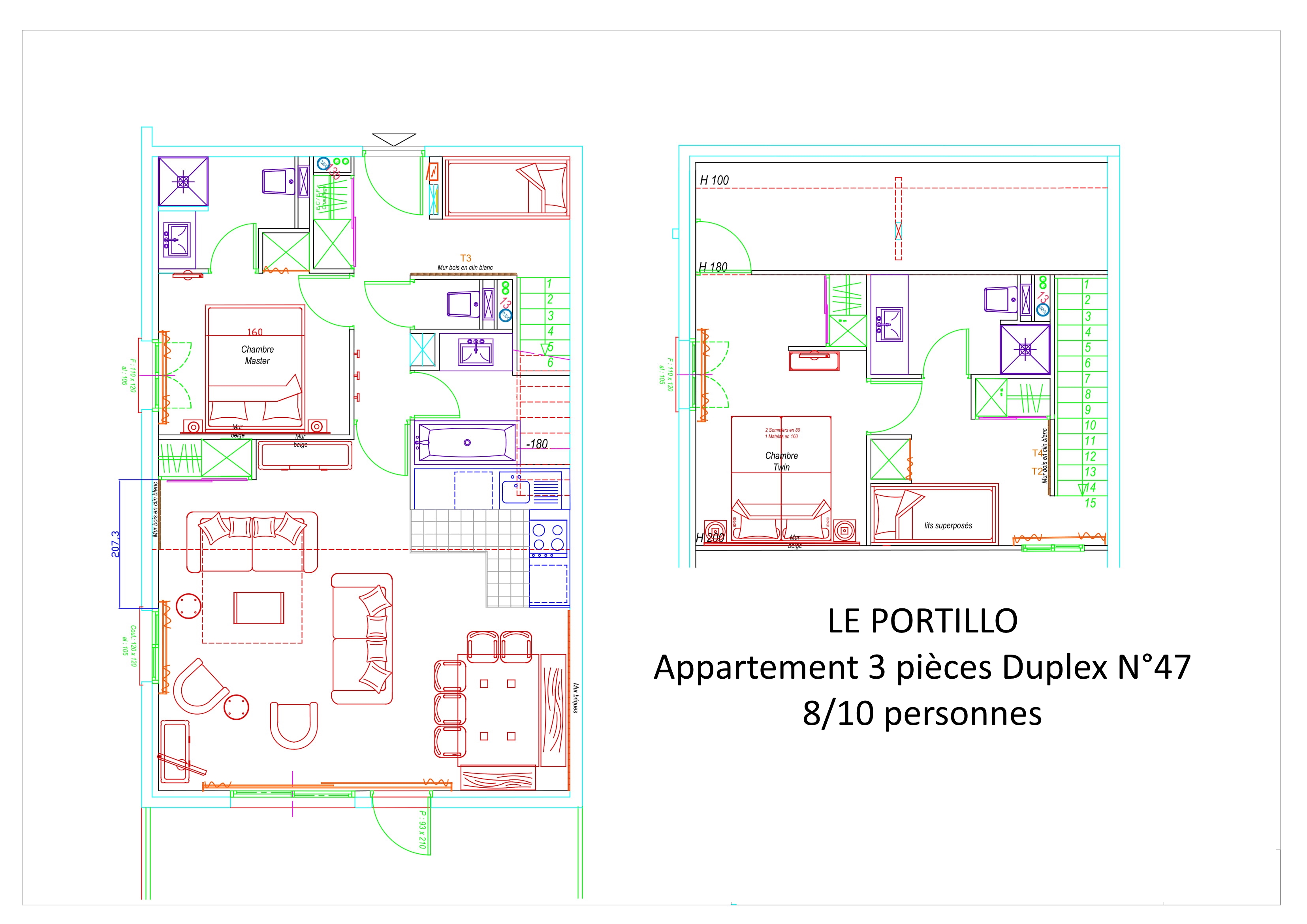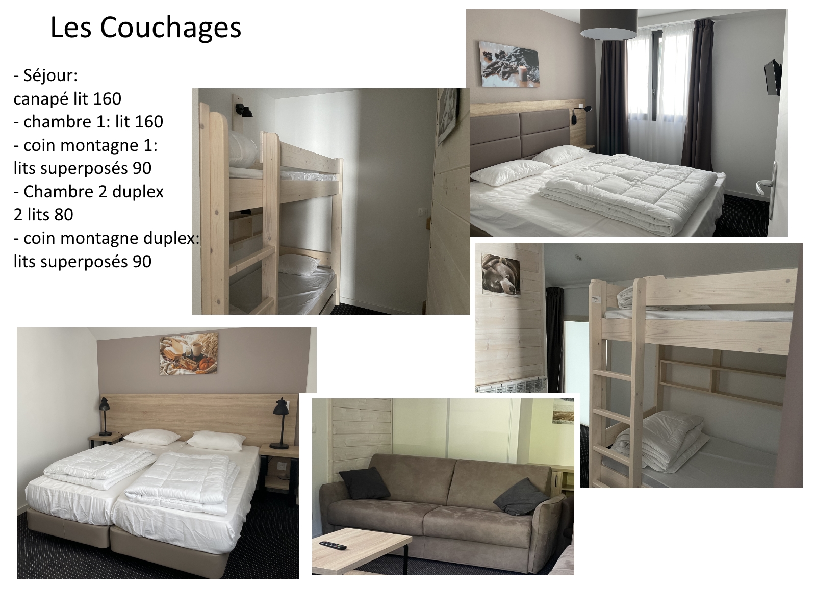 Appartement 3 pièces en duplex équipé et meublé pour 8/10 personnes, 87m², exposé Sud-Ouest, vue pistes, situé 4°étage avec terrasse.Entrée : Coin montagne n°1 avec 2 lits superposés en 90.Salle de bain : lavabo, baignoire et sèche-cheveux.WC indépendant.Chambre 1 : lit en 160,télévision et salle d'eau : douche, lavabo et WC.Séjour : canapé lit 2 places en 160, télévision - Cuisine américaine : frigo avec bac conservateur, plaque vitro 4 feux, four, micro-ondes, lave-vaisselle,cafetière à filtre, grille- pain, bouilloire, robot. Duplex : Coin montagne n°2 : lits superposés en 90.Salle d'eau: douche, lavabo et WC.