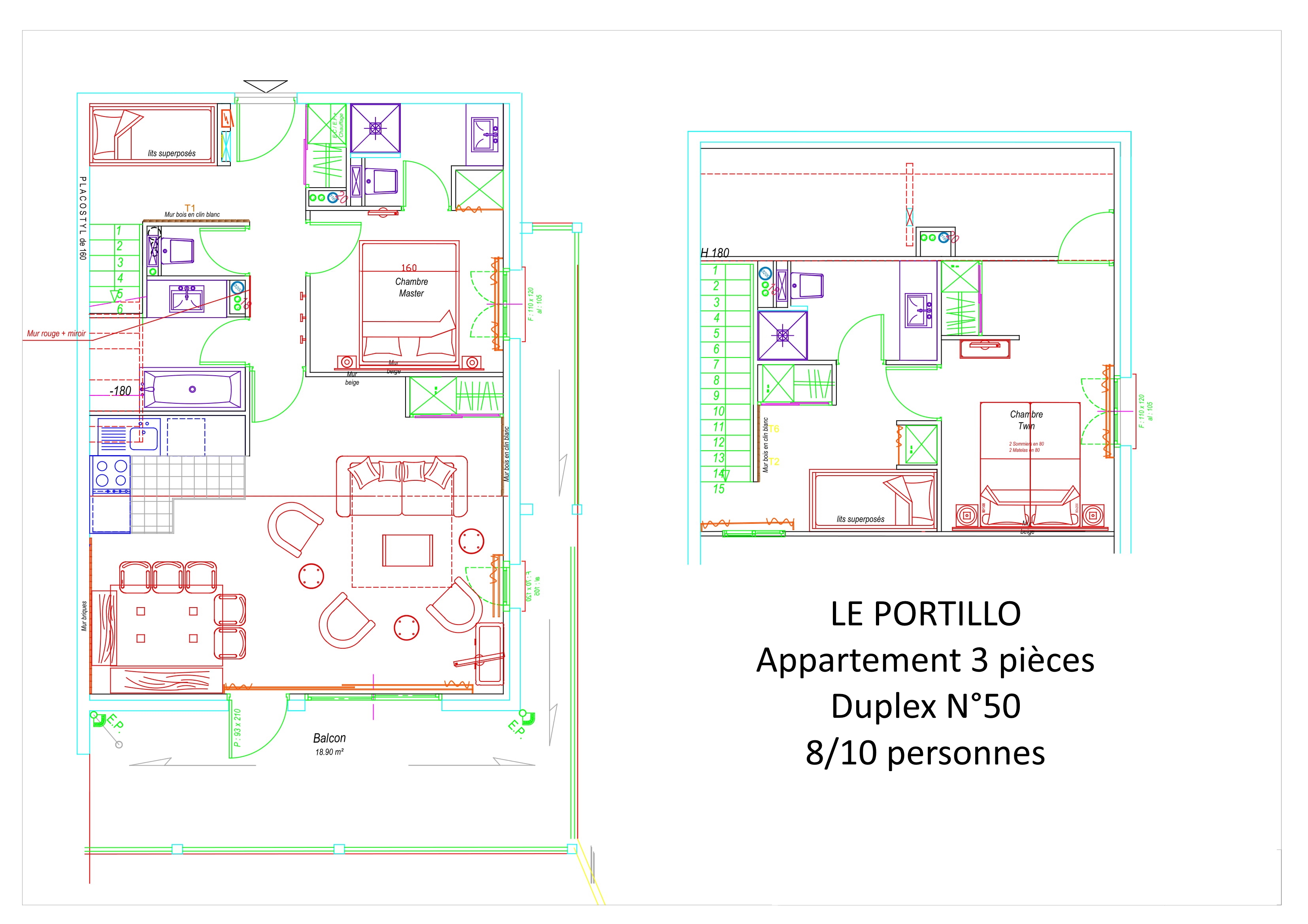 Appartement 3 pièces en duplex équipé et meublé pour 8/10 personnes, 80m², exposé Sud-Ouest, vue pistes, situé 4°étage avec terrasse.Entrée : Coin montagne n°1 avec 2 lits superposés en 90.Salle de bain : lavabo, baignoire et sèche-cheveux.WC indépendant.Chambre 1 : lit en 160, télévision et salle d'eau : douche, lavabo et WC.Séjour: canapé lit 2 places en 160, télévision - Cuisine américaine : frigo avec bac conservateur, plaque vitro 4 feux, four, four micro-ondes, lave-vaisselle, cafetière à filtre, grille-pain, bouilloire, robot. Duplex : Coin montagne n°2 avec lits superposés en 90.Salle d'eau : douche, lavabo et WC.Chambre 2 : 2 lits 80.