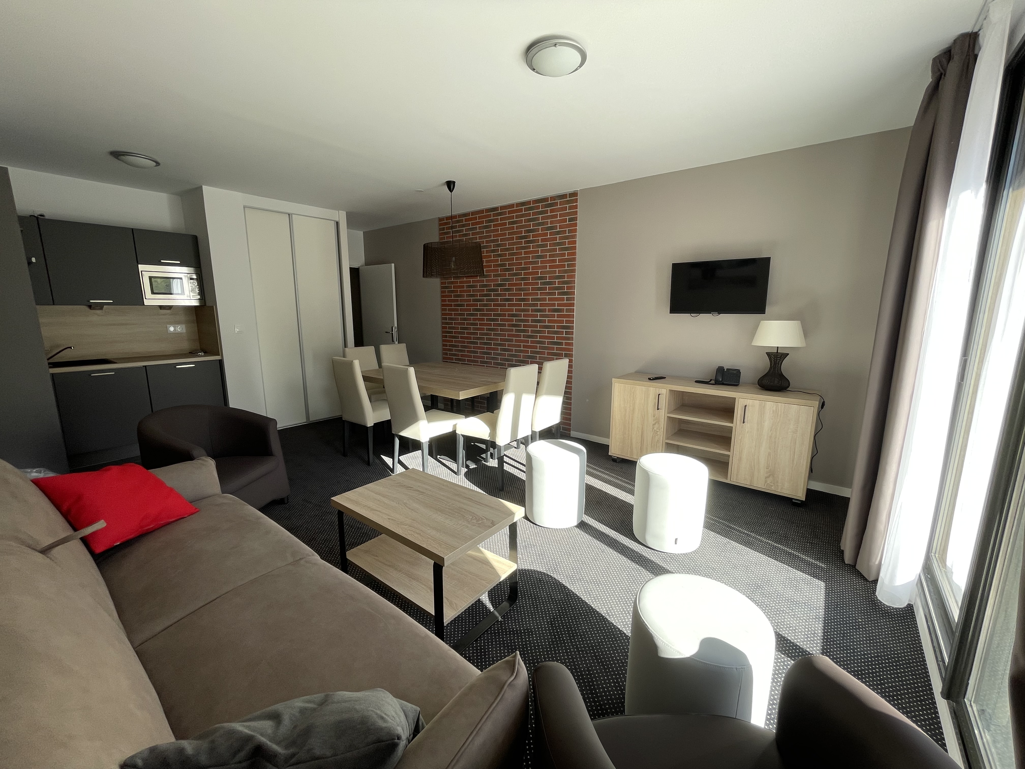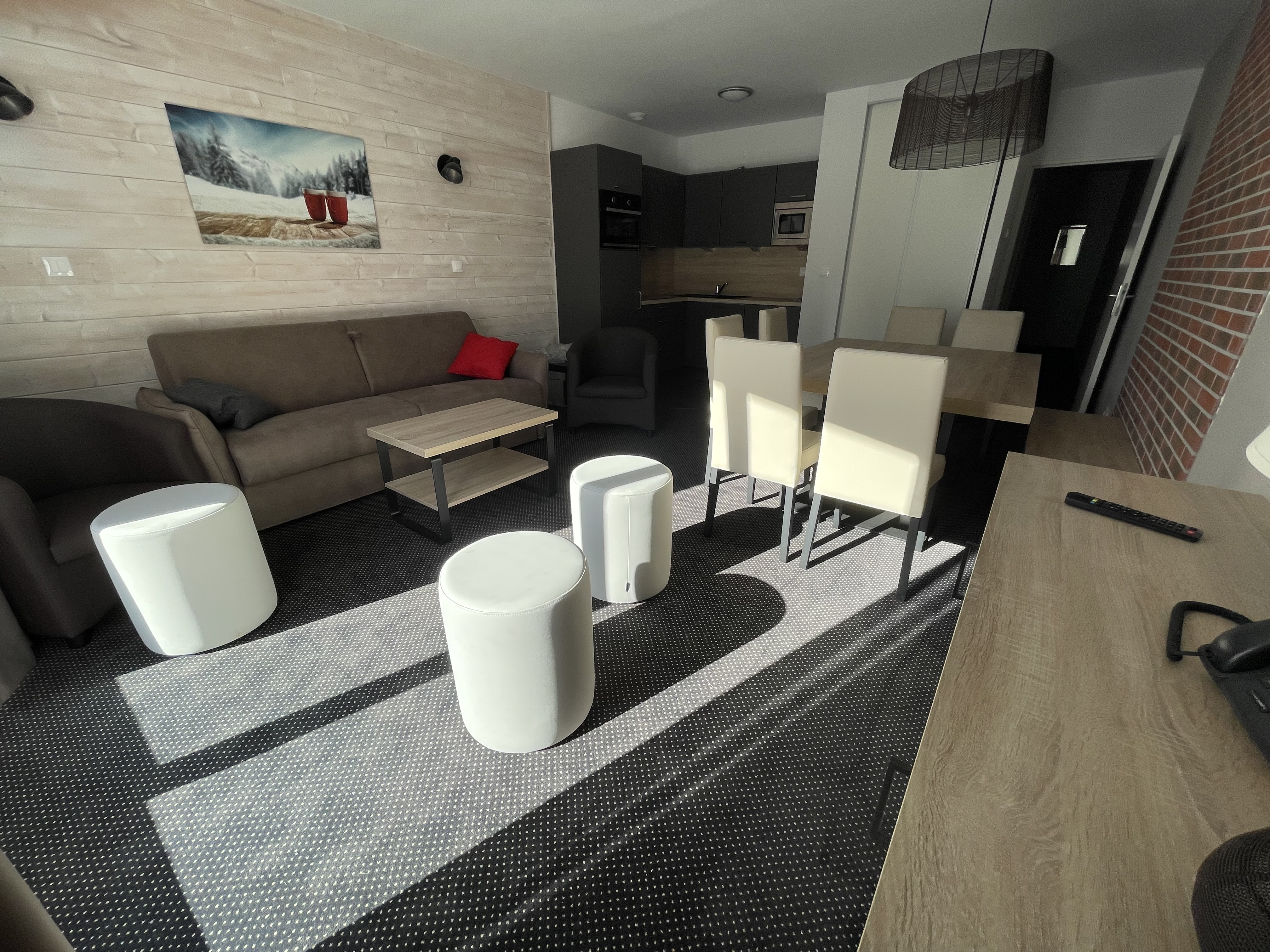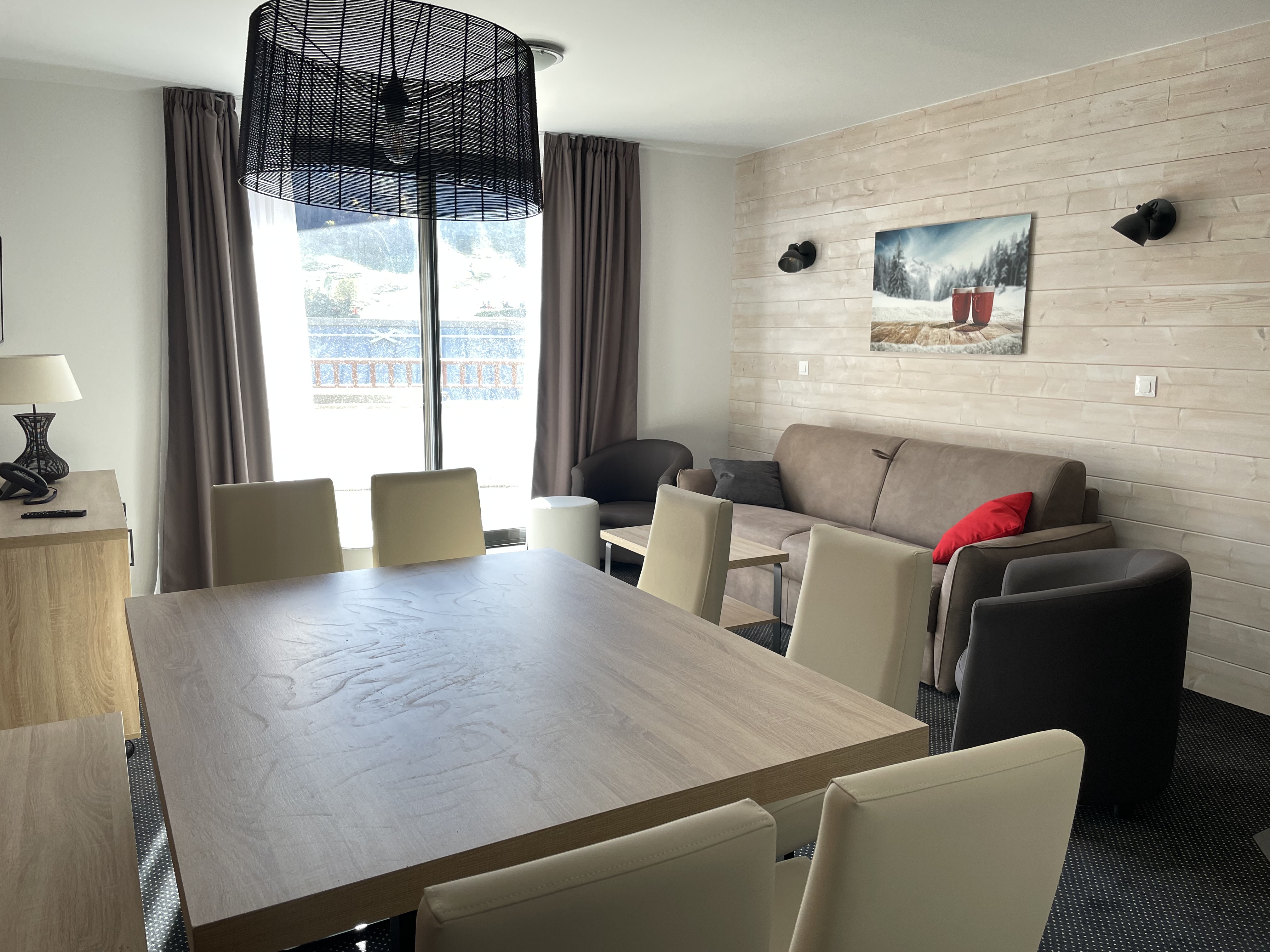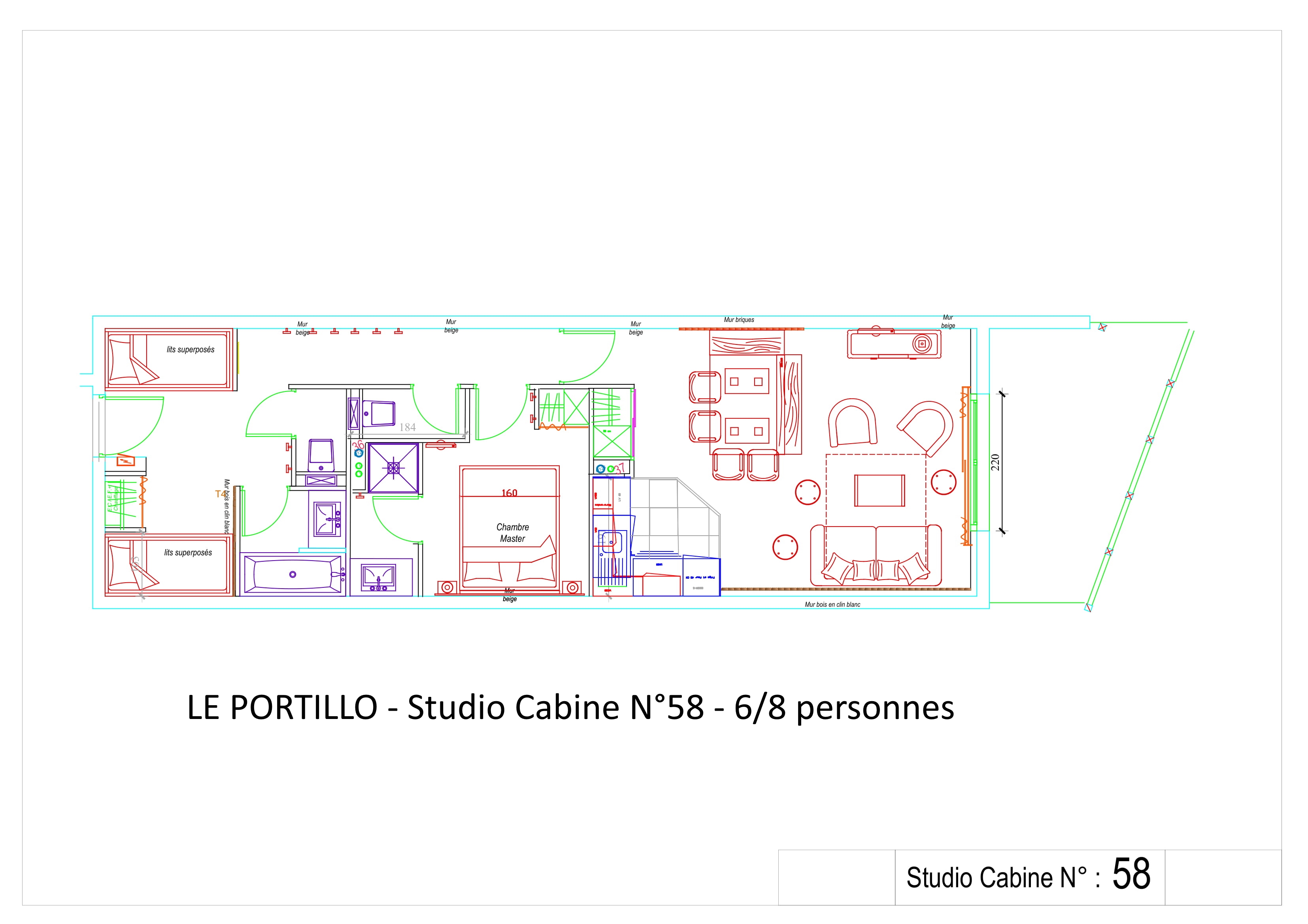 Studio cabine équipé et meublé pour 6/8 personnes, 58m², exposé Sud, vue pistes et montagne situé au 5°étage avec terrasse. Entrée : coin montagne avec 2*2 lits superposés en 90.Salle de bain : lavabo, baignoire et sèche-cheveux.2 WC indépendants.Cabine (chambre sans fenêtre) : 1 lit double 160, télévision et salle d'eau : douche, lavabo. Séjour : canapé-lit 2 places en 160. télévision - Cuisine américaine : frigo avec bac conservateur, plaque vitro 4 feux, four, four micro-ondes, lave-vaisselle, cafetière à filtre, grille-pain, bouilloire, robot.