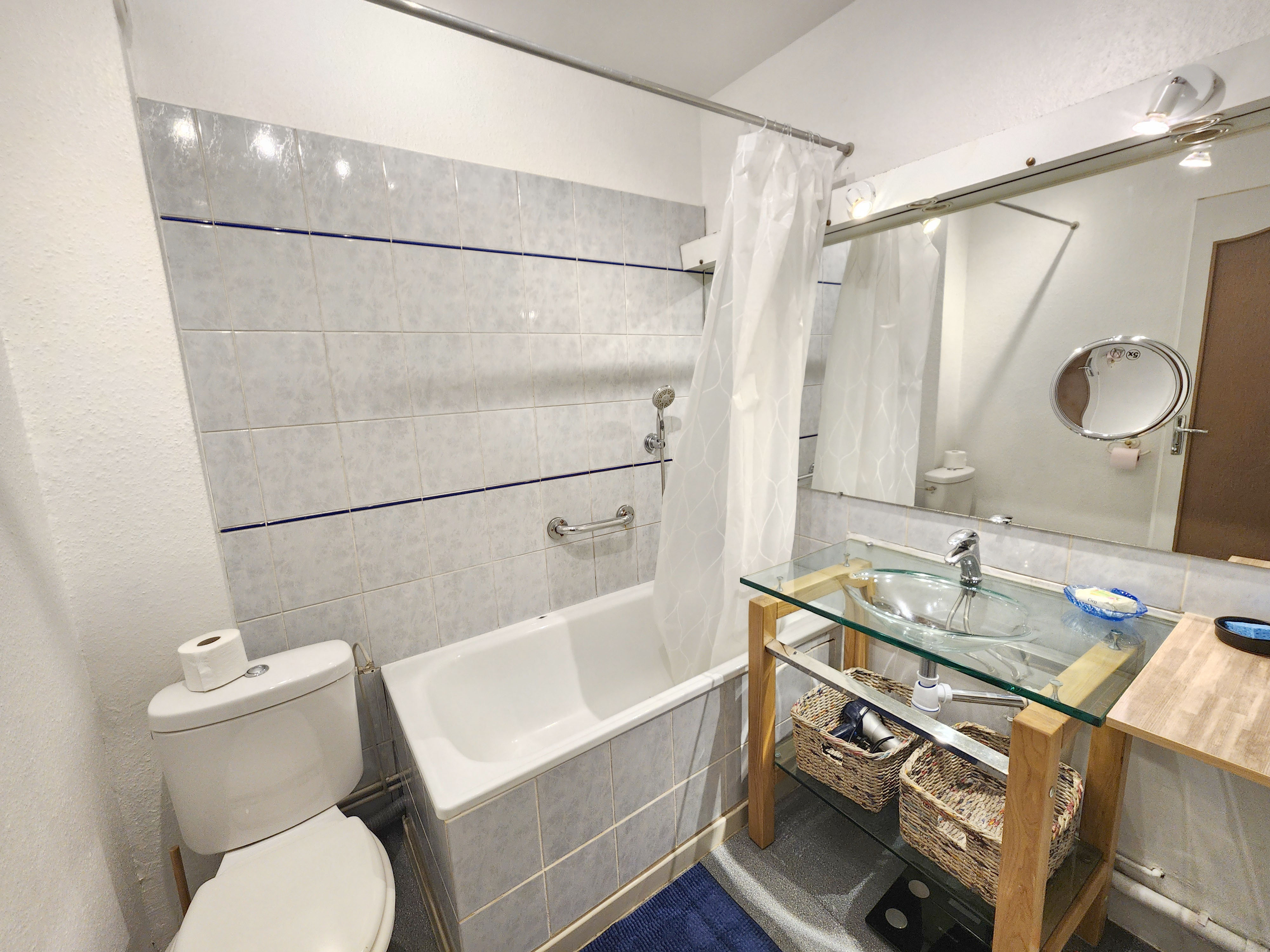 Salle de bains fonctionnelle : Equipée d'une baignoire, d'un lavabo, de WC, et d'un sèche-serviette soufflant neuf pour un confort optimal.