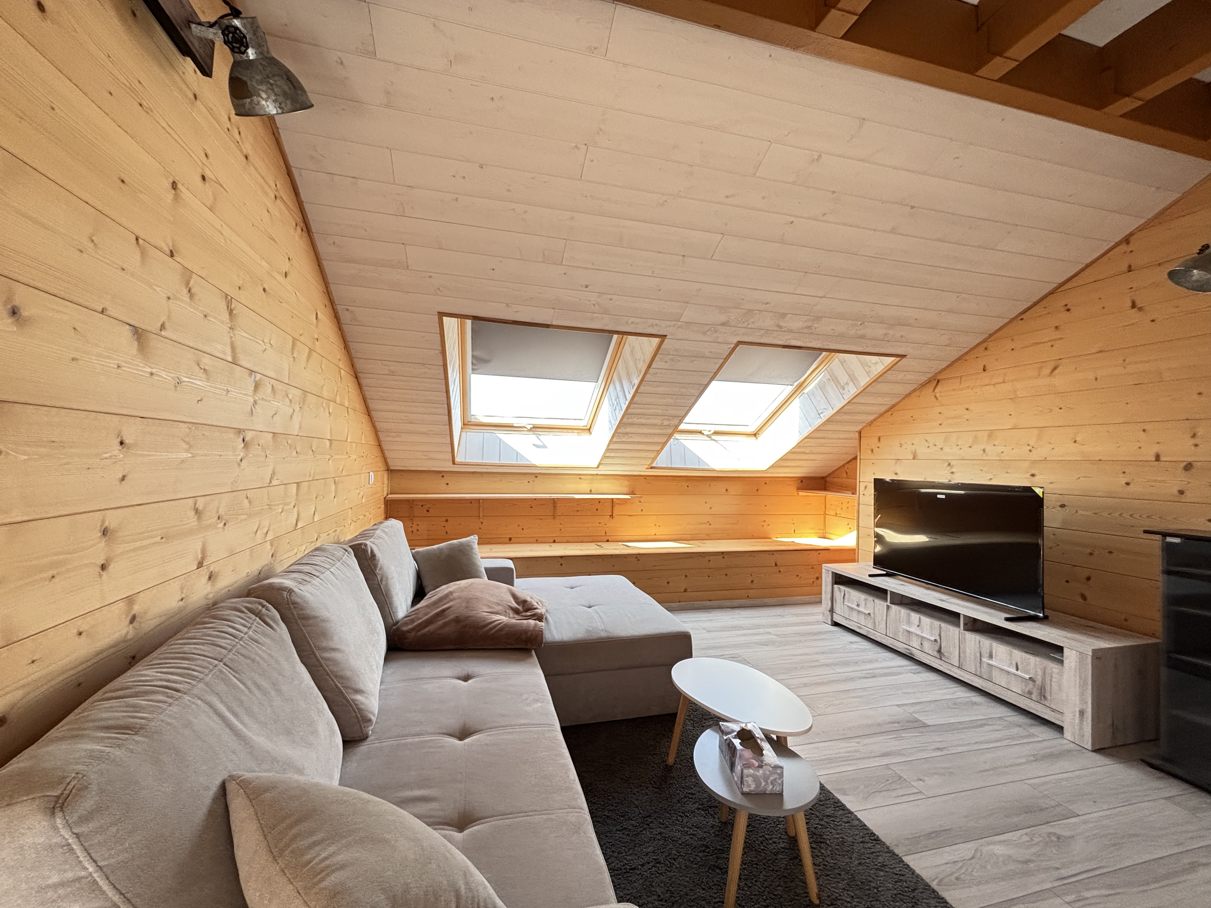 Deuxième mezzanine aménagée en salon cosy, équipée d'une télévision