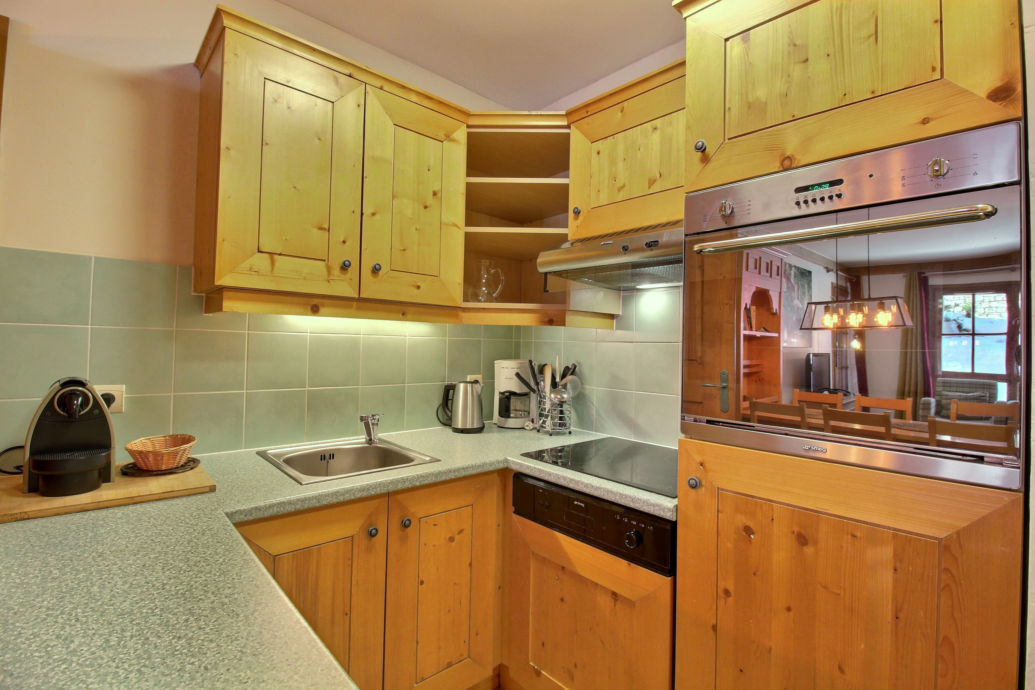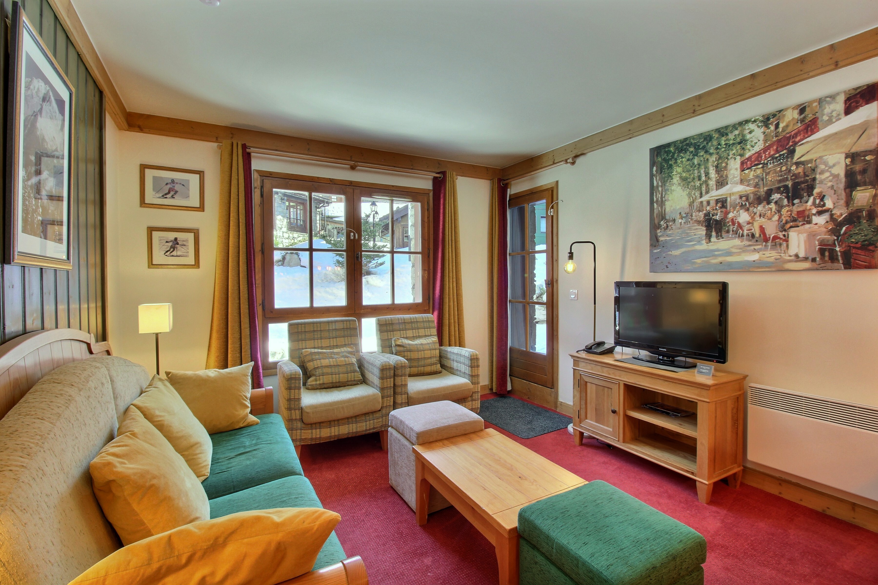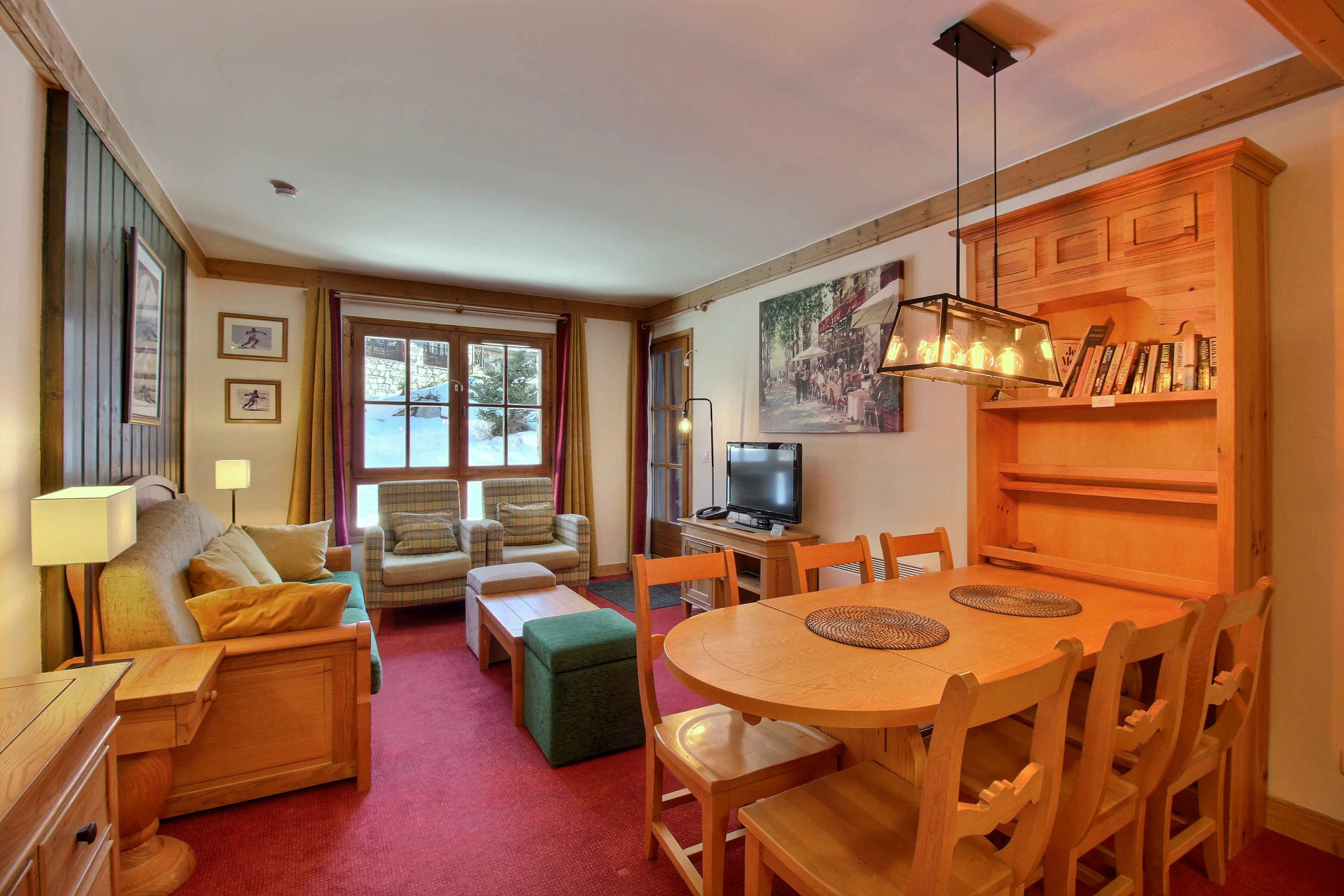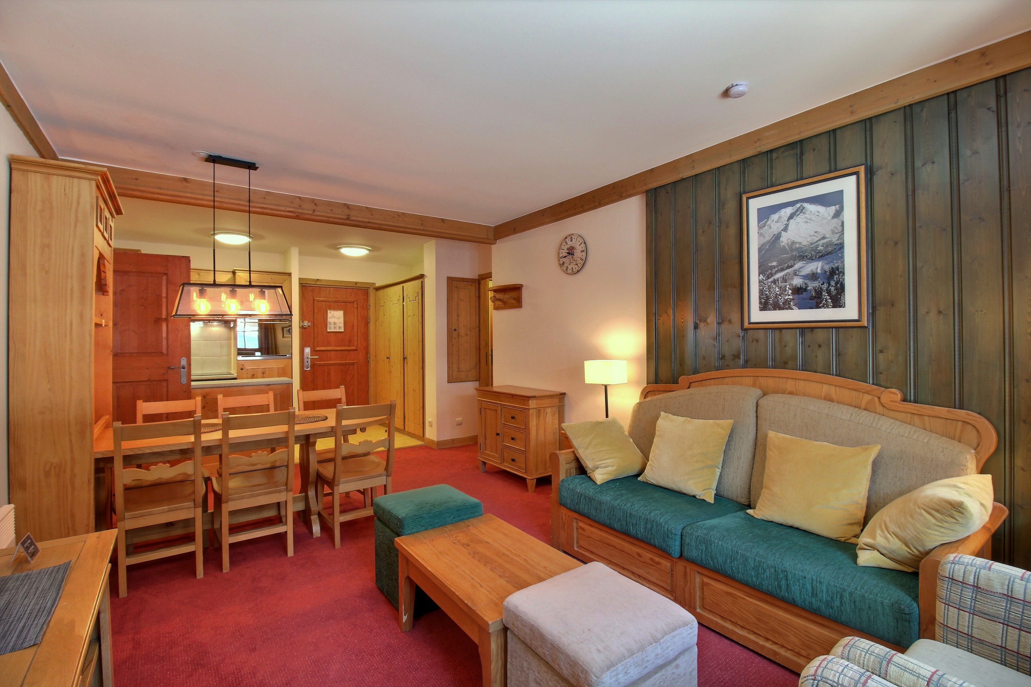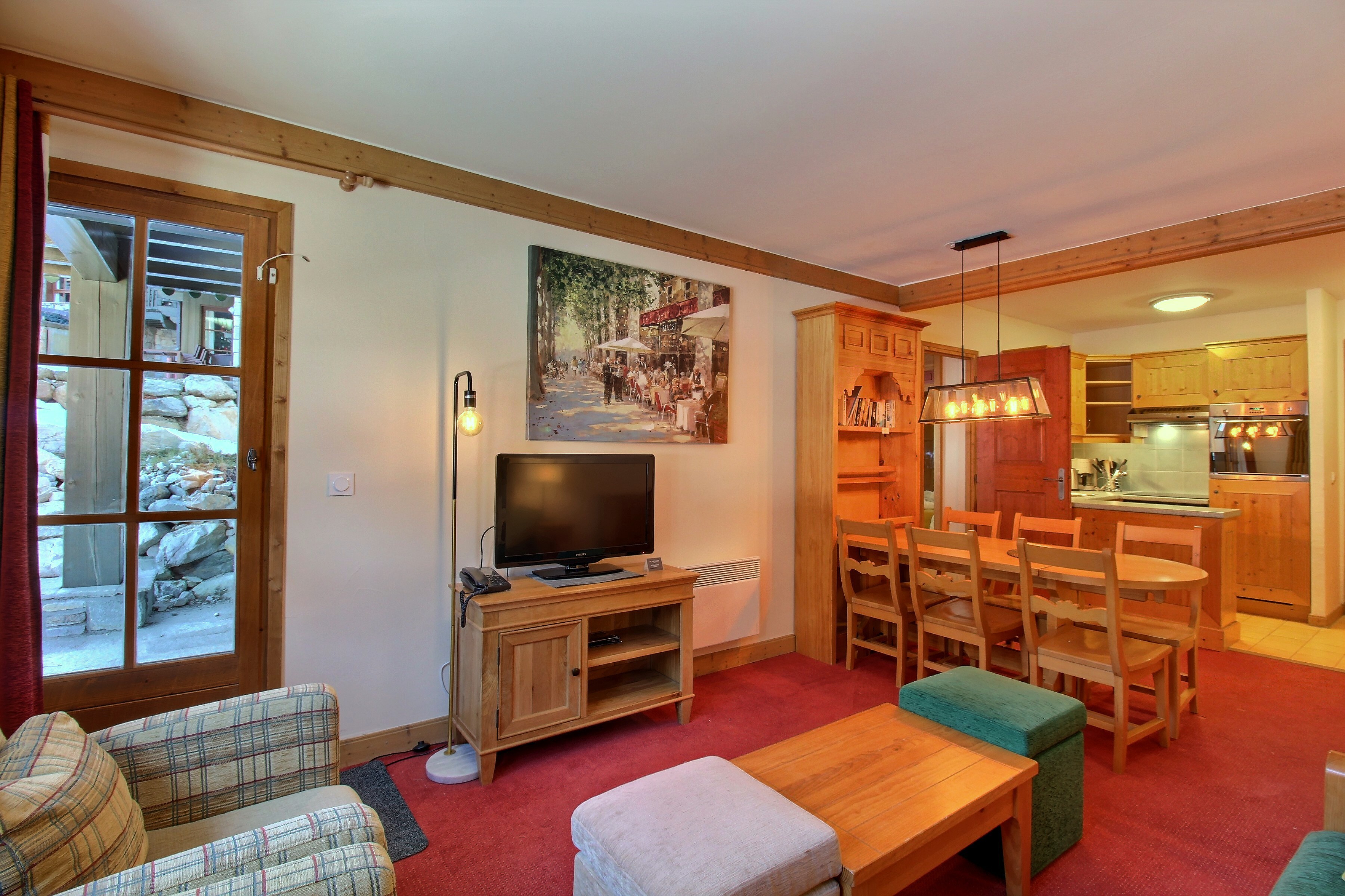 - D'une cuisine équipée, ouverte sur un salon lumineux avec un canapé convertible et accès à une terrasse de 23m2, offrant une vue sur les pistes de ski.
