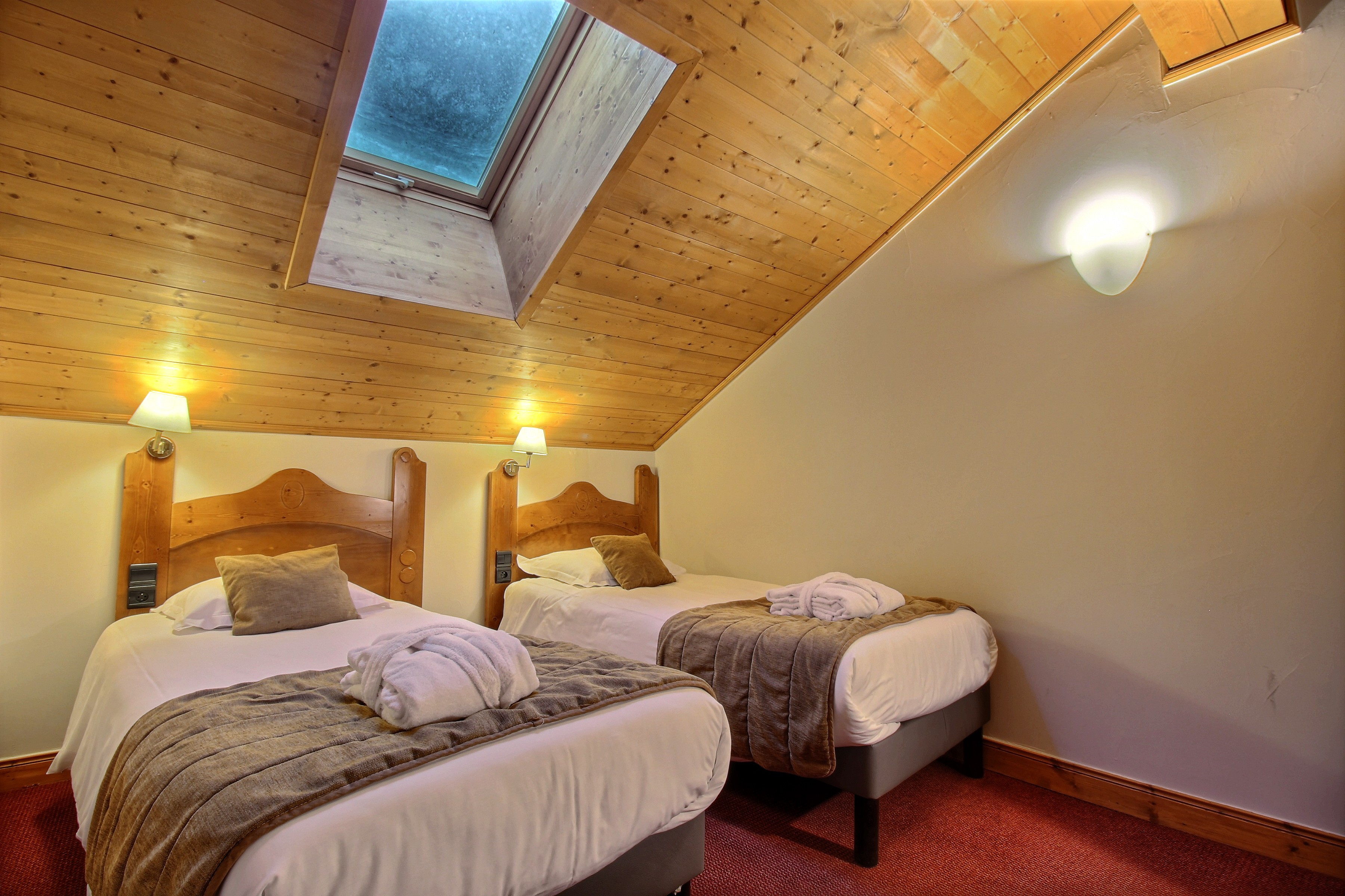 - D'une seconde chambre avec des volumes sous plafond, comprenant deux lits simples avec placards de rangement.