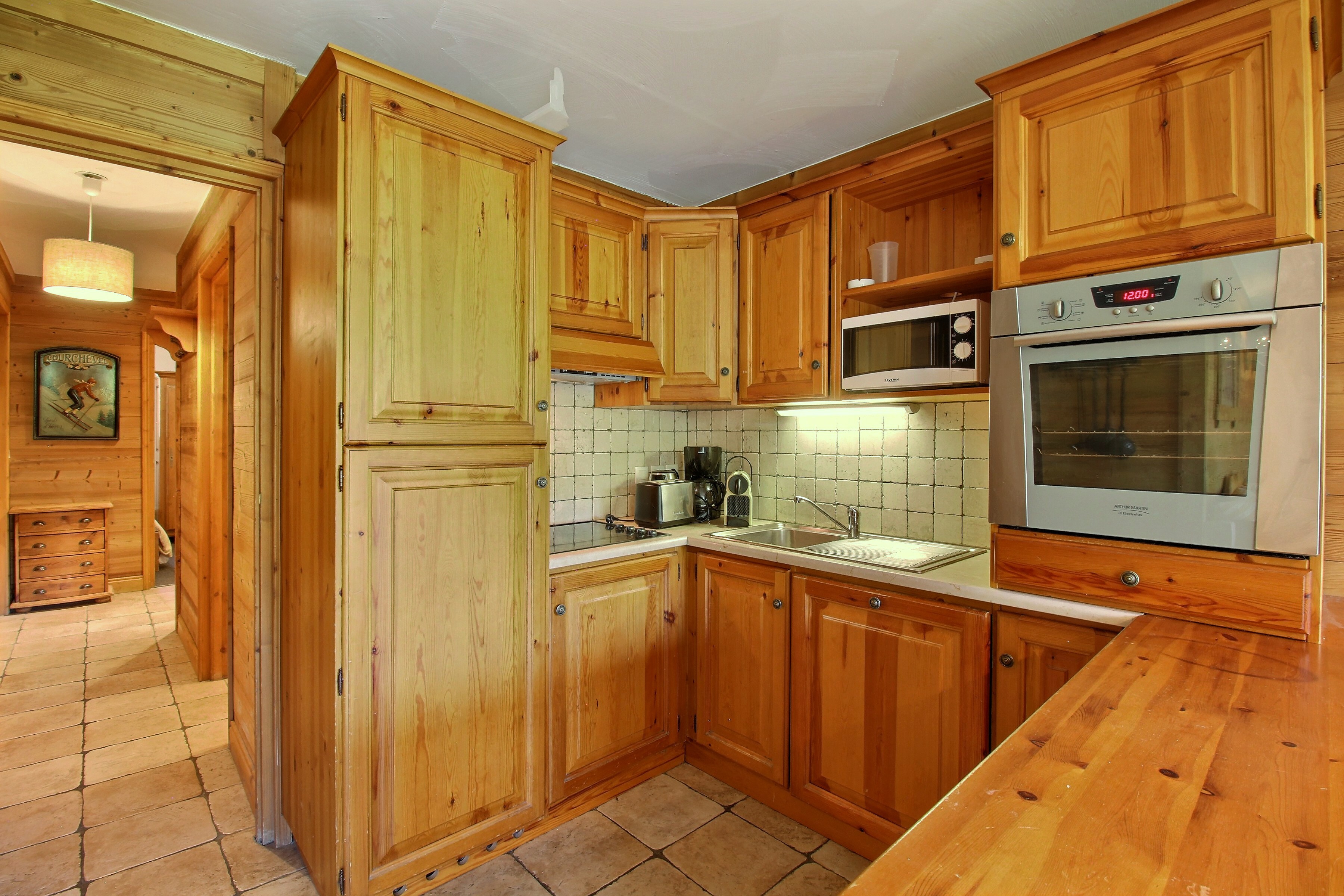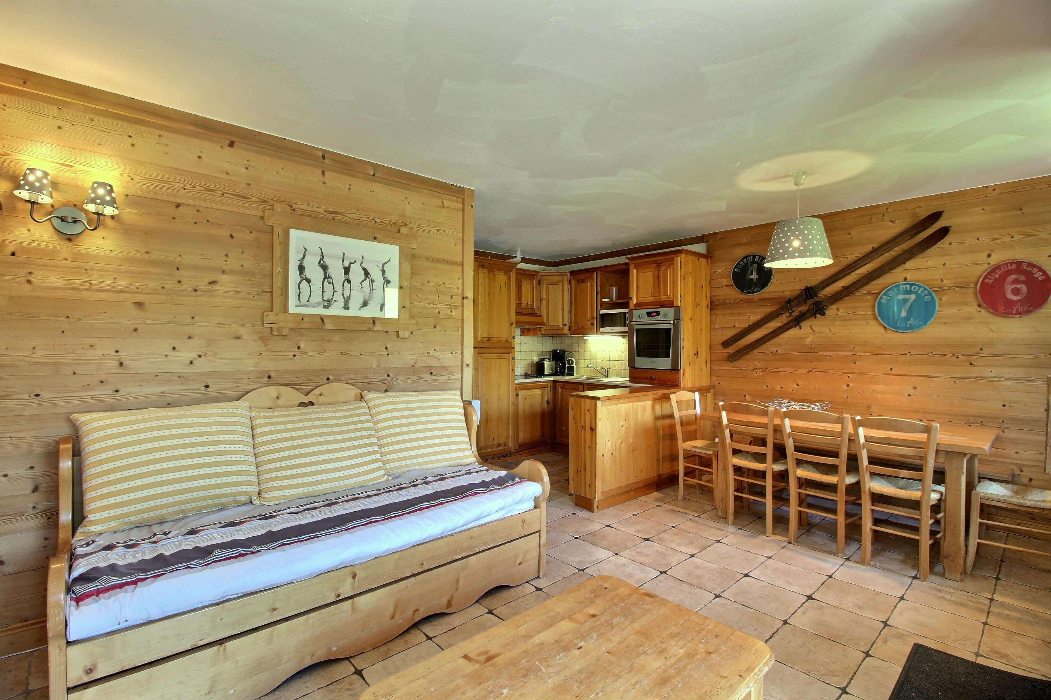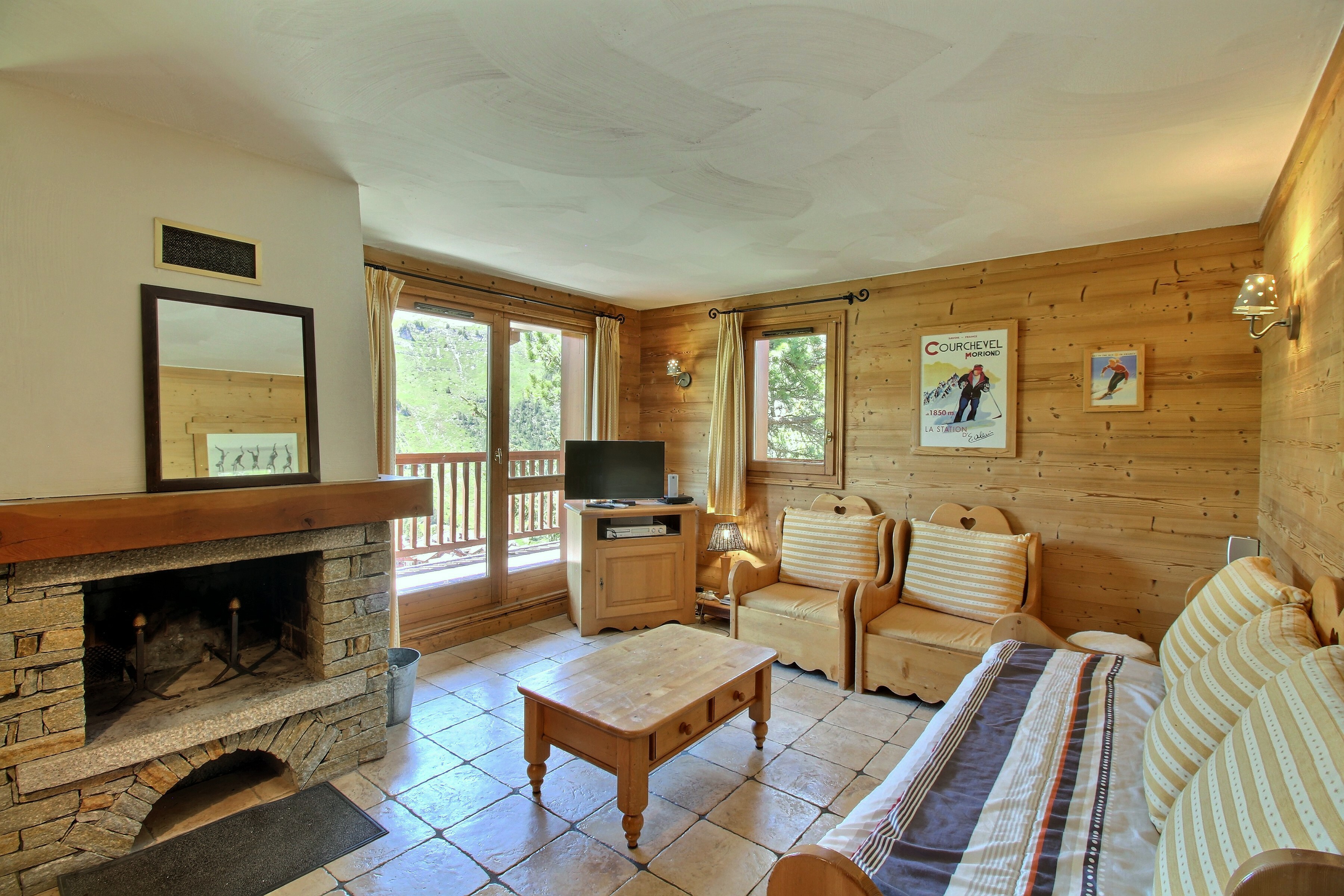 - D'une cuisine équipée, ouverte sur un salon lumineux avec cheminée, et accès à un balcon offrant une vue panoramique sur le domaine skiable.