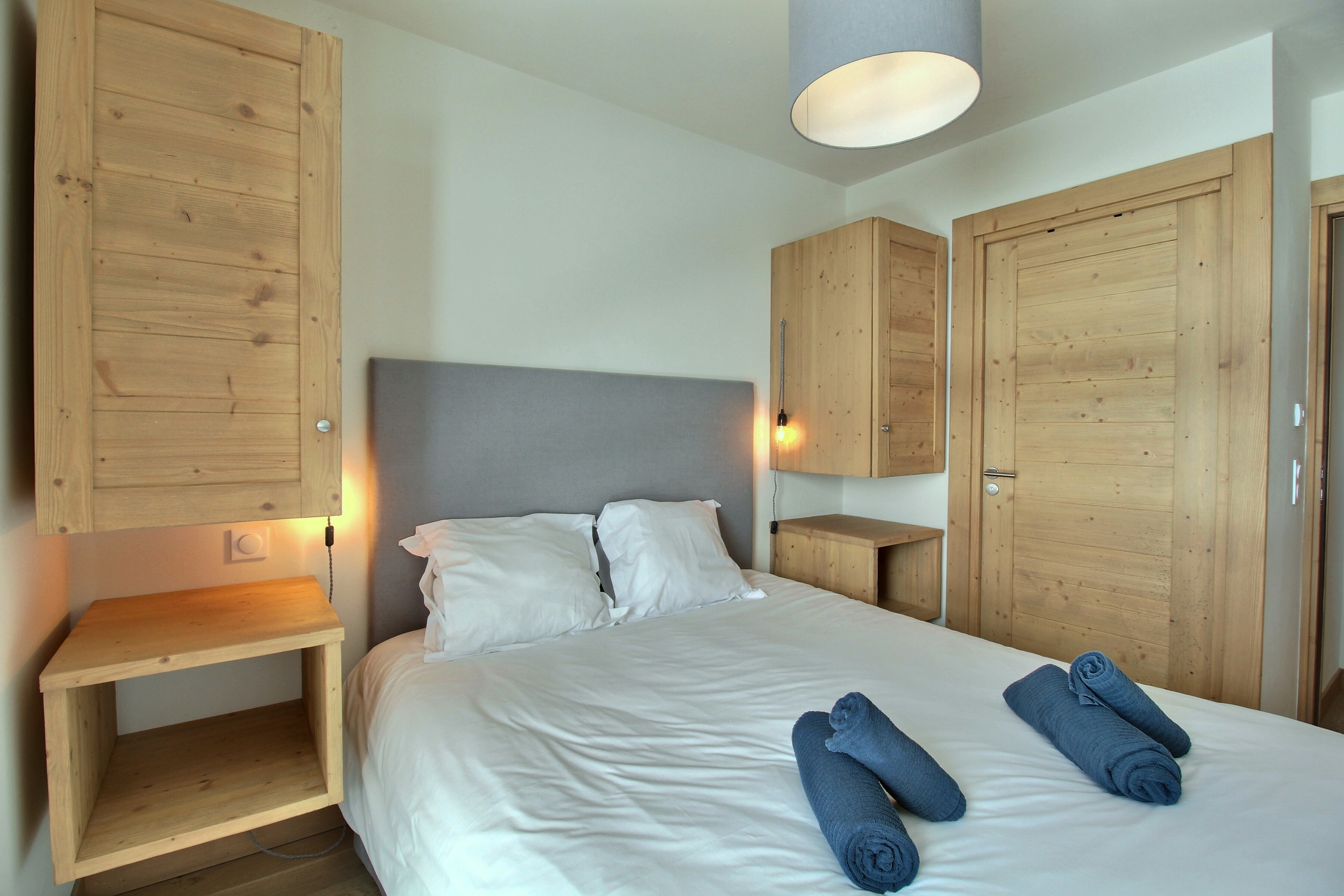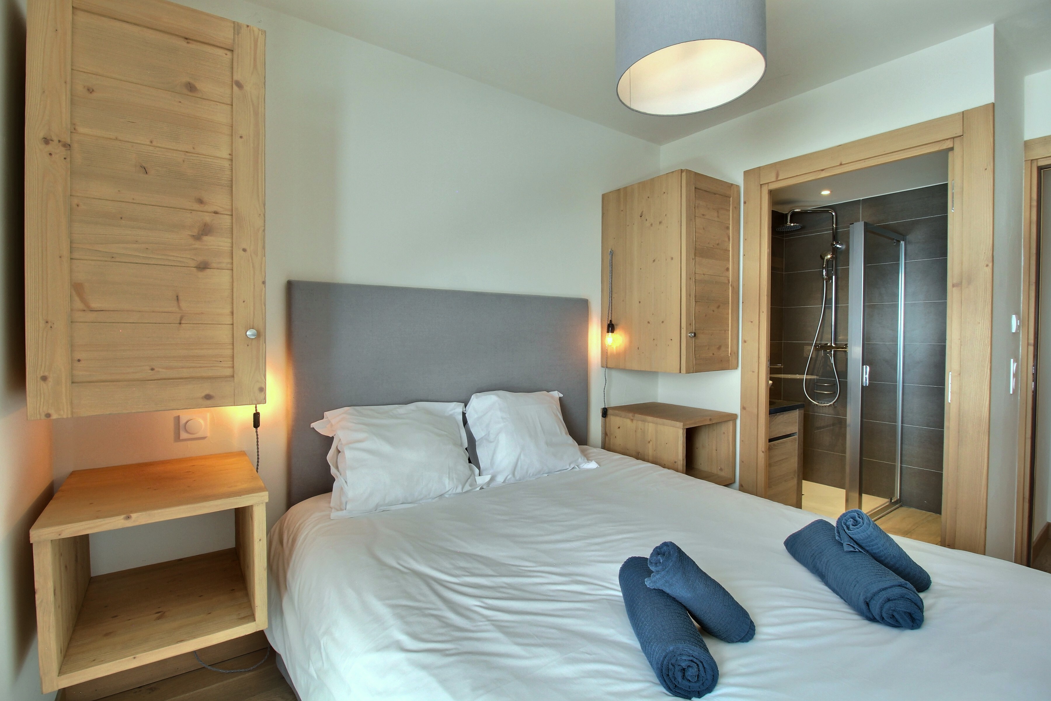 - D'une première chambre avec un lit double, placards de rangement et salle de douche avec sèche-serviettes et rangements ;